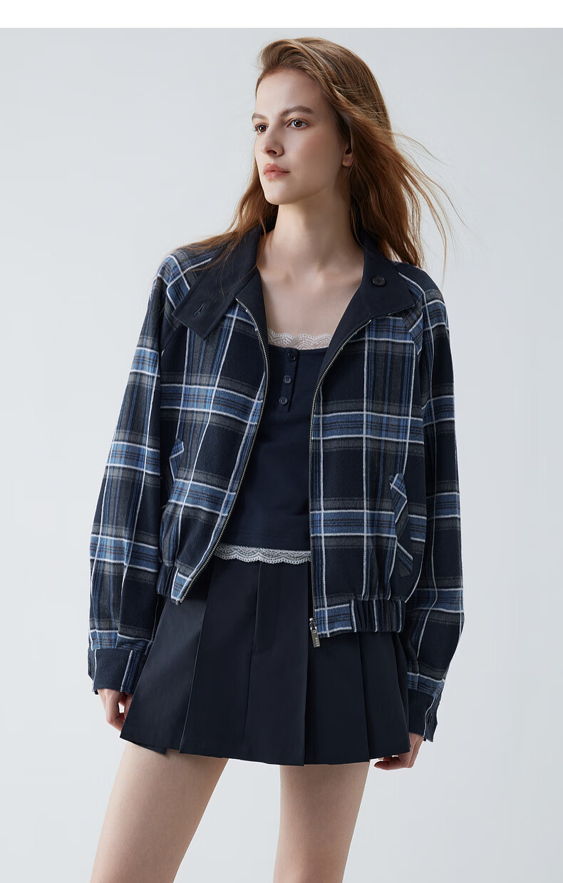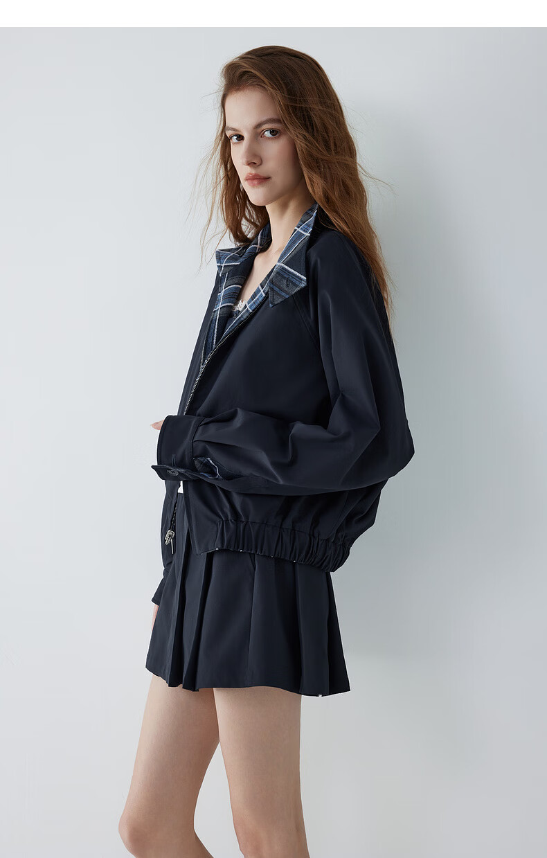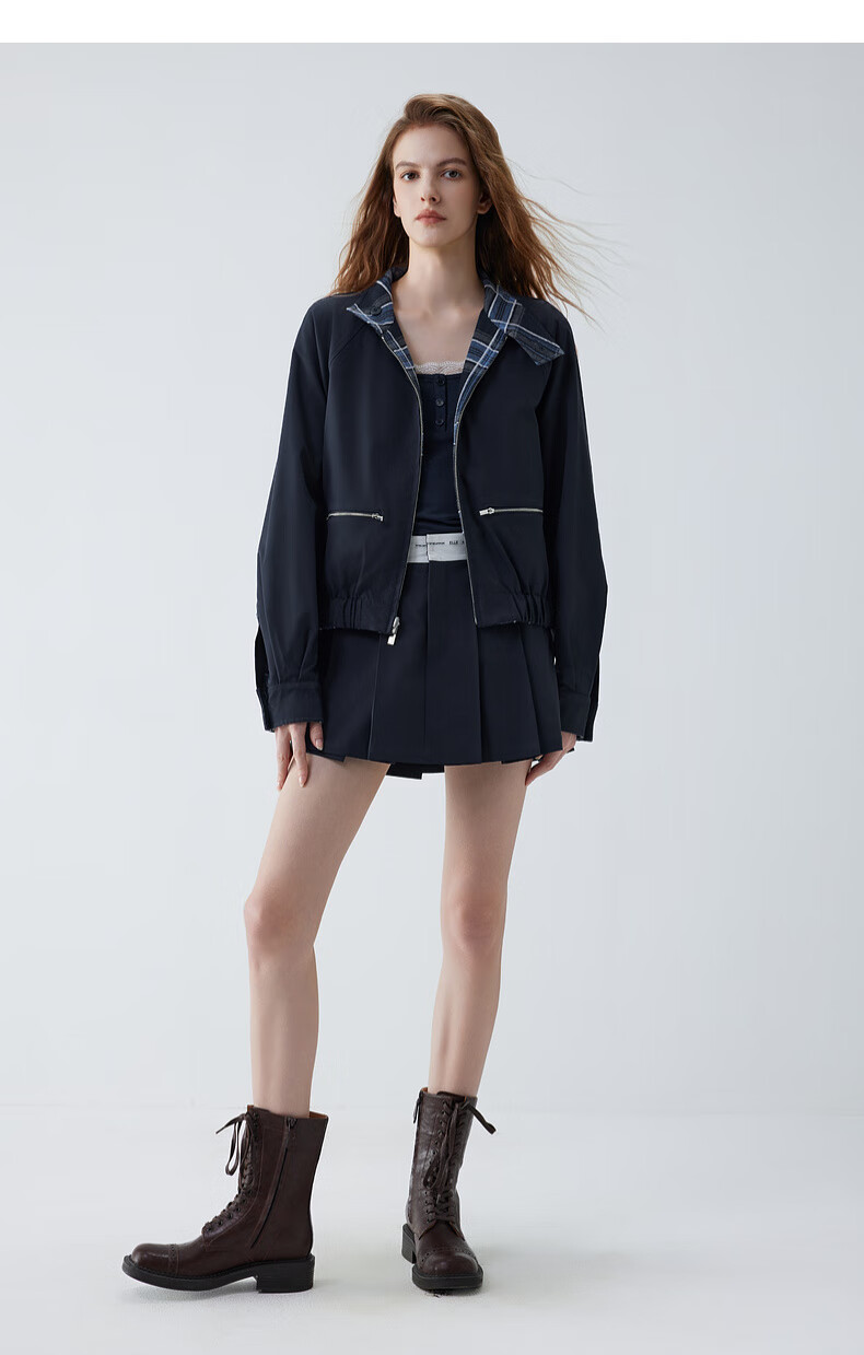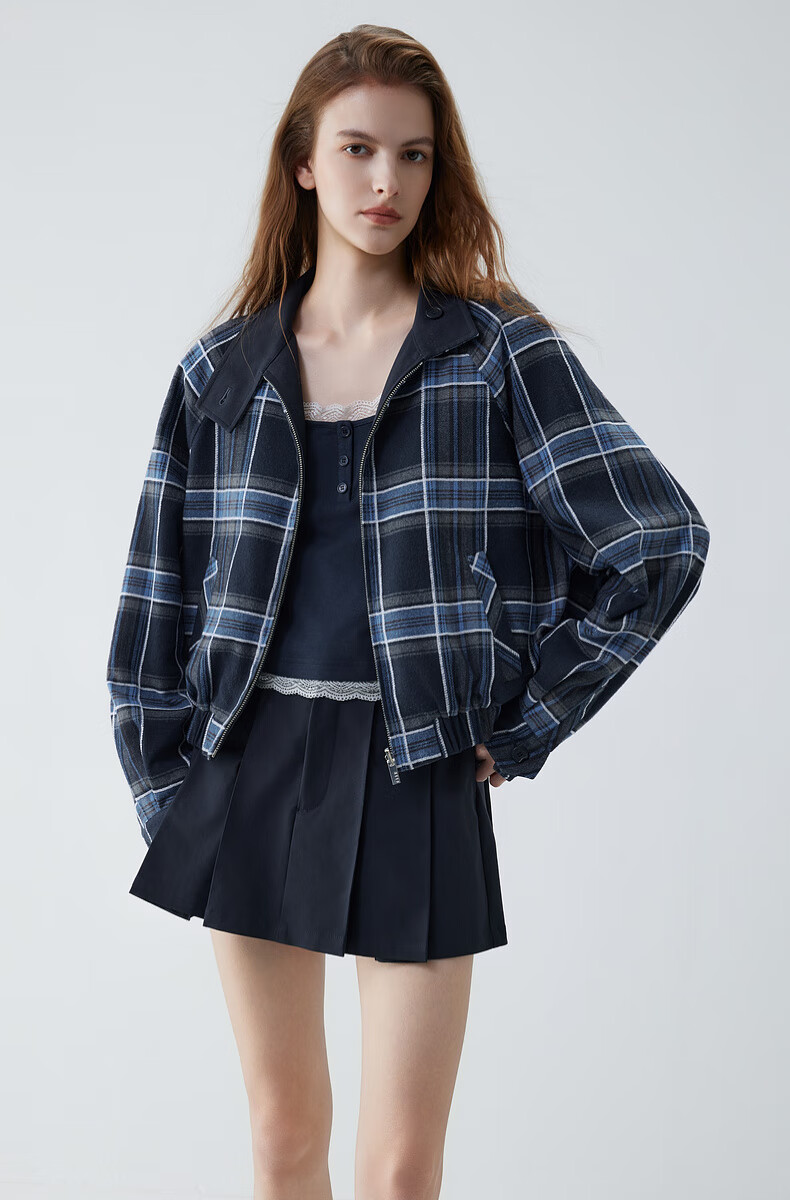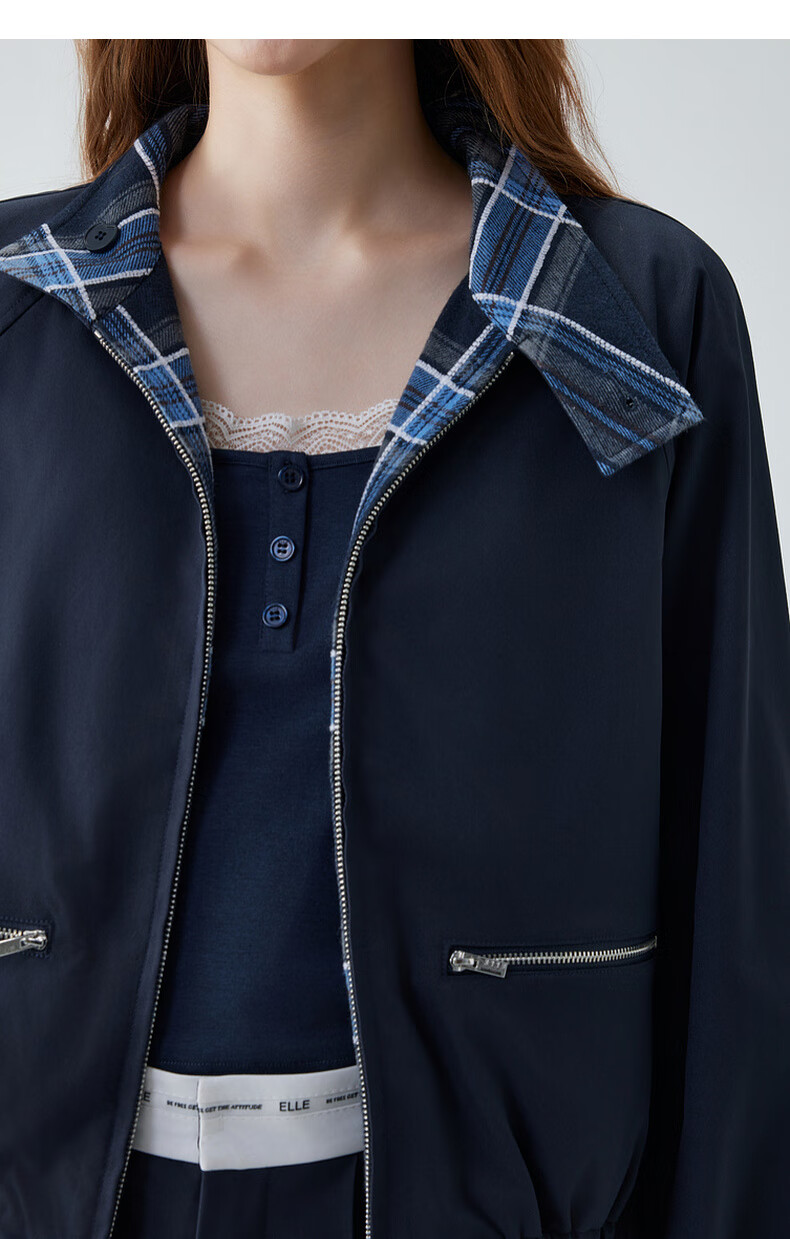 ELLE Navy Blue Plaid Reversible Short Jacket Women's 2025 Autumn New Casual Loose Design Top Navy S