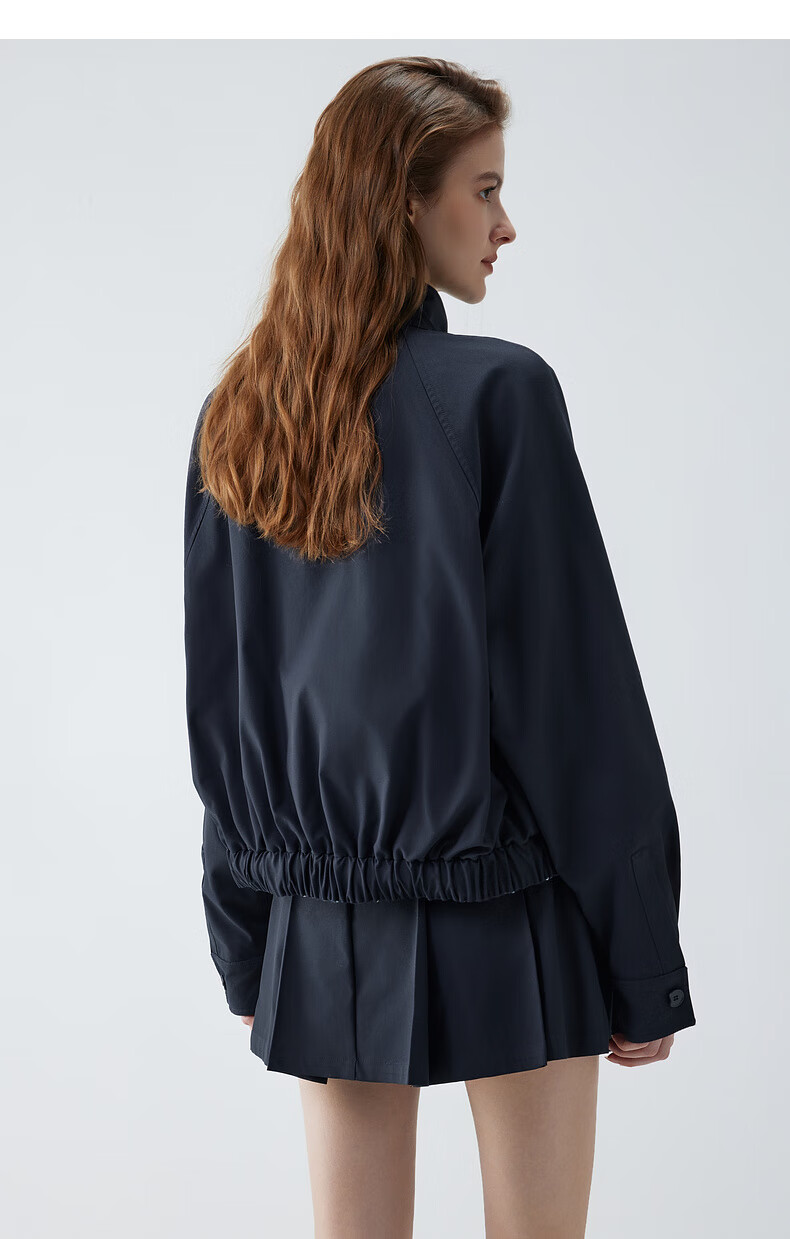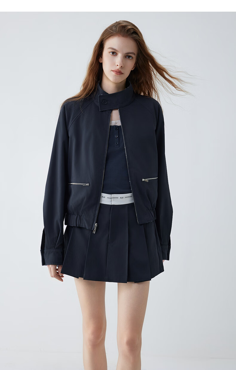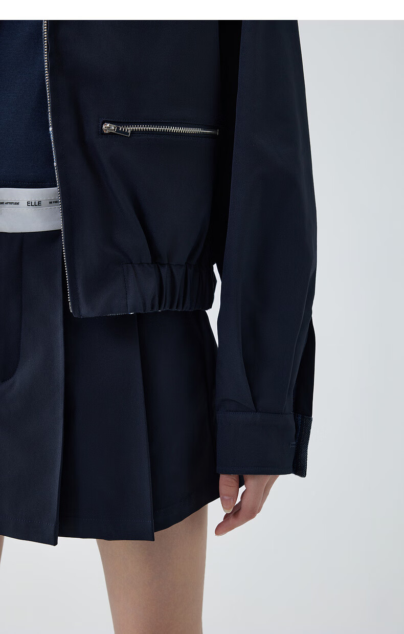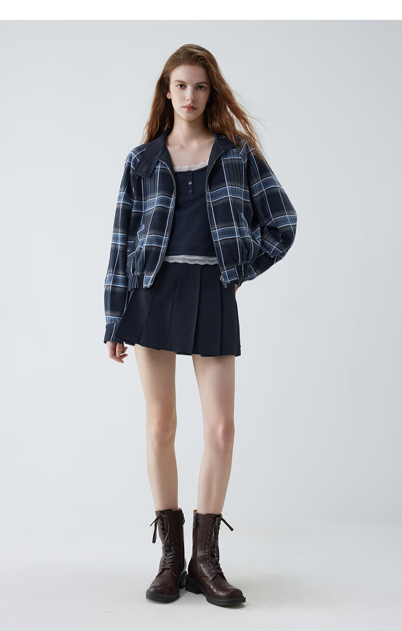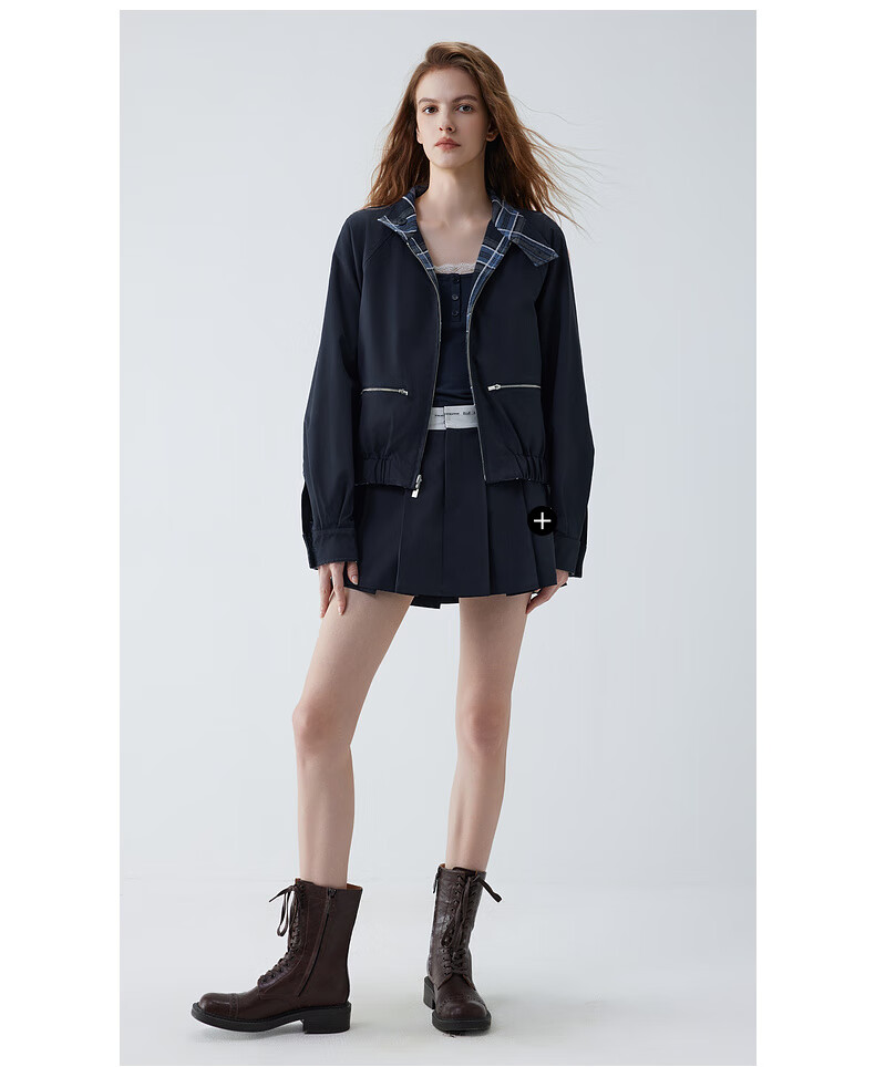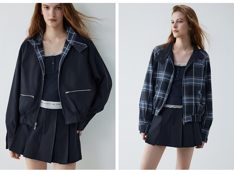 ELLE Navy Blue Plaid Reversible Short Jacket Women's 2025 Autumn New Casual Loose Design Top Navy S
