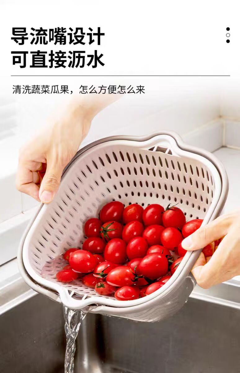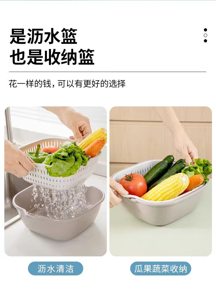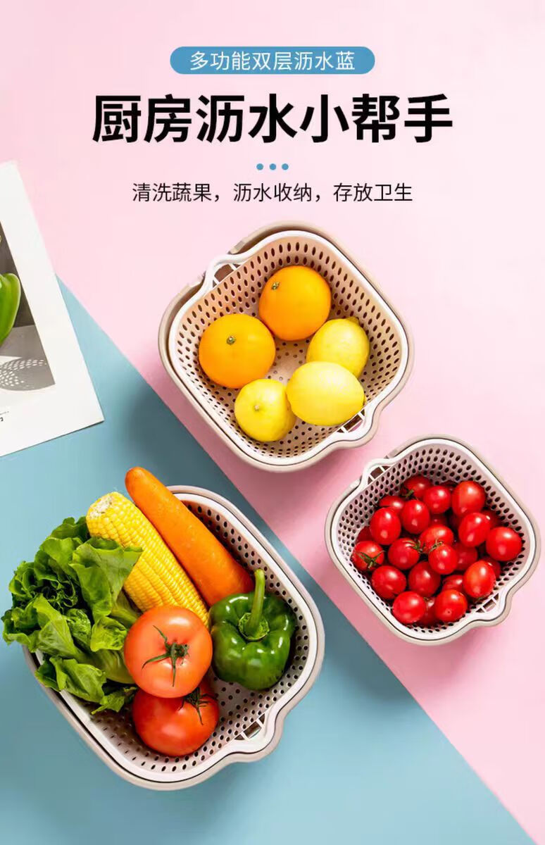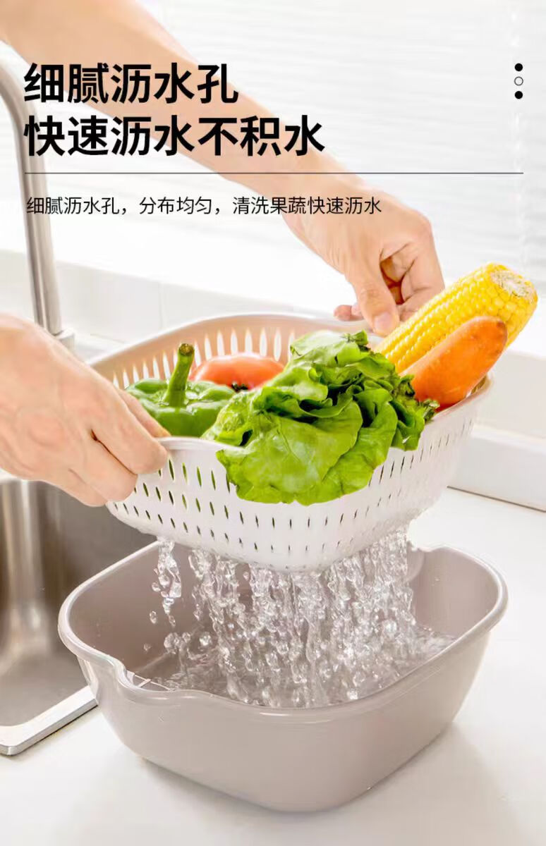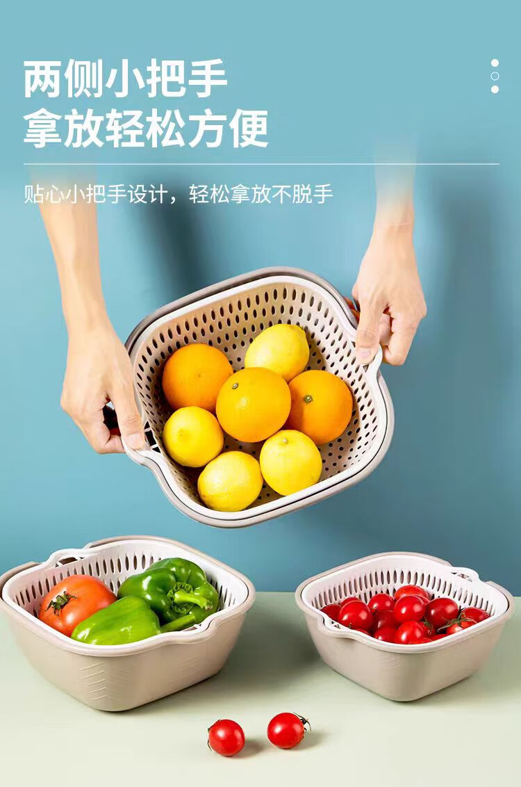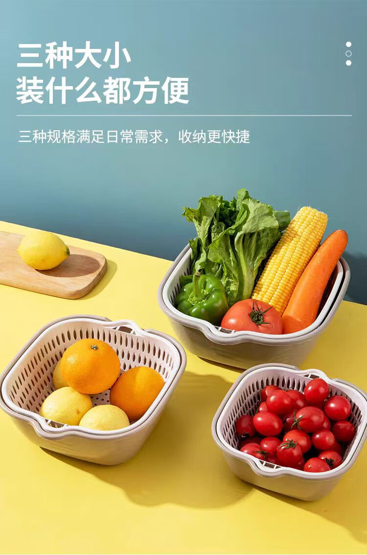 Double-layer drain basket, blue vegetable sink, household kitchen multi-functional large-capacity plastic fruit and vegetable bowl and chopsticks storage basin, large + medium + small 6-piece set