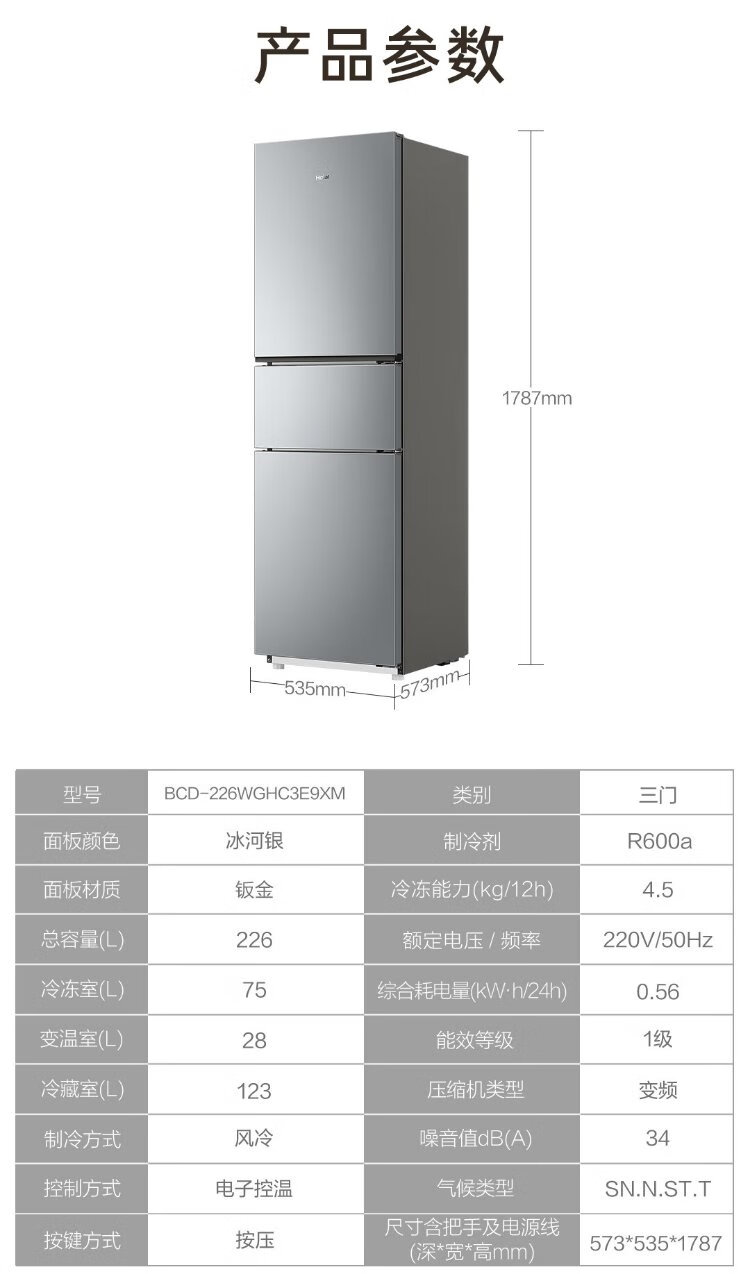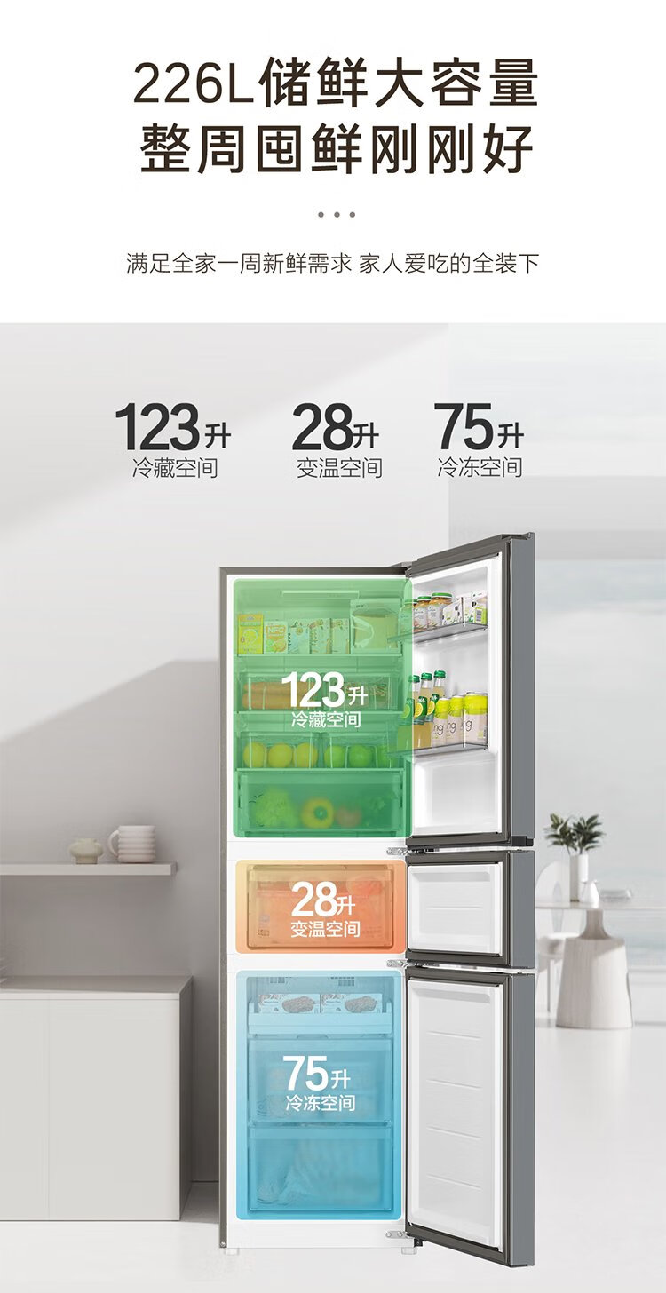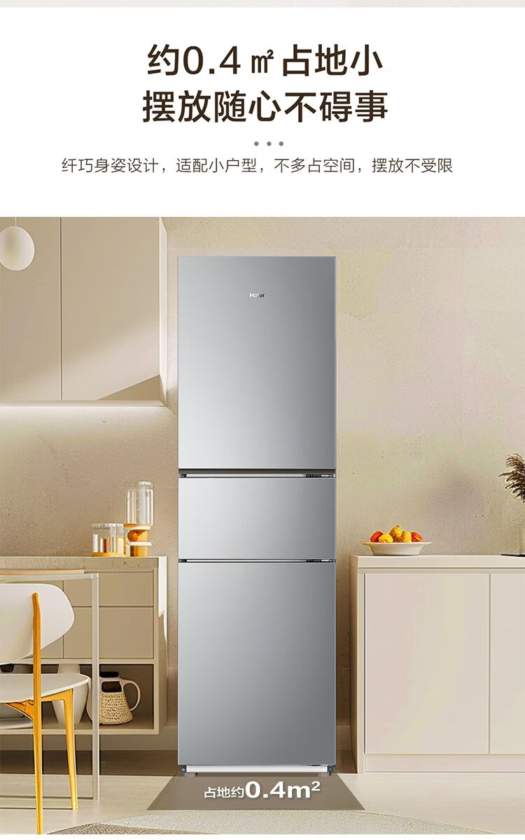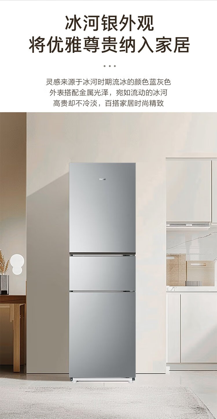 Haier refrigerator 226 liters three-door multi-door refrigerator ultra-thin first-class energy efficiency air-cooled frost-free -30 cryogenic quick-freezing frequency conversion energy-saving household small capacity refrigerator 226 liters first-class energy saving + food-grade safety material + healthy black gold purification