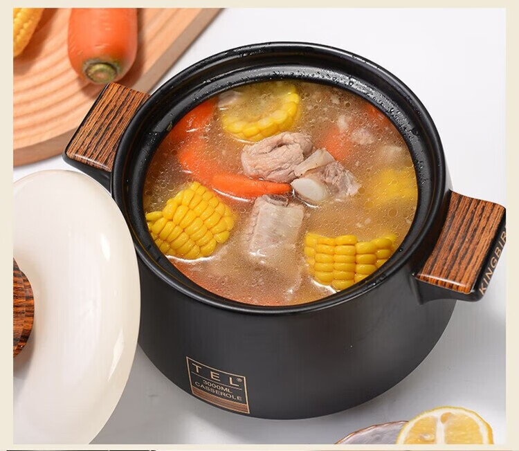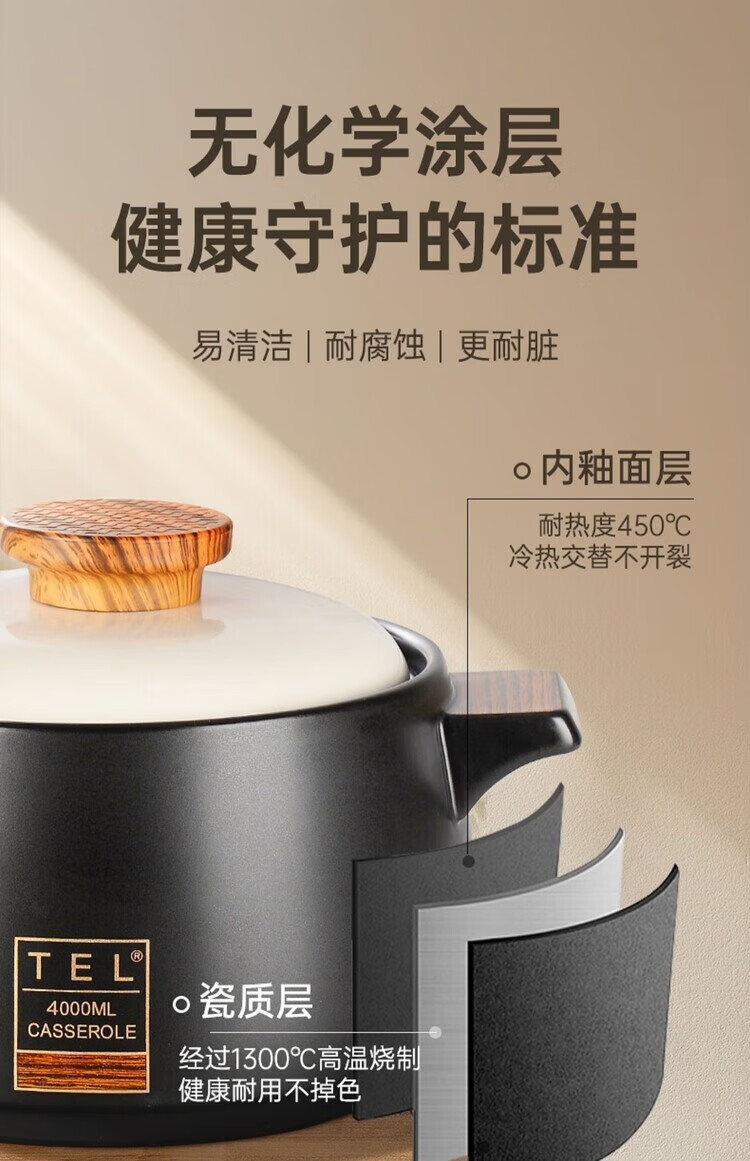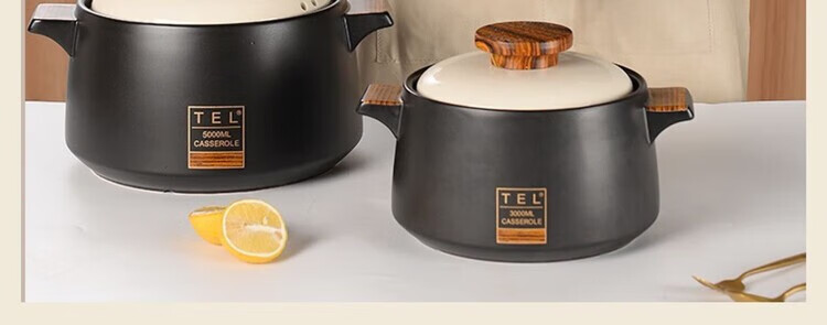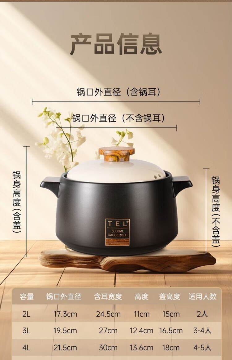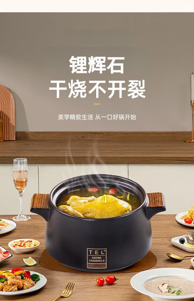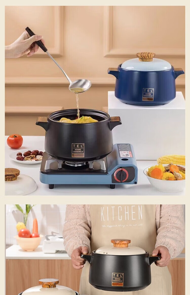 QCSK German casserole soup gas stove household high-temperature gas stove with large-capacity ceramic stew pot that does not crack when dried, wood edge black (3~6 people) double crack resistance 4L