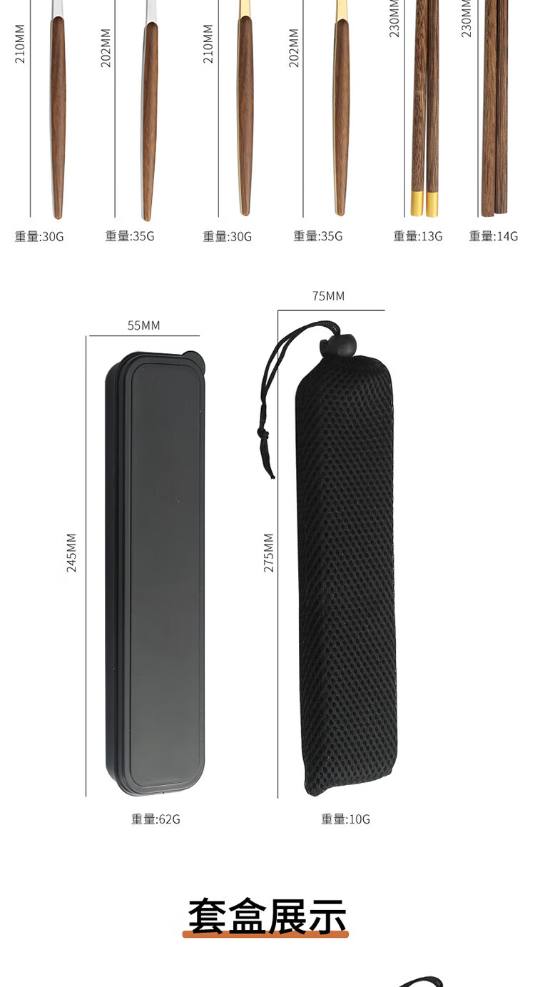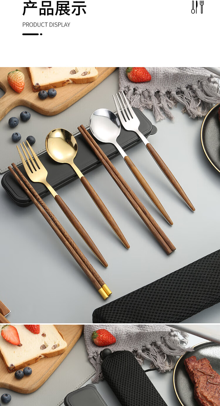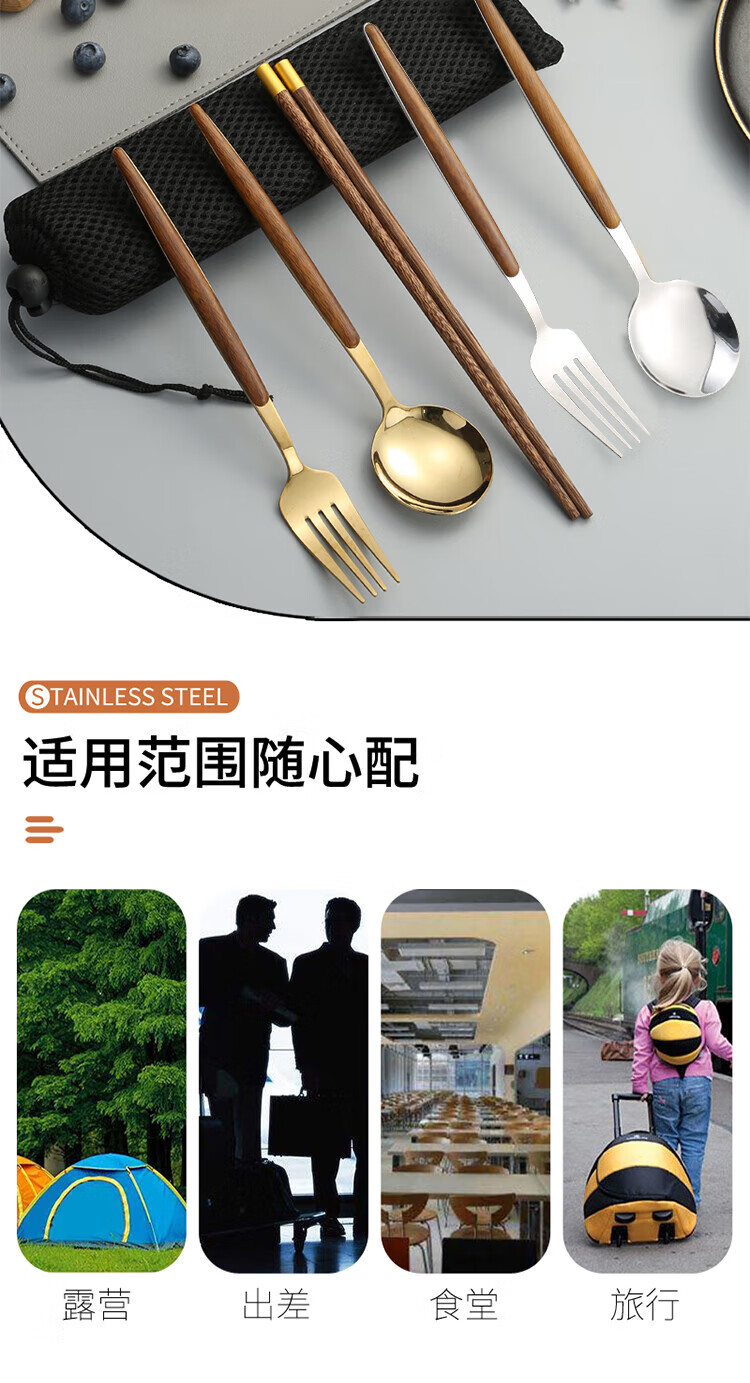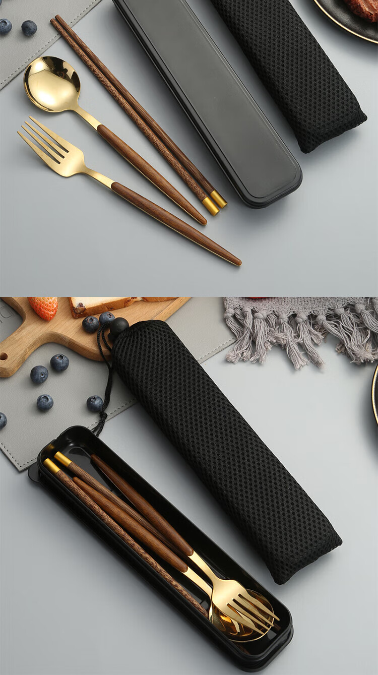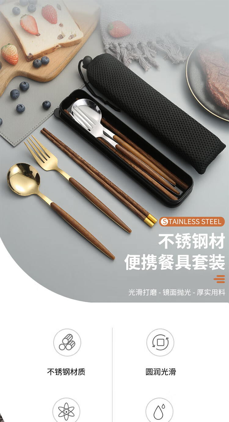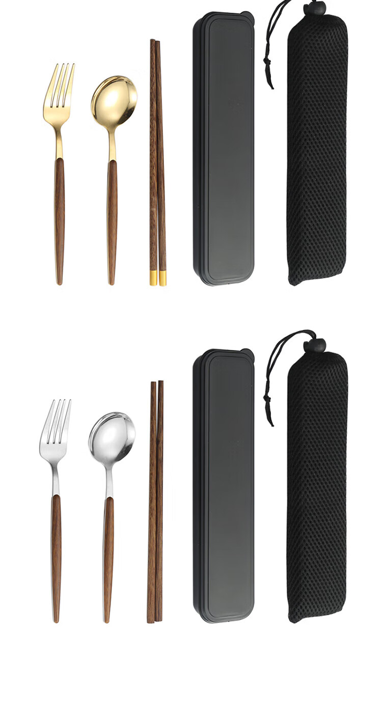 MaiYaYa portable tableware set stainless steel wooden chopsticks spoon fork three-piece set student children's tableware travel box portable tableware-silver chopsticks-fork-spoon-box