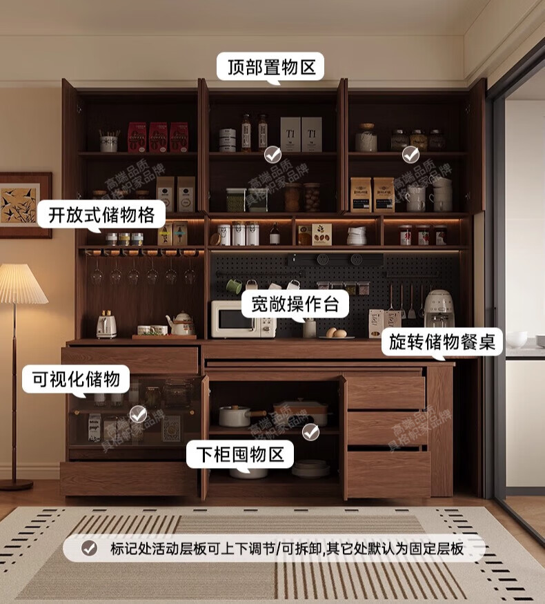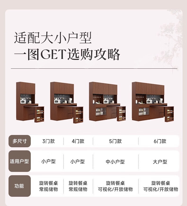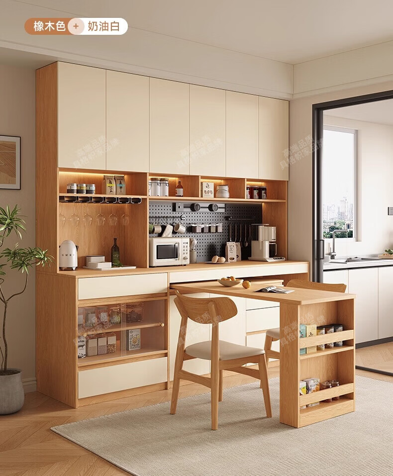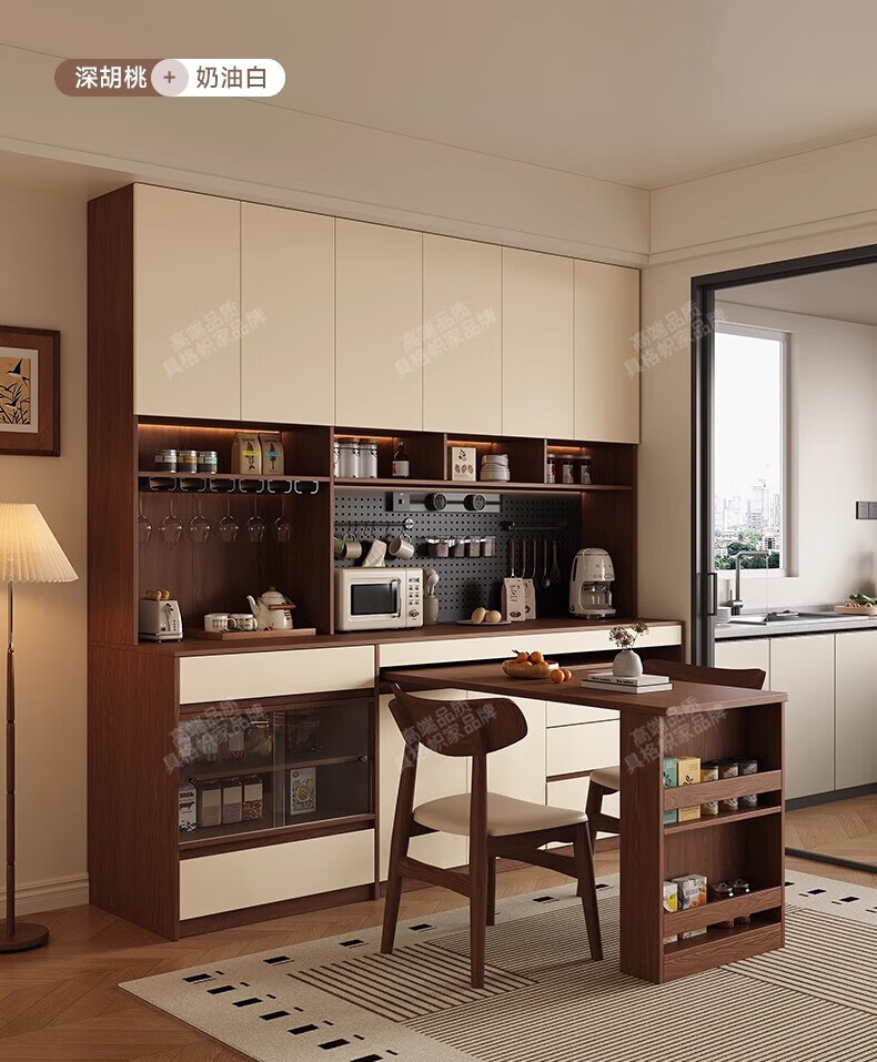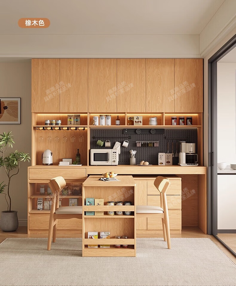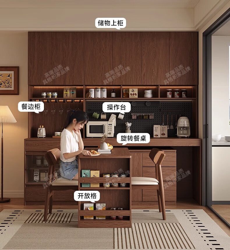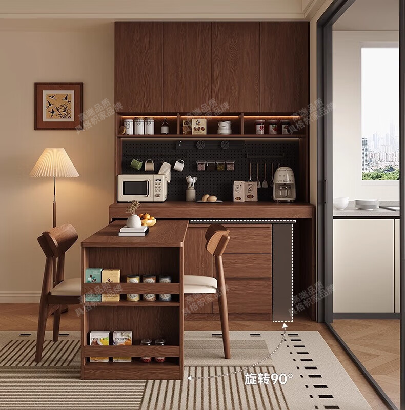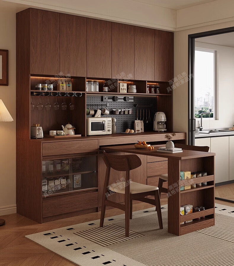 Customized solid wood sideboard by Gogezhijia, retractable built-in dining table, retractable wall-mounted integrated mid-century style living room tea storage cabinet 2.2*2.0 (six doors) + 1.3m dining table, free perforated board and double-hole track socket by default