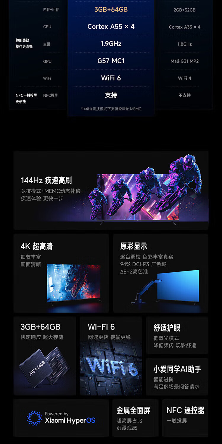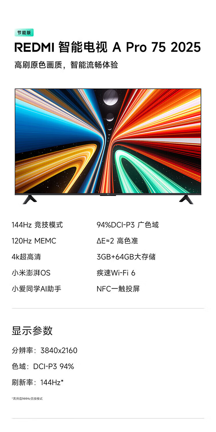 Xiaomi (MI) TV 75-inch 144Hz high refresh rate 3+64GB large storage REDMI A Pro75 2025 energy-saving version 4K ultra-high definition smart flat-panel TV first-class energy efficiency 75-inch worry-free package installation A Pro75+ door-to-door installation