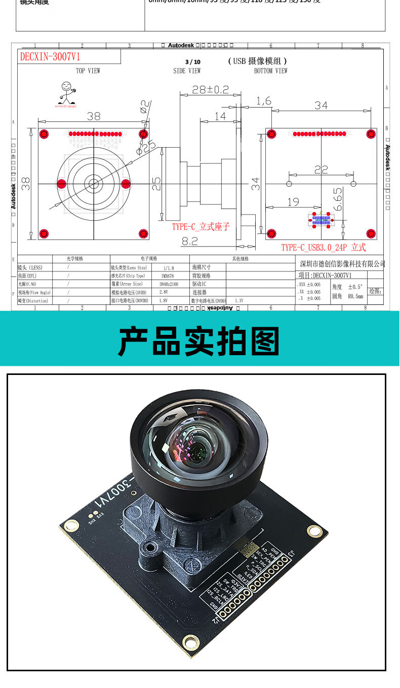USB3.0 camera 8 million 4K HD 60 frames IMX678 industrial camera module industrial computer Android device UVC protocol 123 degrees micro distortion
