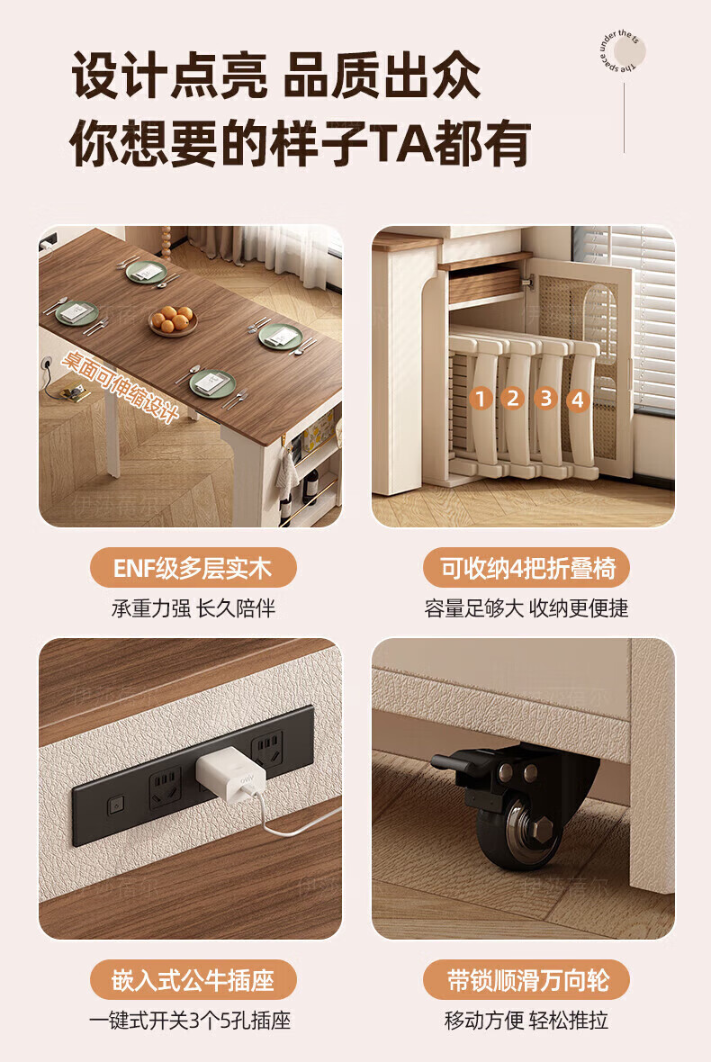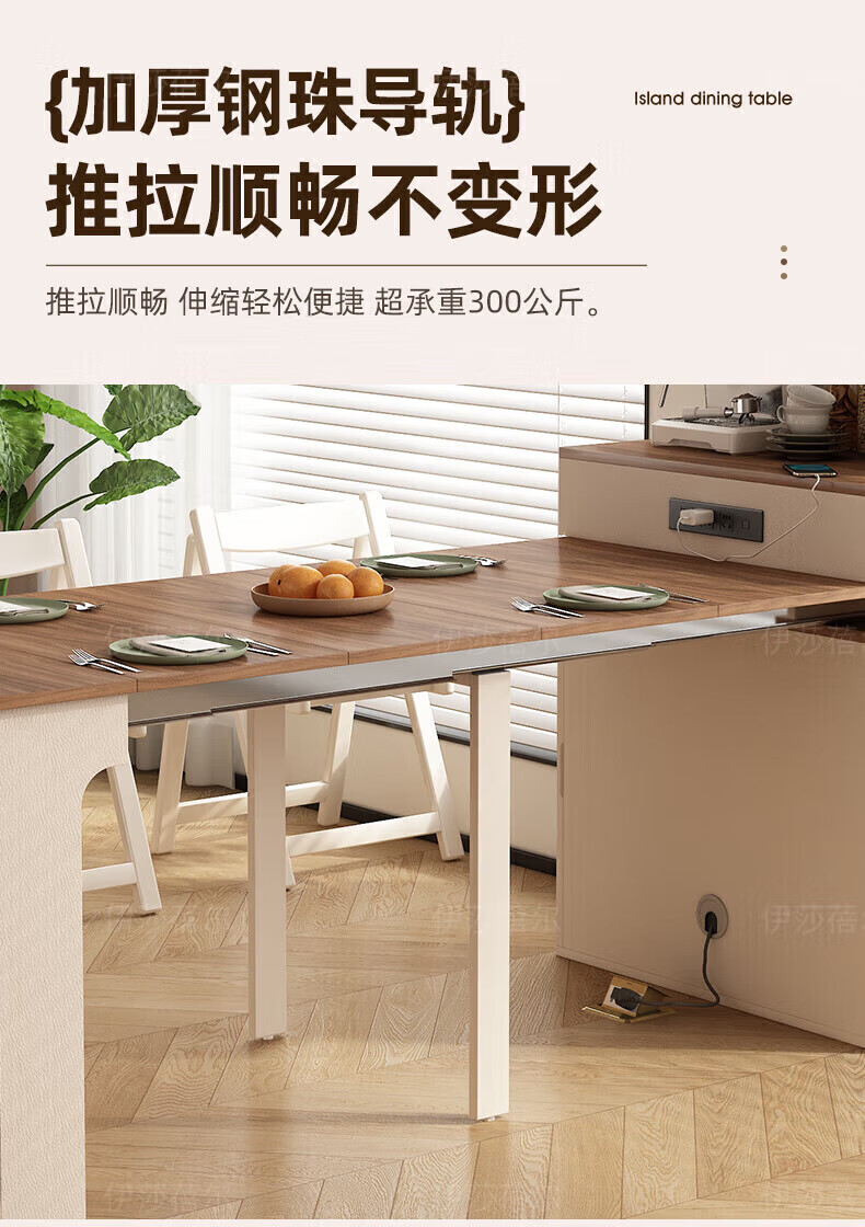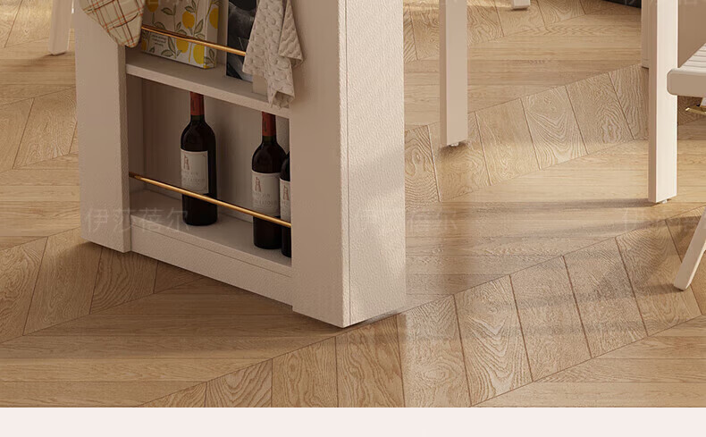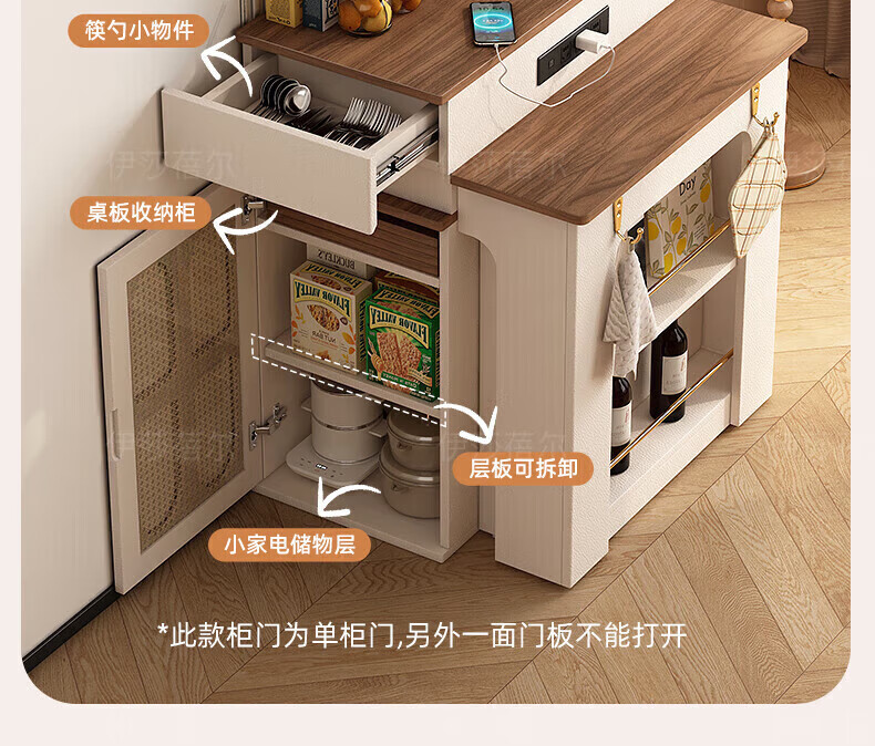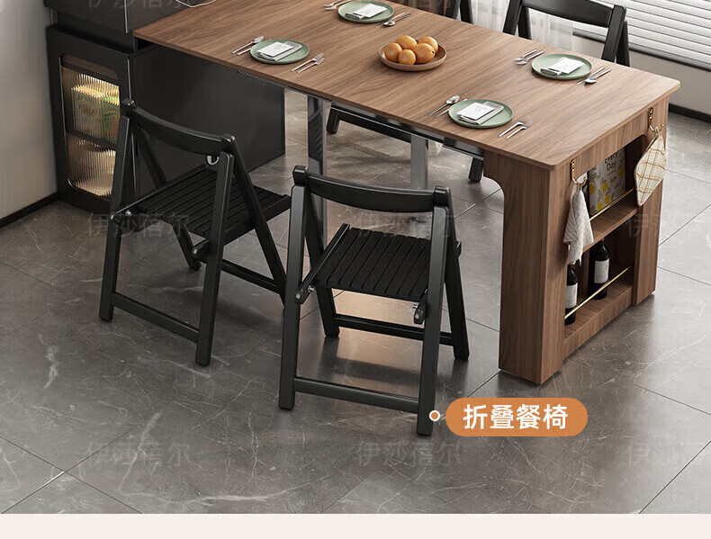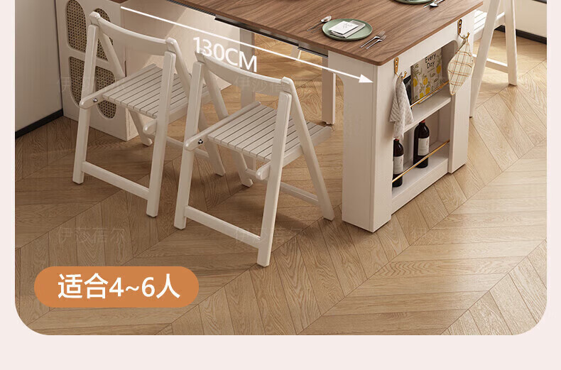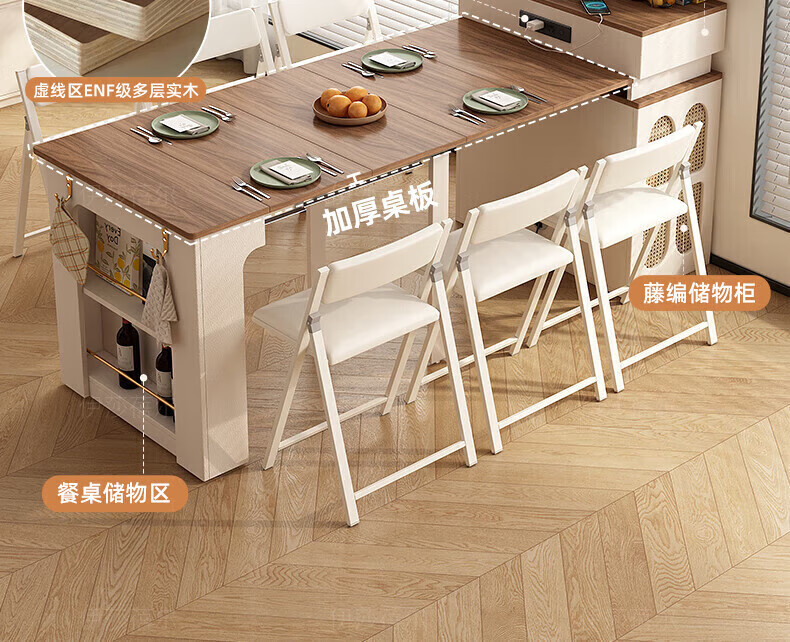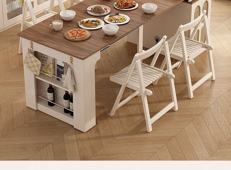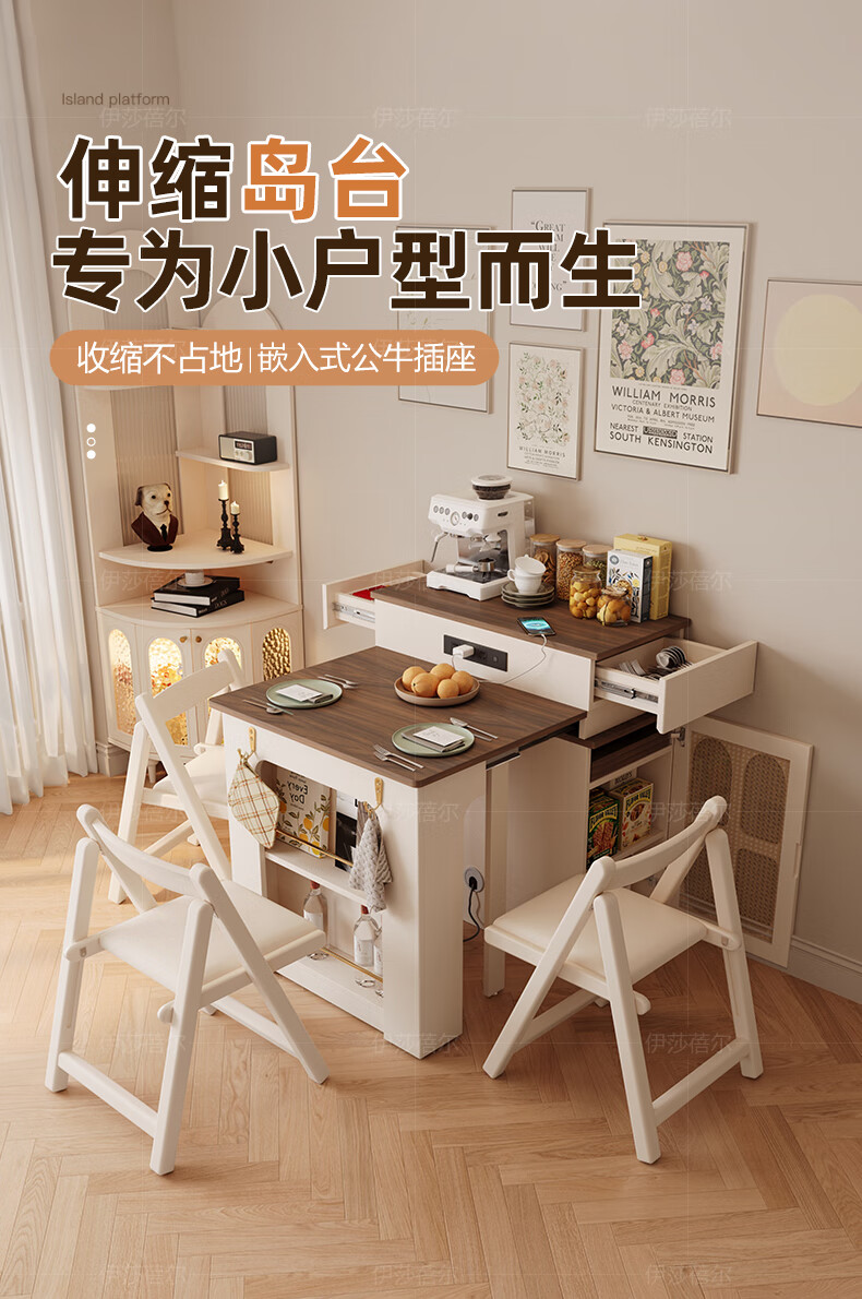 Isabelle dining table, household retractable sideboard, integrated small-sized island storage cabinet, storage cabinet, solid wood foldable dining table, one table and four chairs, removable storage cabinet shelf, latch-fixed table board