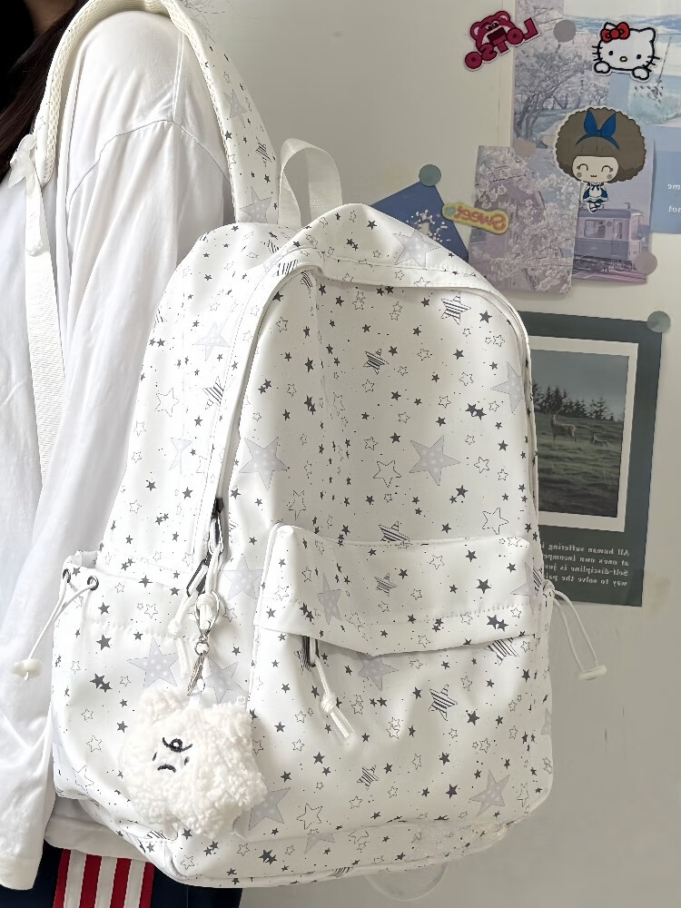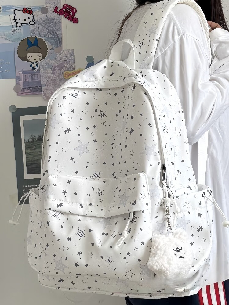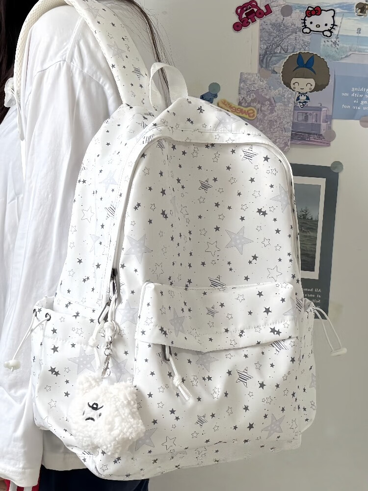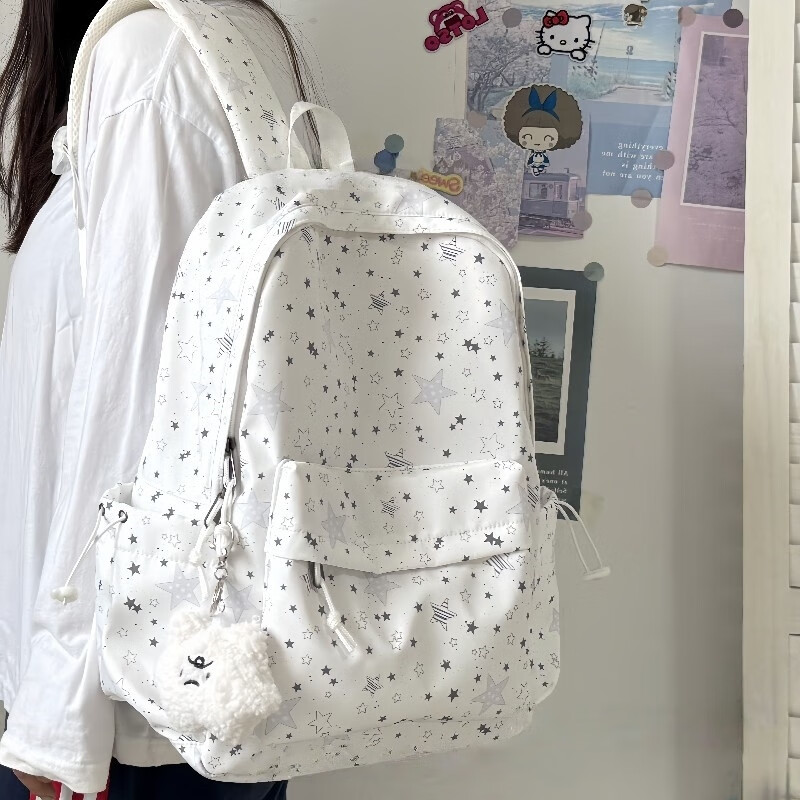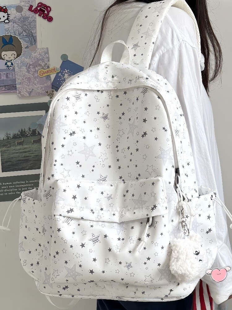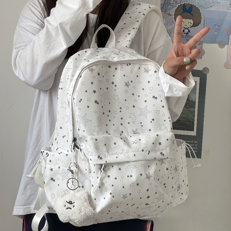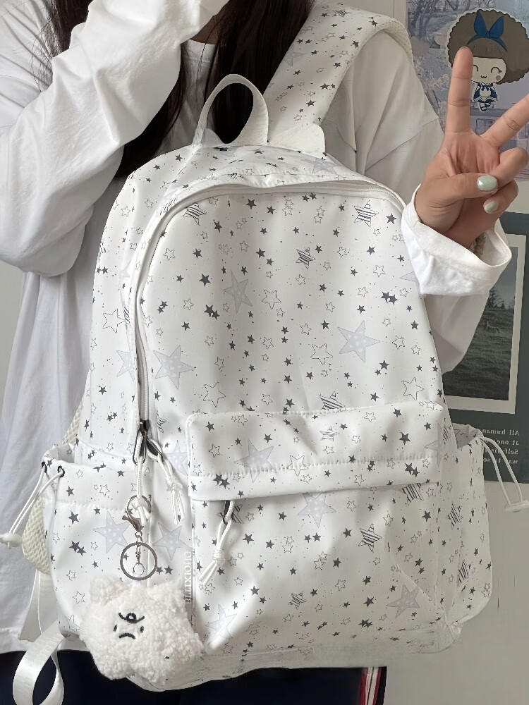 Zinke schoolbag, junior high school girl, high-looking star print, Korean style niche ins backpack, high school student computer bag, white (with fat cloud pendant)