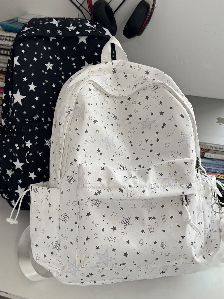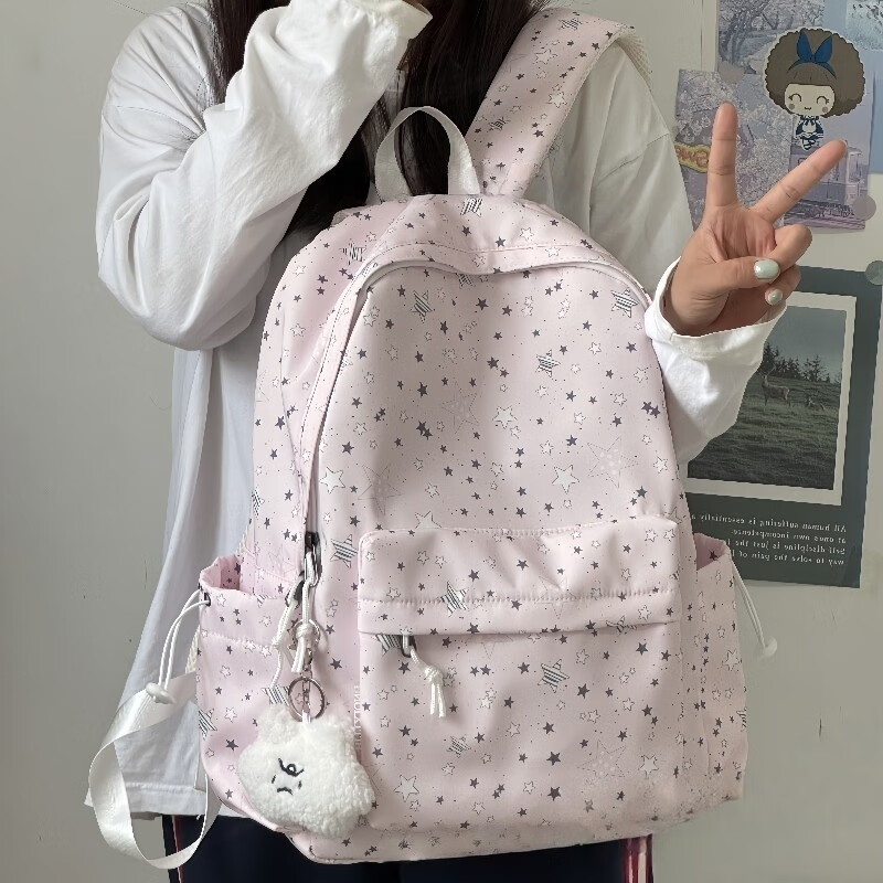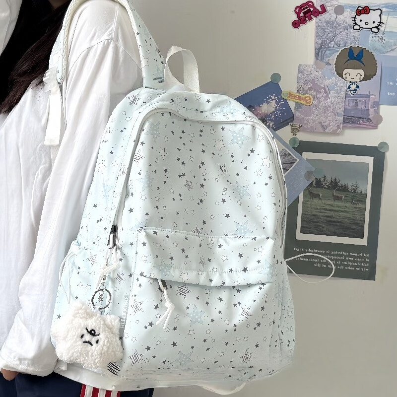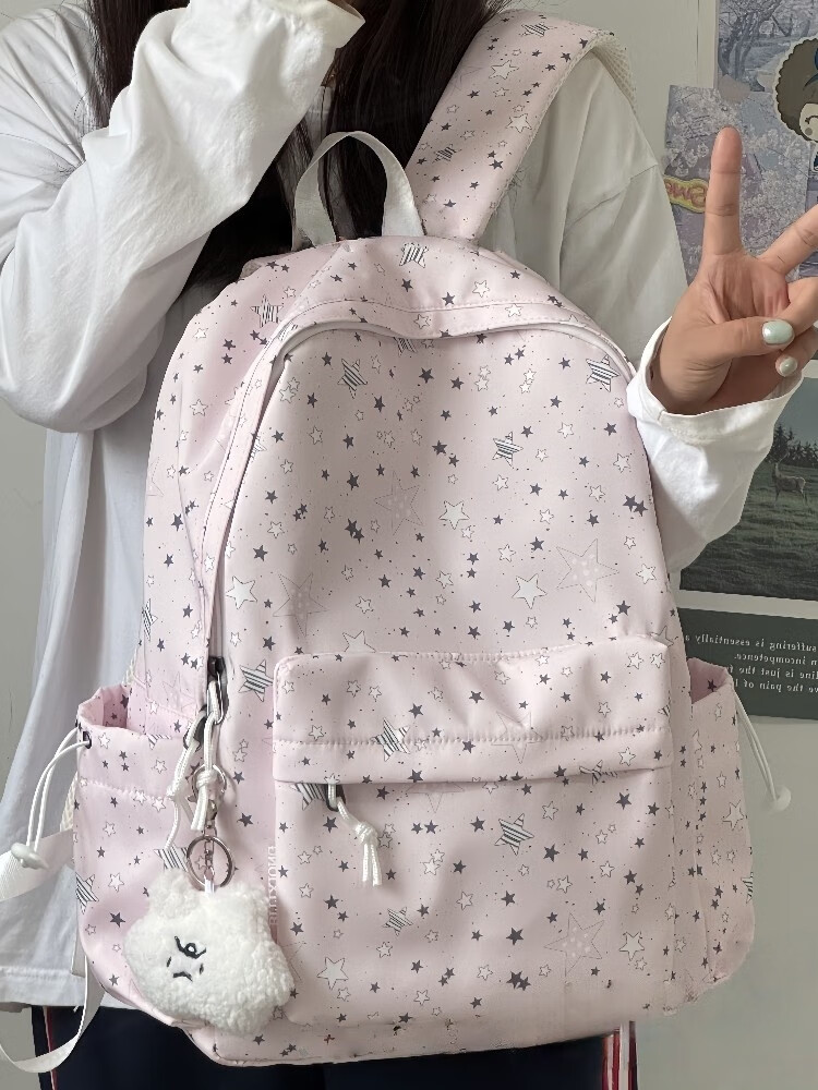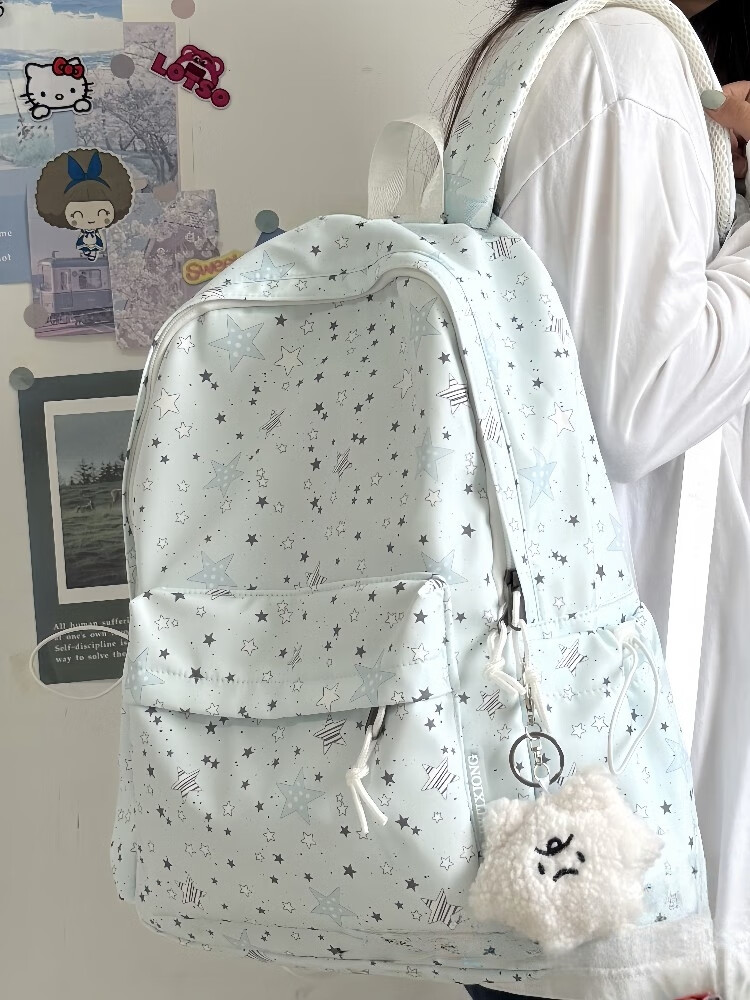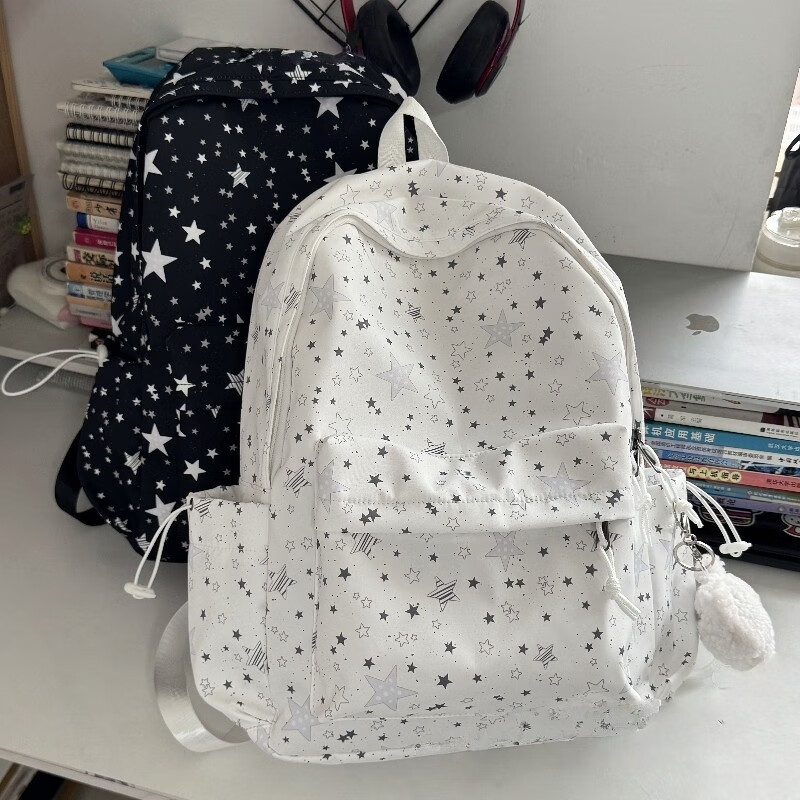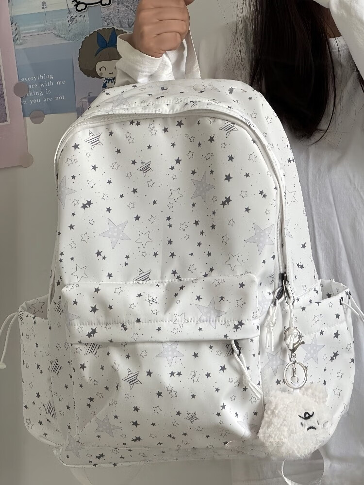 Zinke schoolbag, junior high school girl, high-looking star print, Korean style niche ins backpack, high school student computer bag, white (with fat cloud pendant)