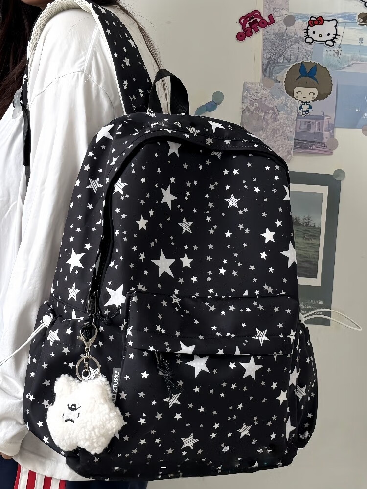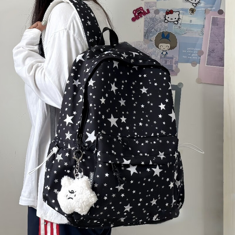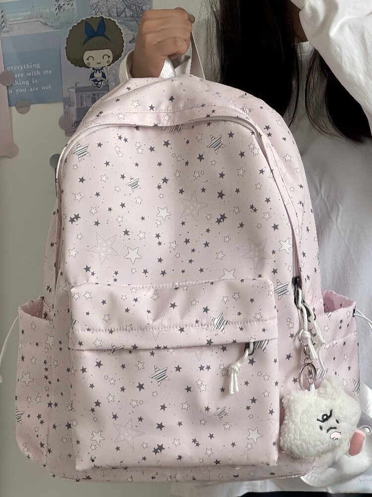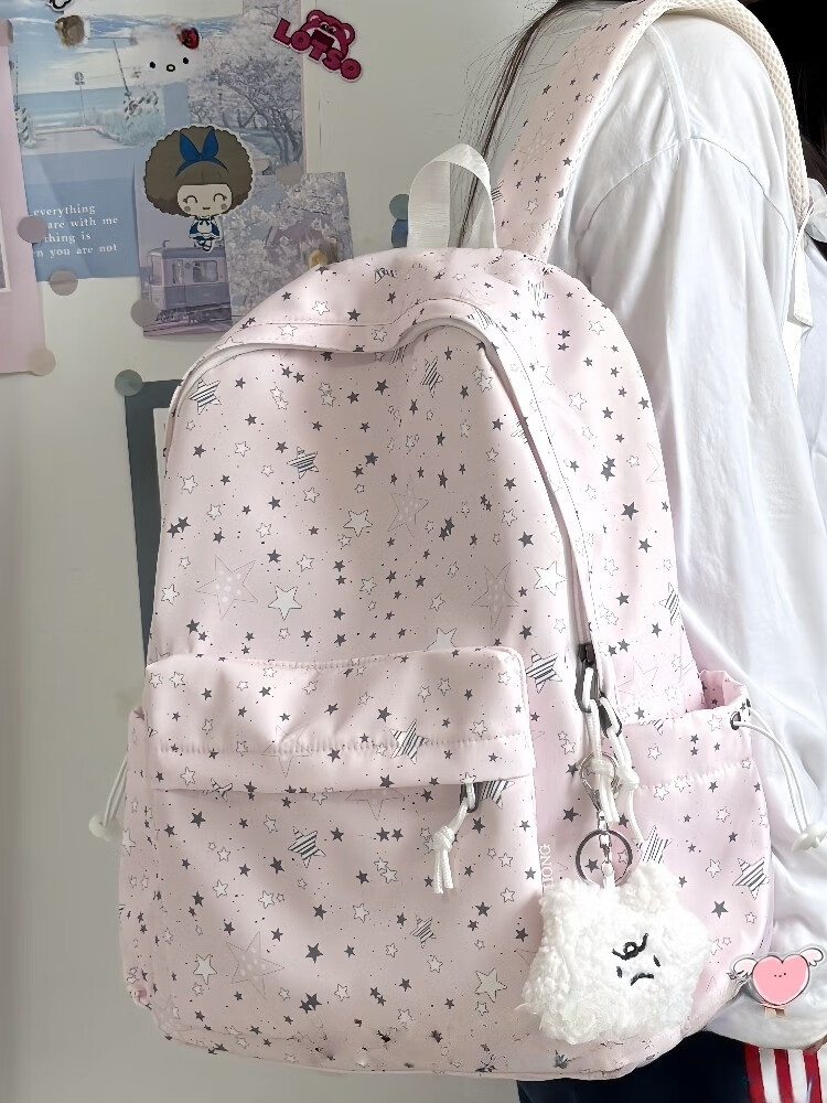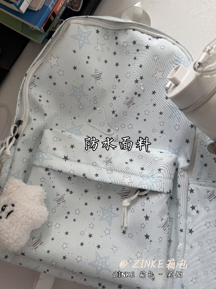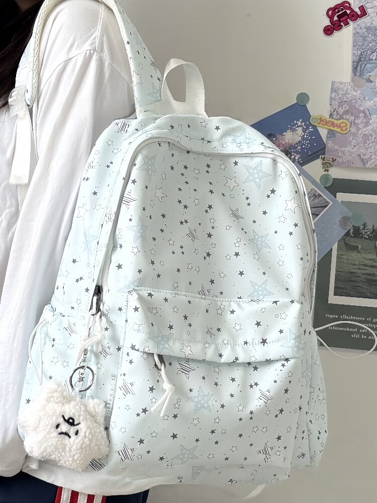 Zinke schoolbag, junior high school girl, high-looking star print, Korean style niche ins backpack, high school student computer bag, white (with fat cloud pendant)