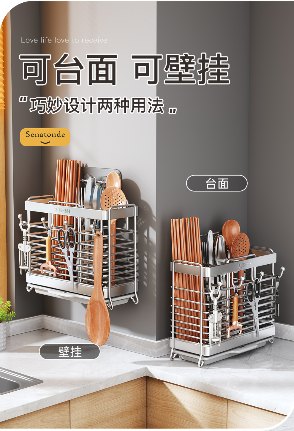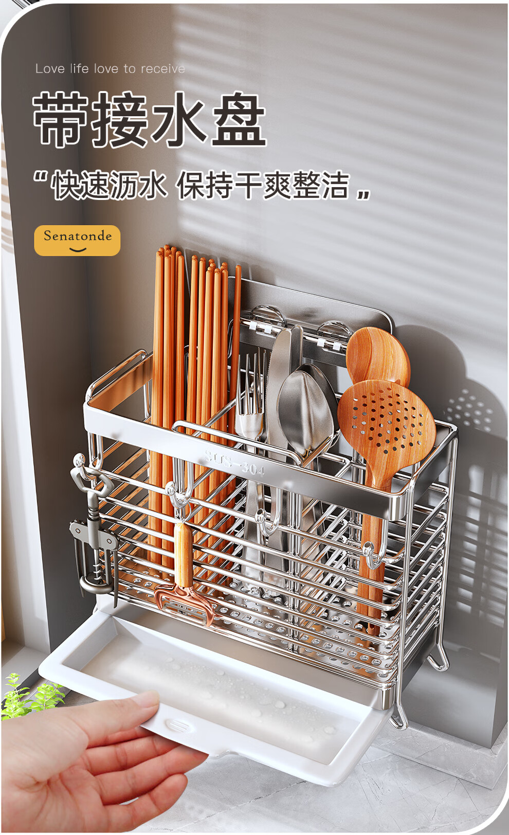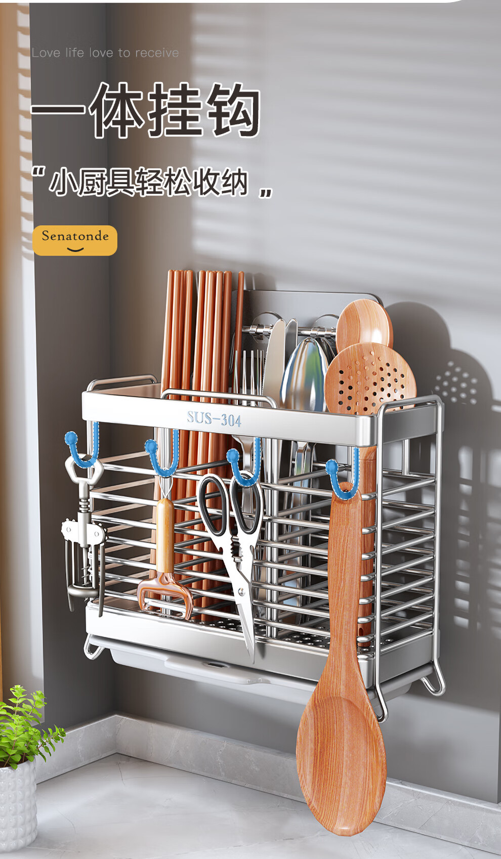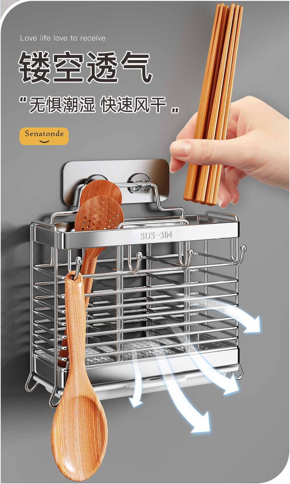 Shuaishi kitchen storage rack 304 stainless steel chopstick cage chopstick barrel nail-free punch-free wall-mounted chopstick holder drain knife holder 304 stainless steel type A-4 hooks