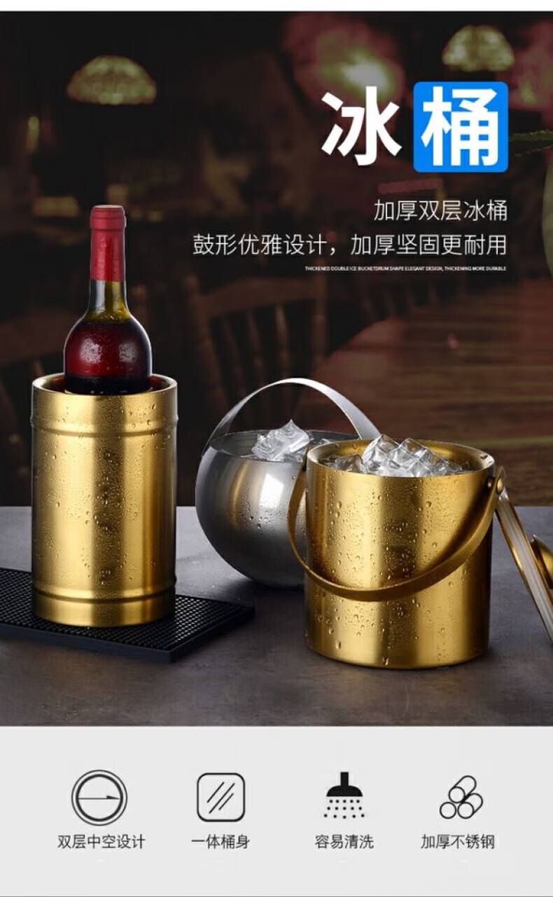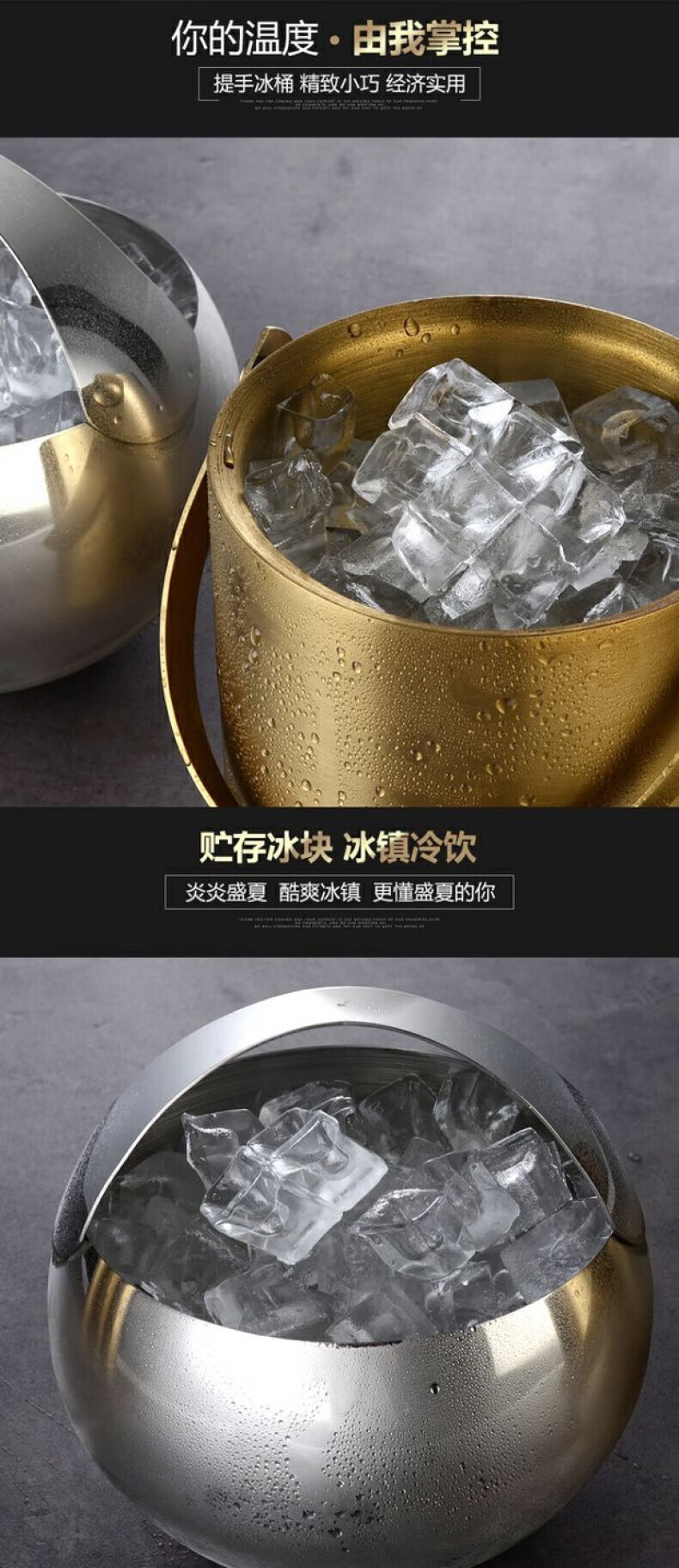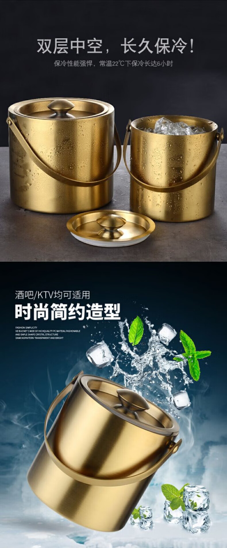 Mangong German quality ice bucket filled with ice cubes for bar KTV stainless steel ice bucket double layer with lid insulated ice bucket champagne red 3L portable ice bucket rich gold + ice clip
