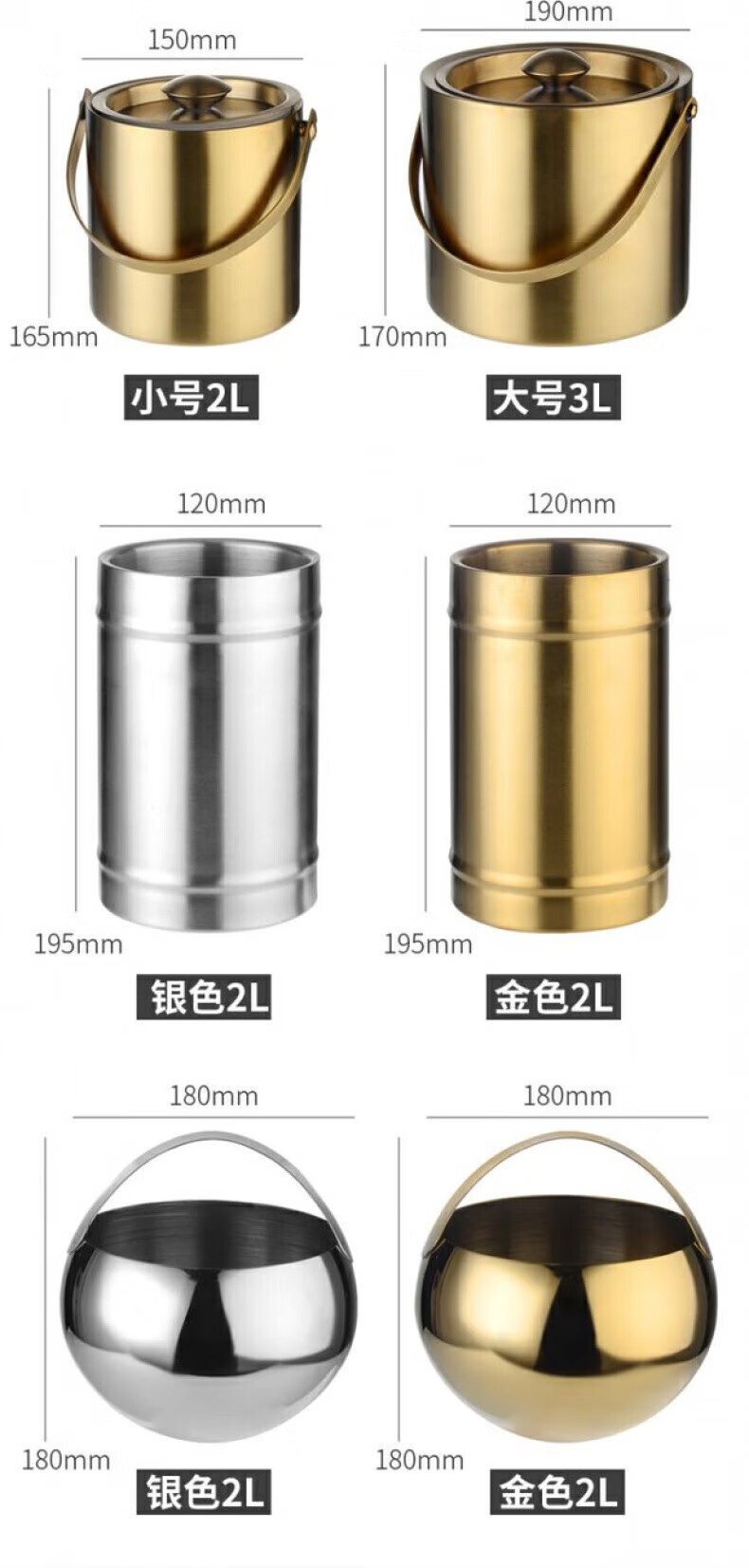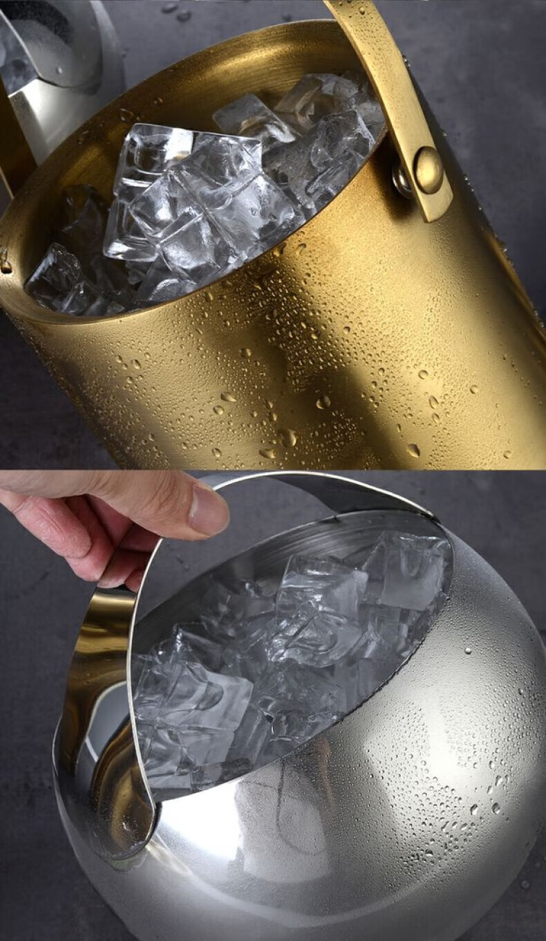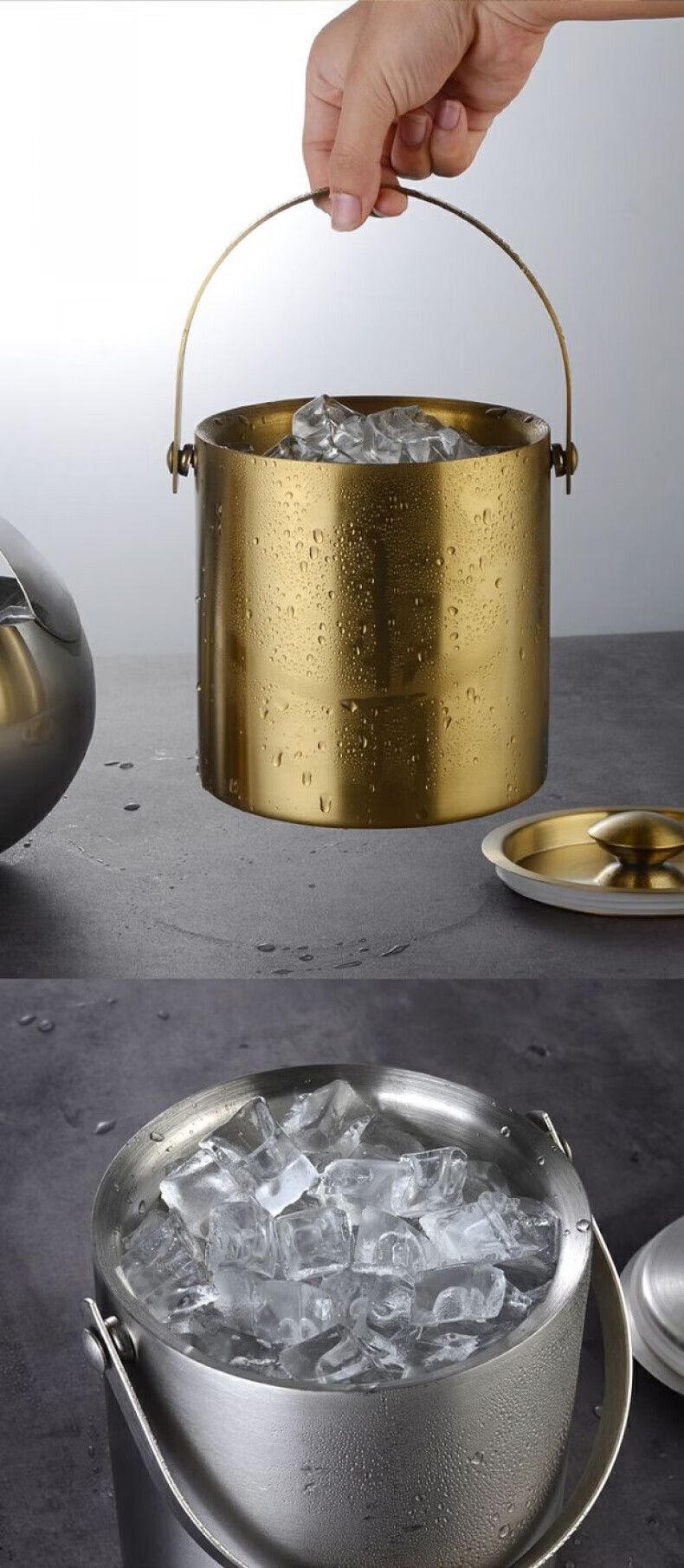 Mangong German quality ice bucket filled with ice cubes for bar KTV stainless steel ice bucket double layer with lid insulated ice bucket champagne red 3L portable ice bucket rich gold + ice clip
