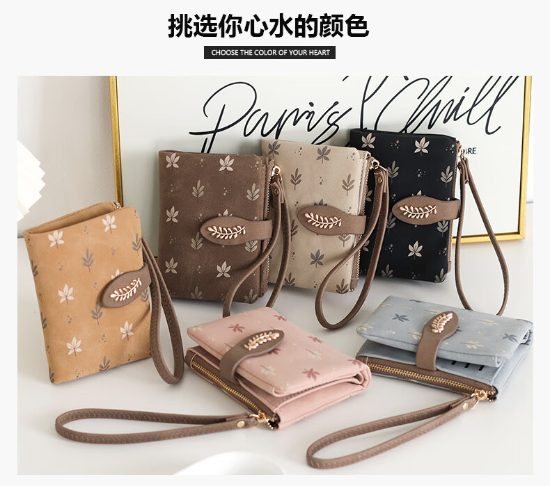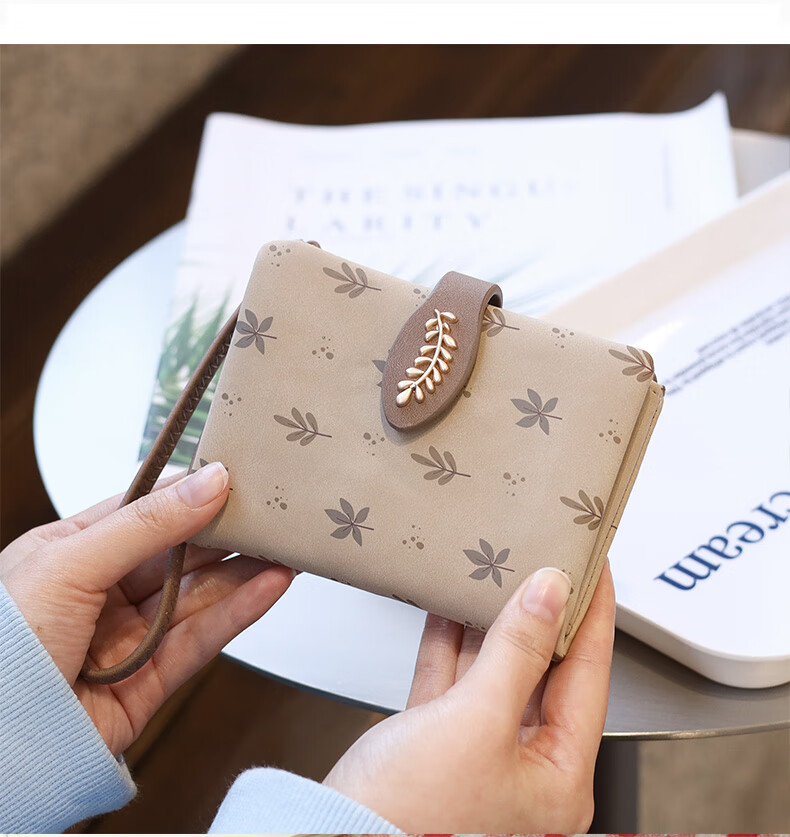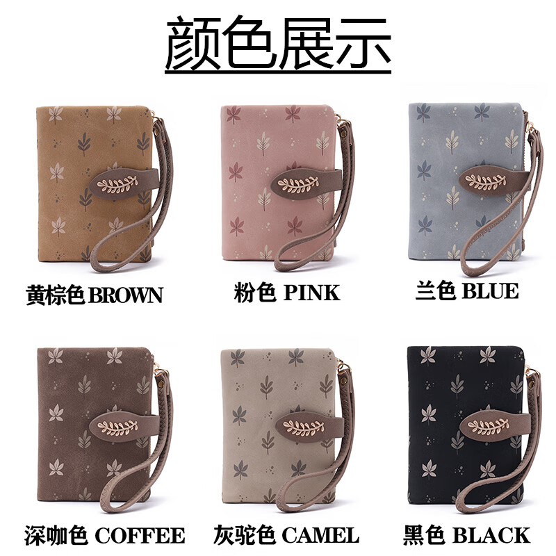 Casa-kupsCK Korean style small fresh leaf print short women's wallet hand strap multi-card slot student coin purse frosted pink
