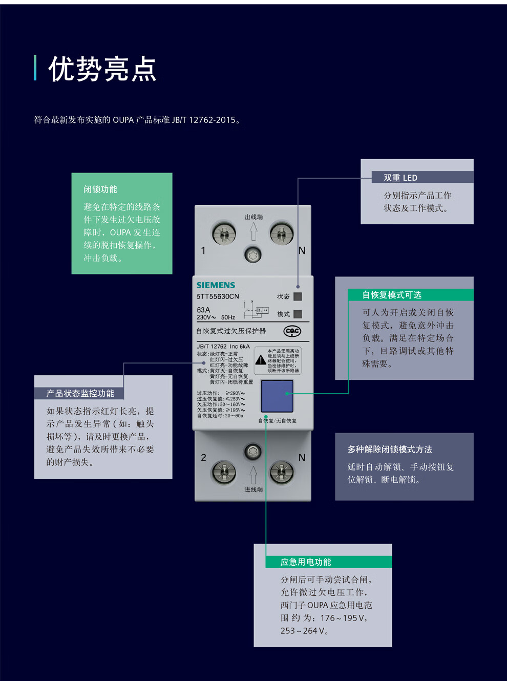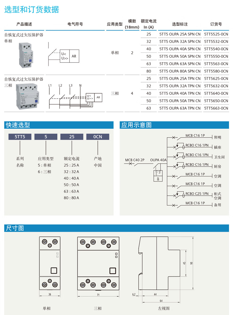 Siemens over and under voltage protector 5TT series 3P 1P 63A 80A 32A self-restoring over and under voltage protector 2P 20A 2NO 5TT58000 contactor