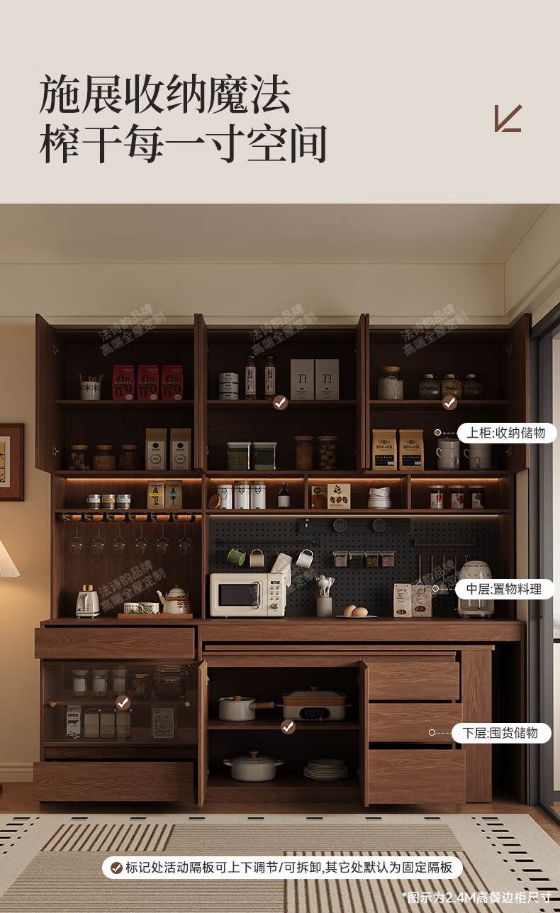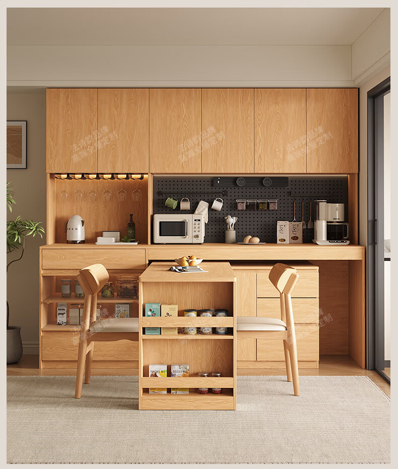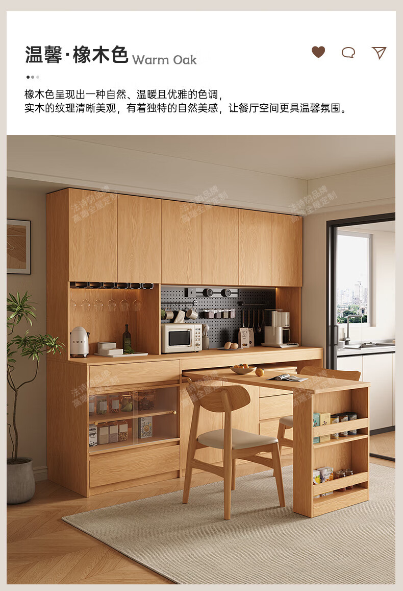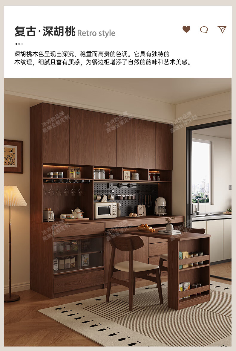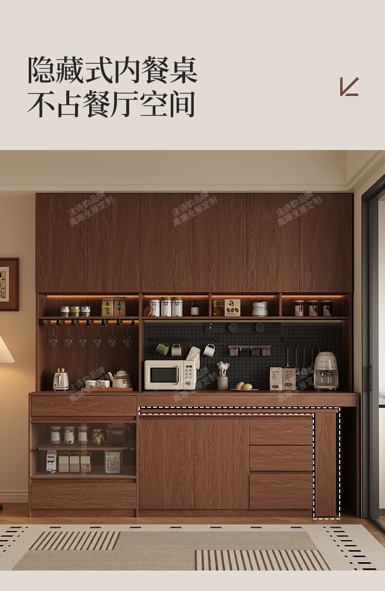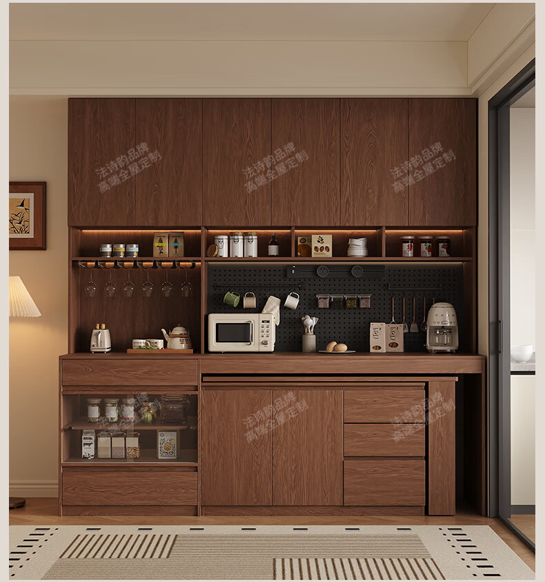 French poetry custom oak solid wood sideboard living room folding retractable dining table integrated deep walnut wall-to-top storage cabinet 1.2*2.0 (three doors) + 1.0 meter dining table. By default, a perforated board and a double-hole track socket are given.