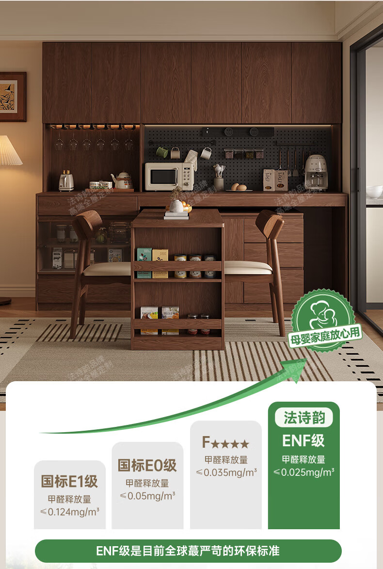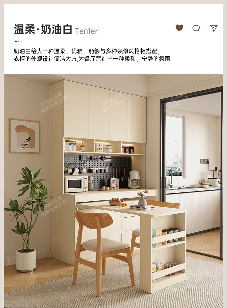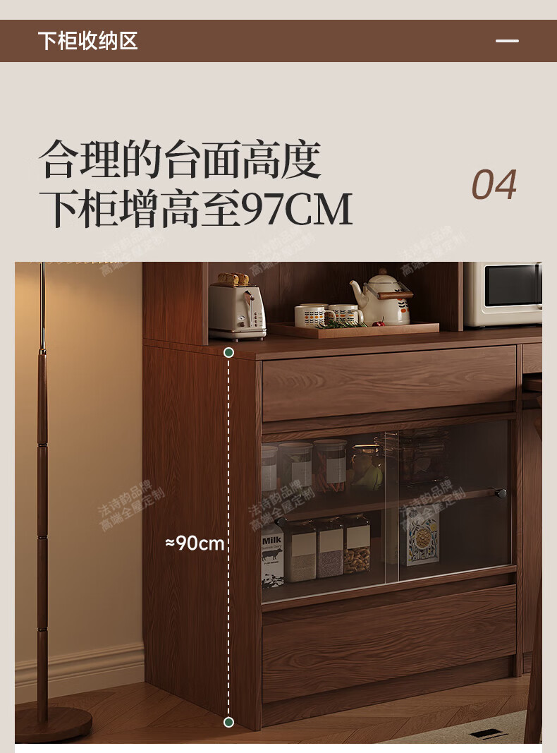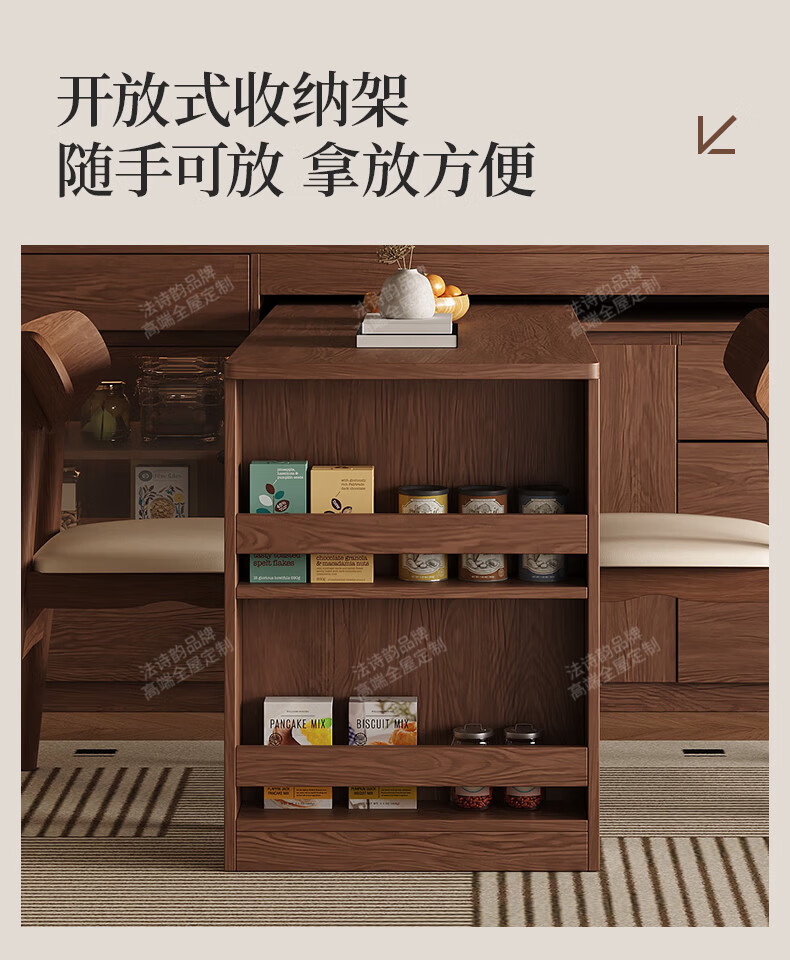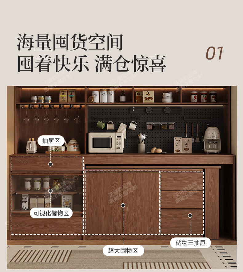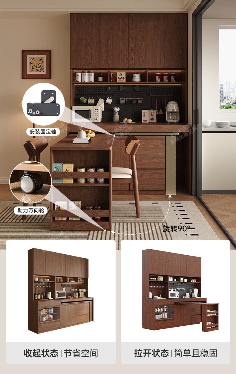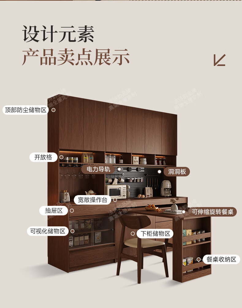 French poetry custom oak solid wood sideboard living room folding retractable dining table integrated deep walnut wall-to-top storage cabinet 1.2*2.0 (three doors) + 1.0 meter dining table. By default, a perforated board and a double-hole track socket are given.