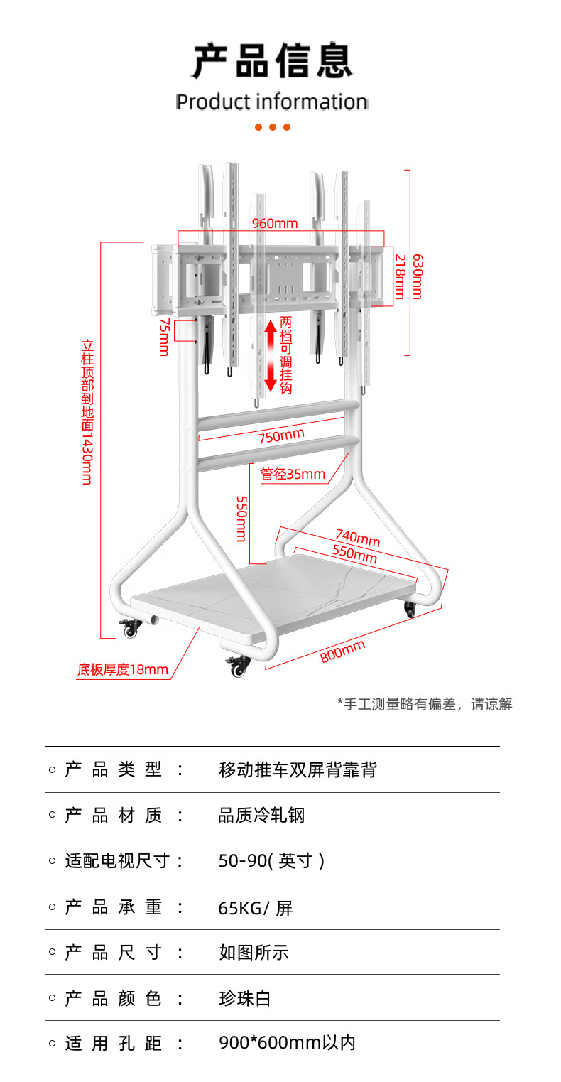 Sance back-to-back dual-screen movable TV stand floor-standing vertical wheeled TV art cart adapted to Xiaomi Skyworth TCL display universal TV stand 50-90 inches/back-to-back dual-screen TV mobile stand white