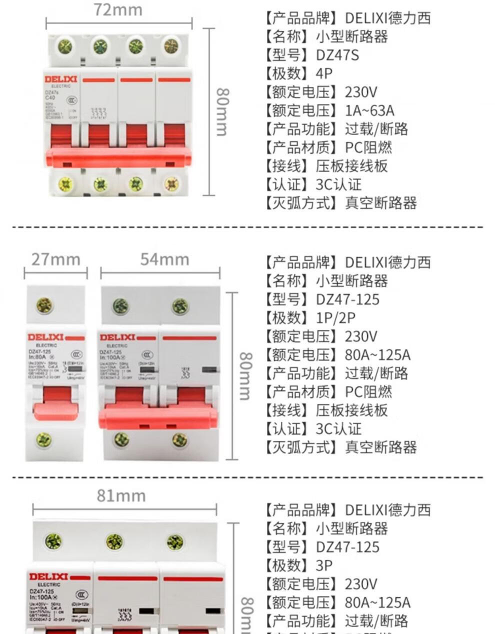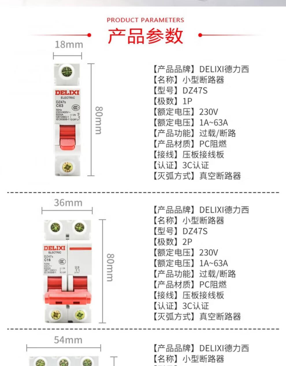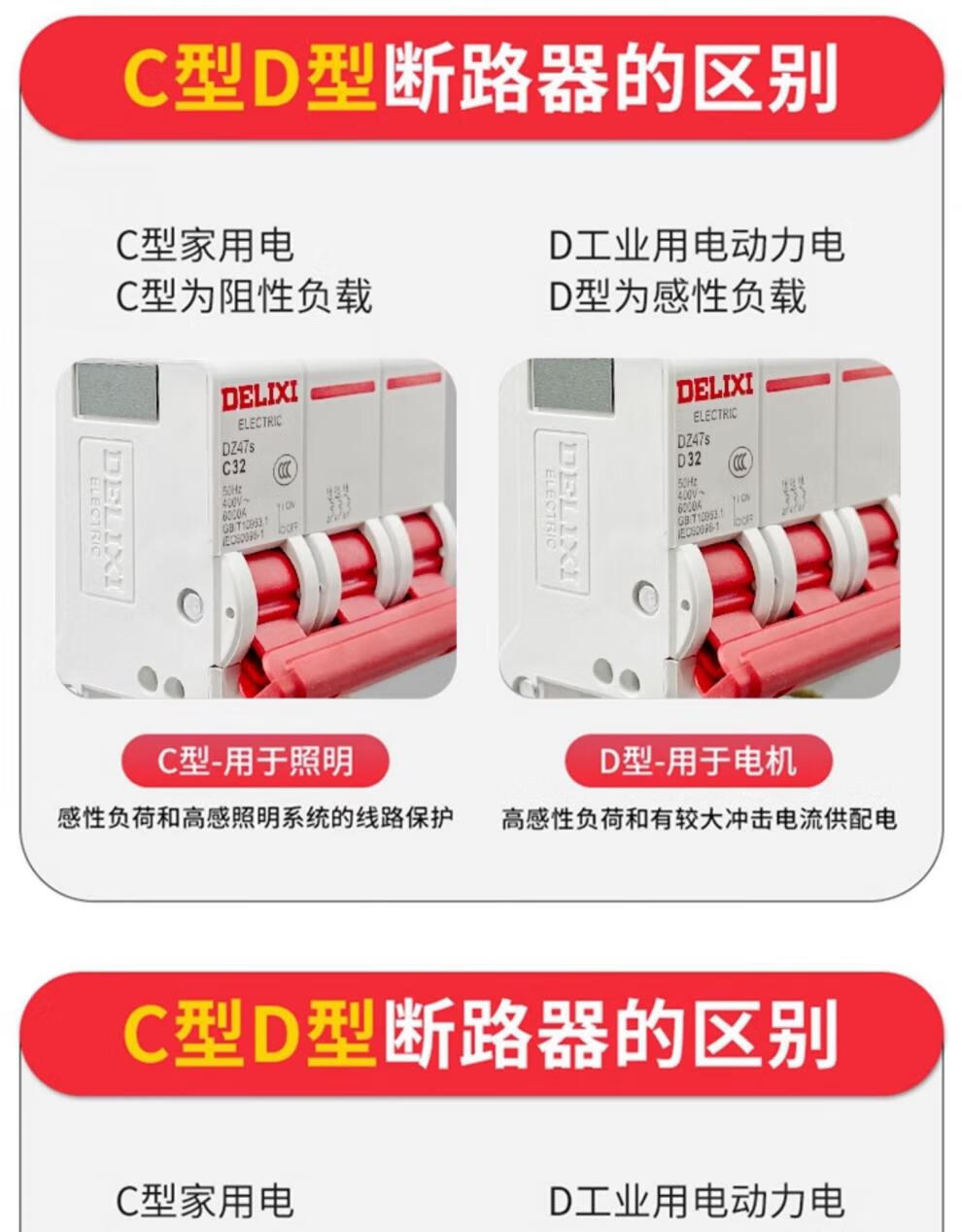 Delixi 1P air switch 2P household 32a63a three-phase 3P circuit breaker DZ47S 4P air switch 100A switch 1P+N 63A