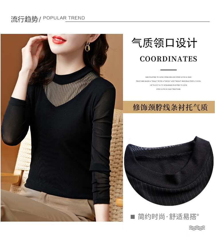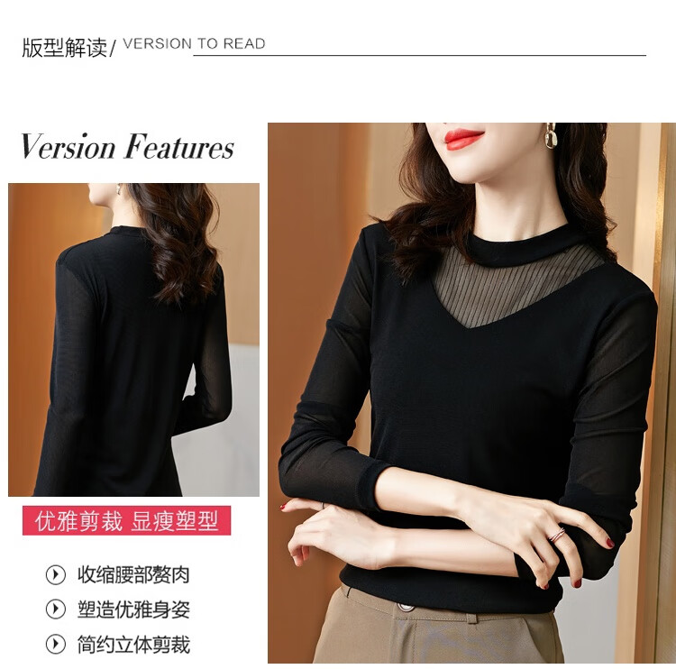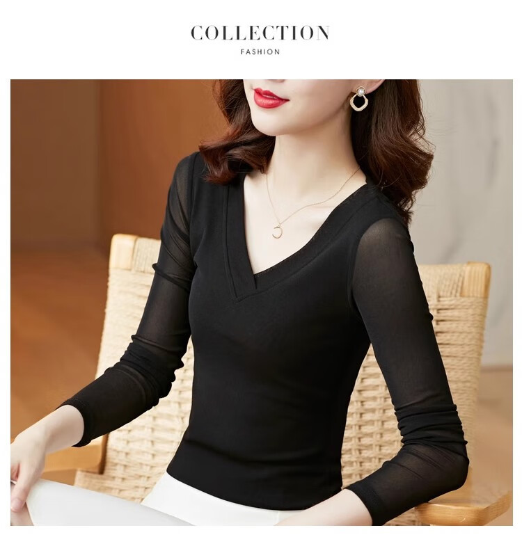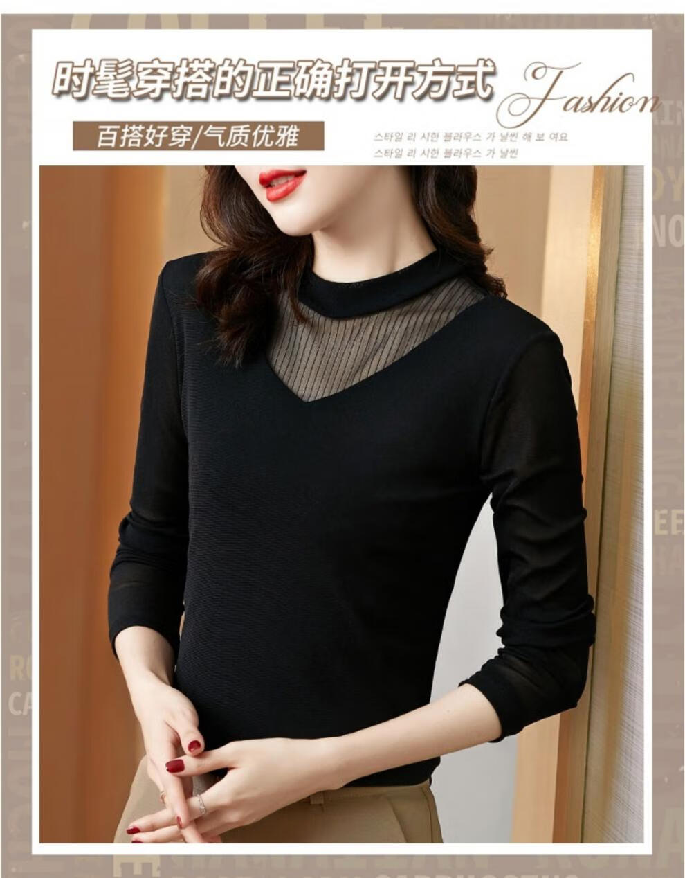 Pierre Cardin mesh bottoming shirt for women 2026 spring and autumn new women's wear inner T-shirt black fashionable style small shirt lace top black M/collar L recommended 100-115 pounds