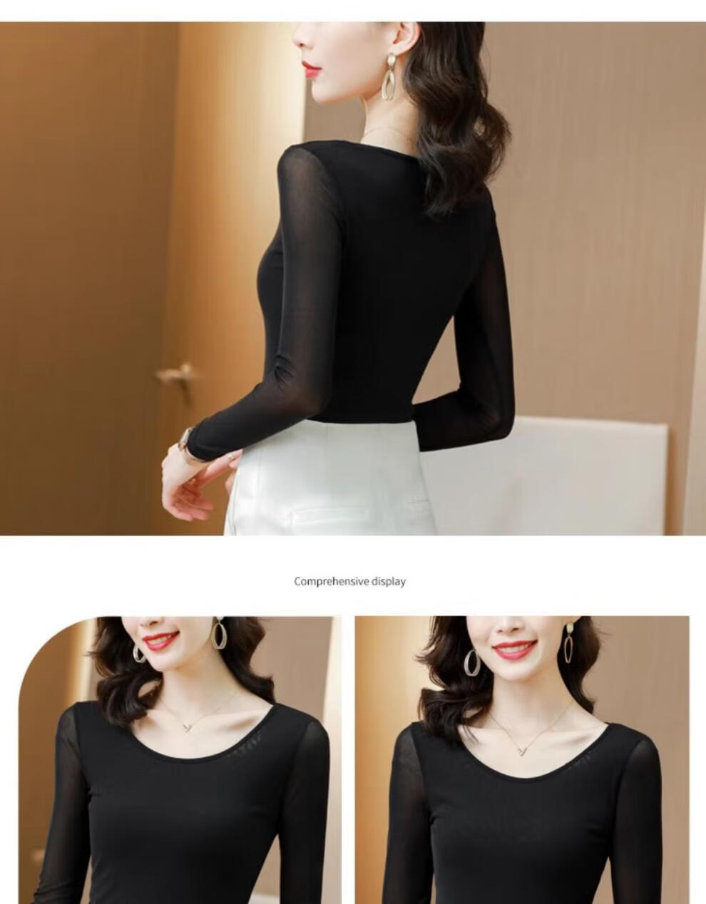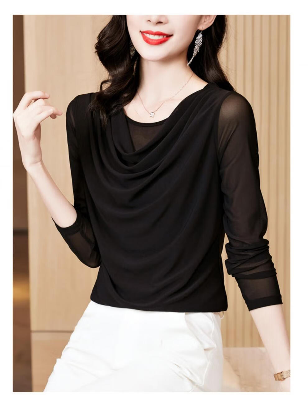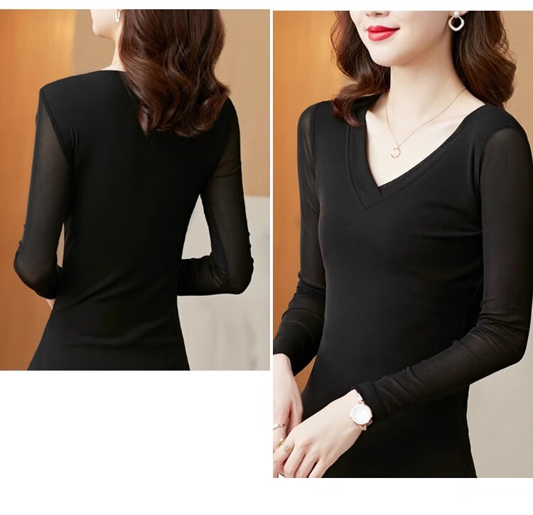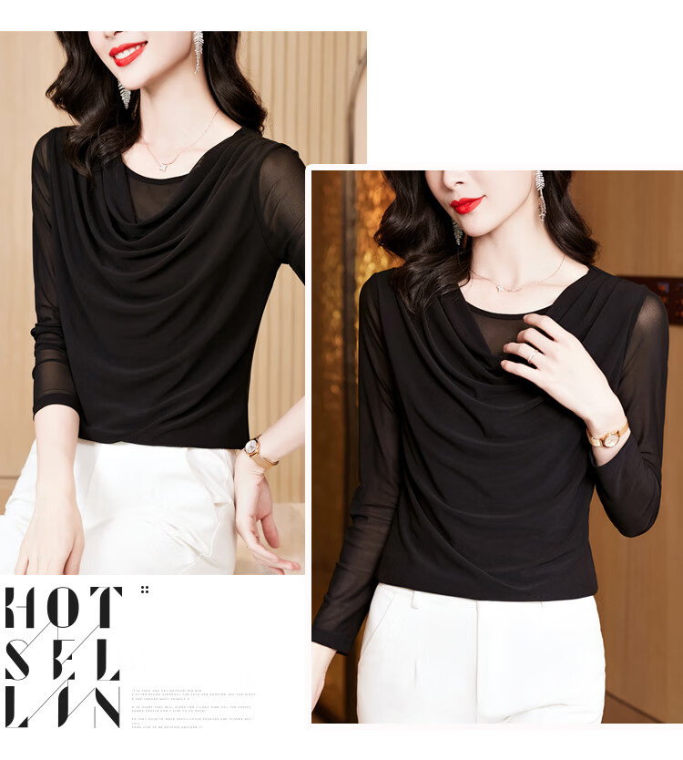 Pierre Cardin mesh bottoming shirt for women 2026 spring and autumn new women's wear inner T-shirt black fashionable style small shirt lace top black M/collar L recommended 100-115 pounds