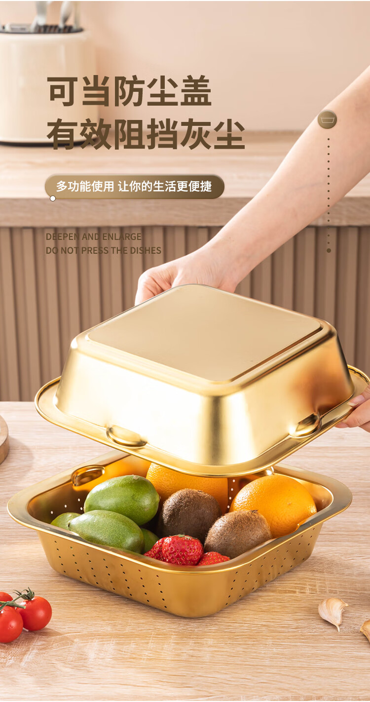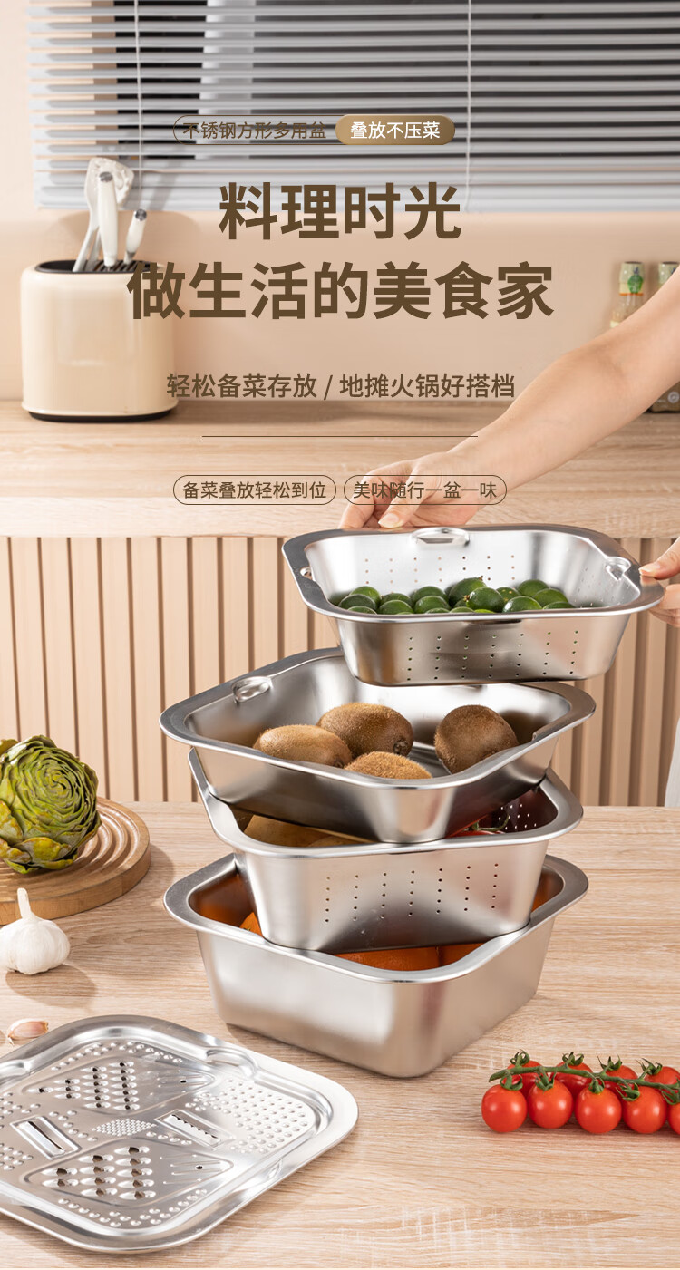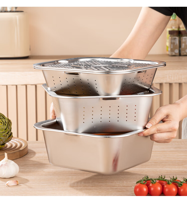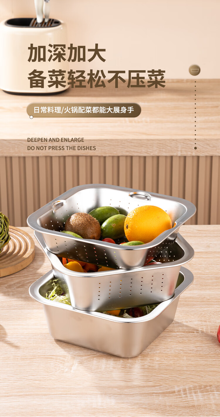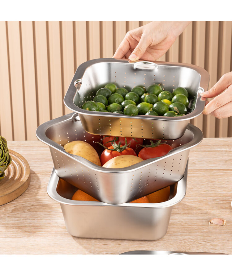 Yiyipai 304 stainless steel drain basket square square basin household vegetable sink drain basin set punching basket filter basin rice washing sieve 304 deep solid basin + deep drain basin