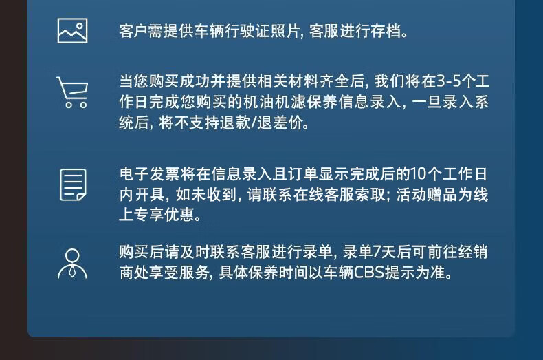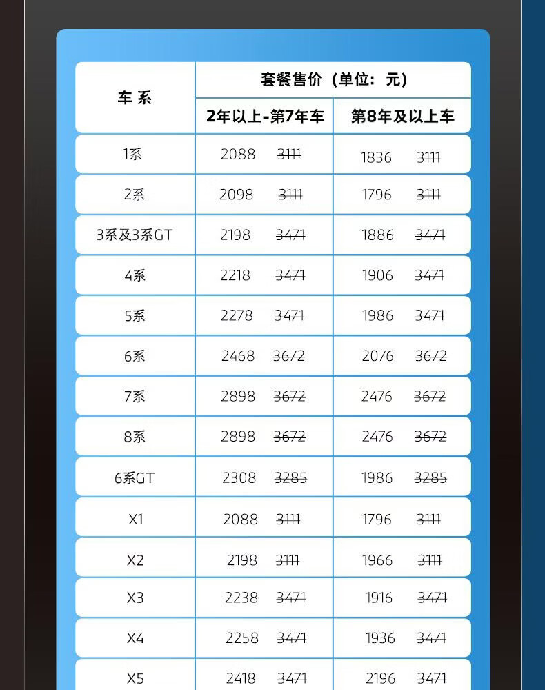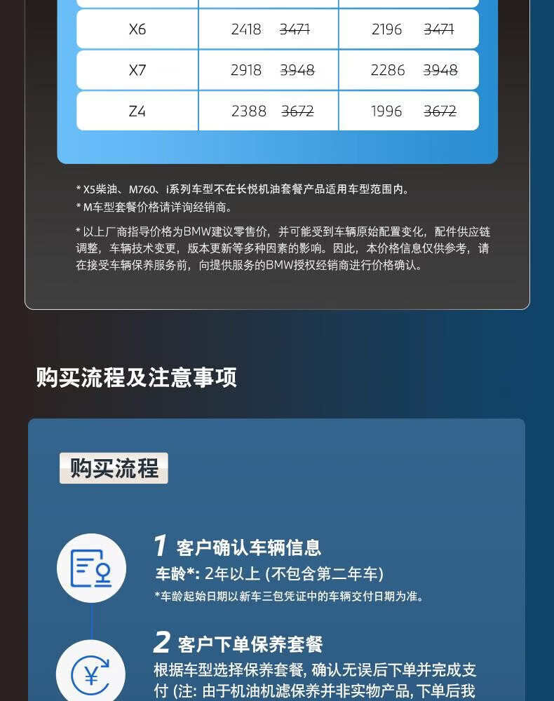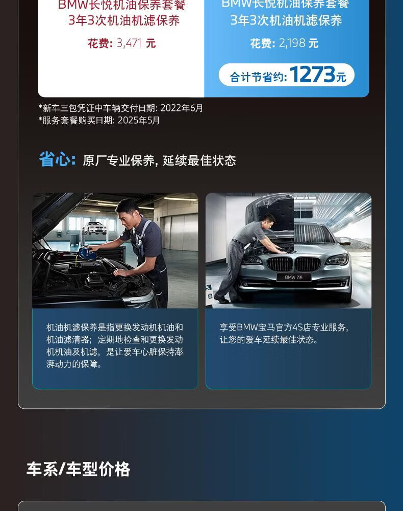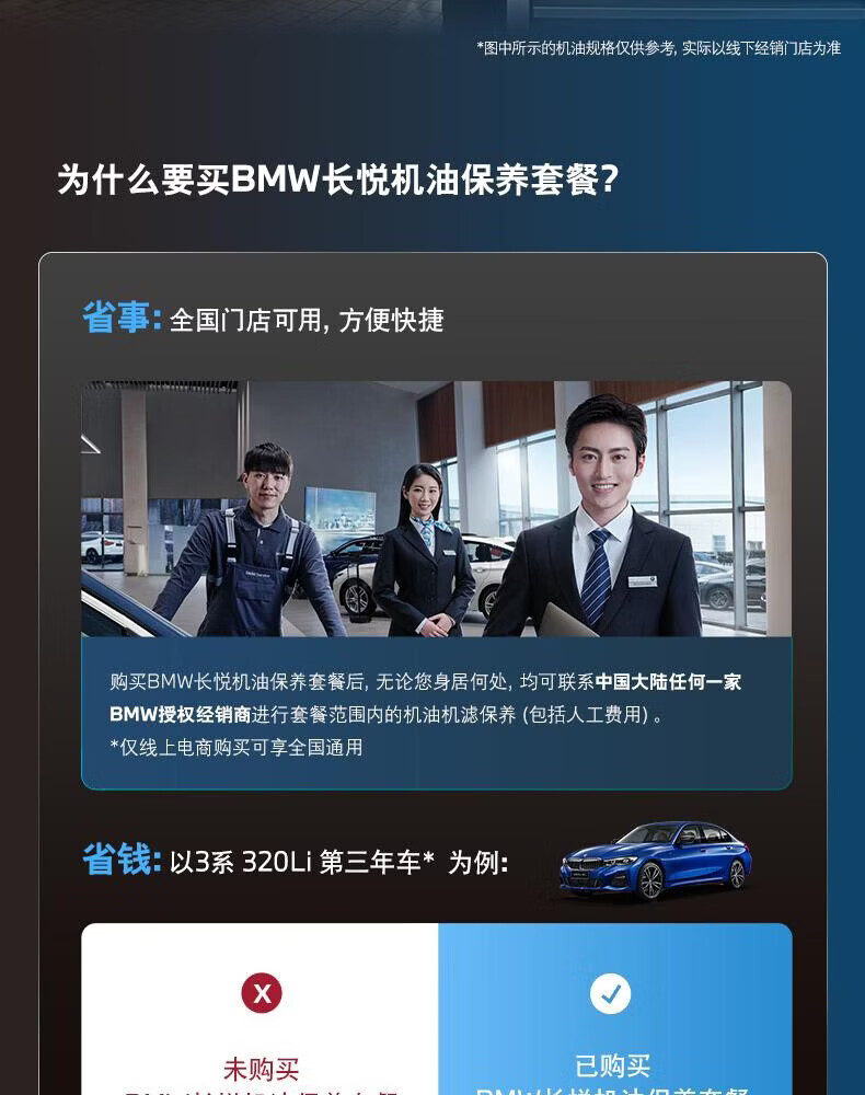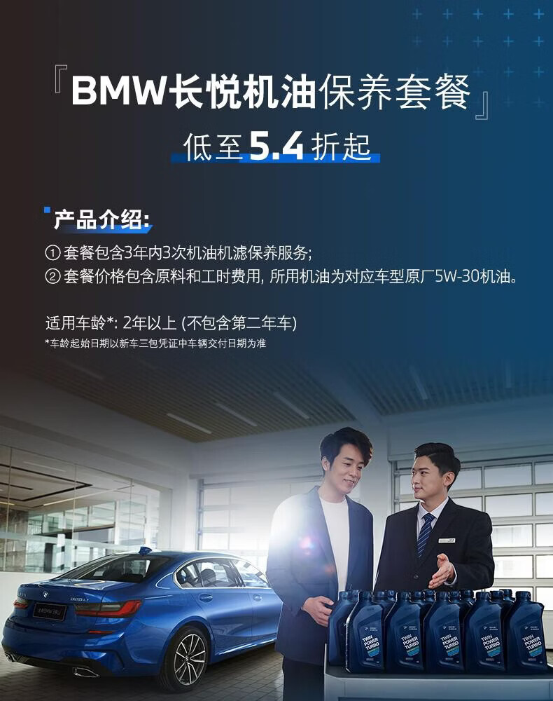 BMW's official original Changyue oil maintenance package includes 3 oil and filter maintenance within 3 years. All fuel models. Vehicle age - more than 2 years - 7th year car. BMW 3 Series and 3 Series GT