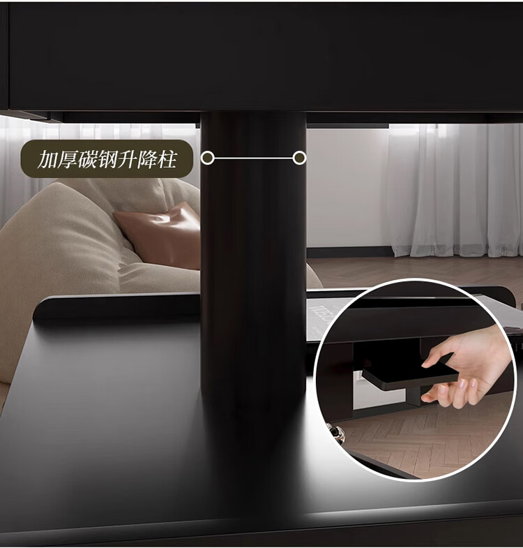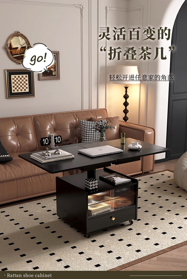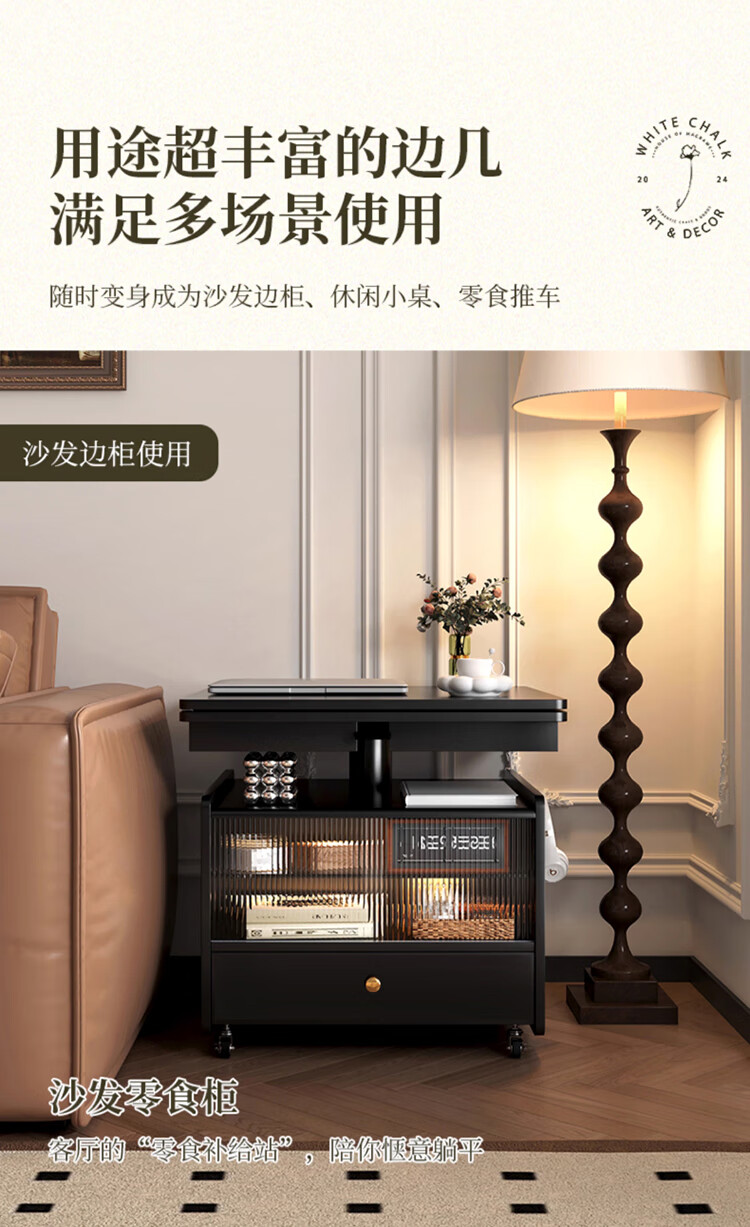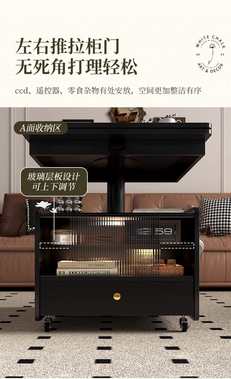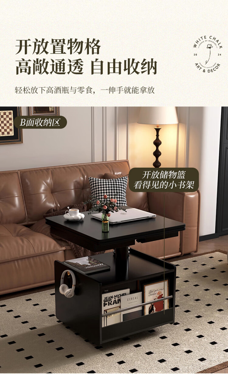 Mimude solid wood retro lifting coffee table living room movable sofa side table side cabinet modern simple trolley folding dining table black (excluding hooks)