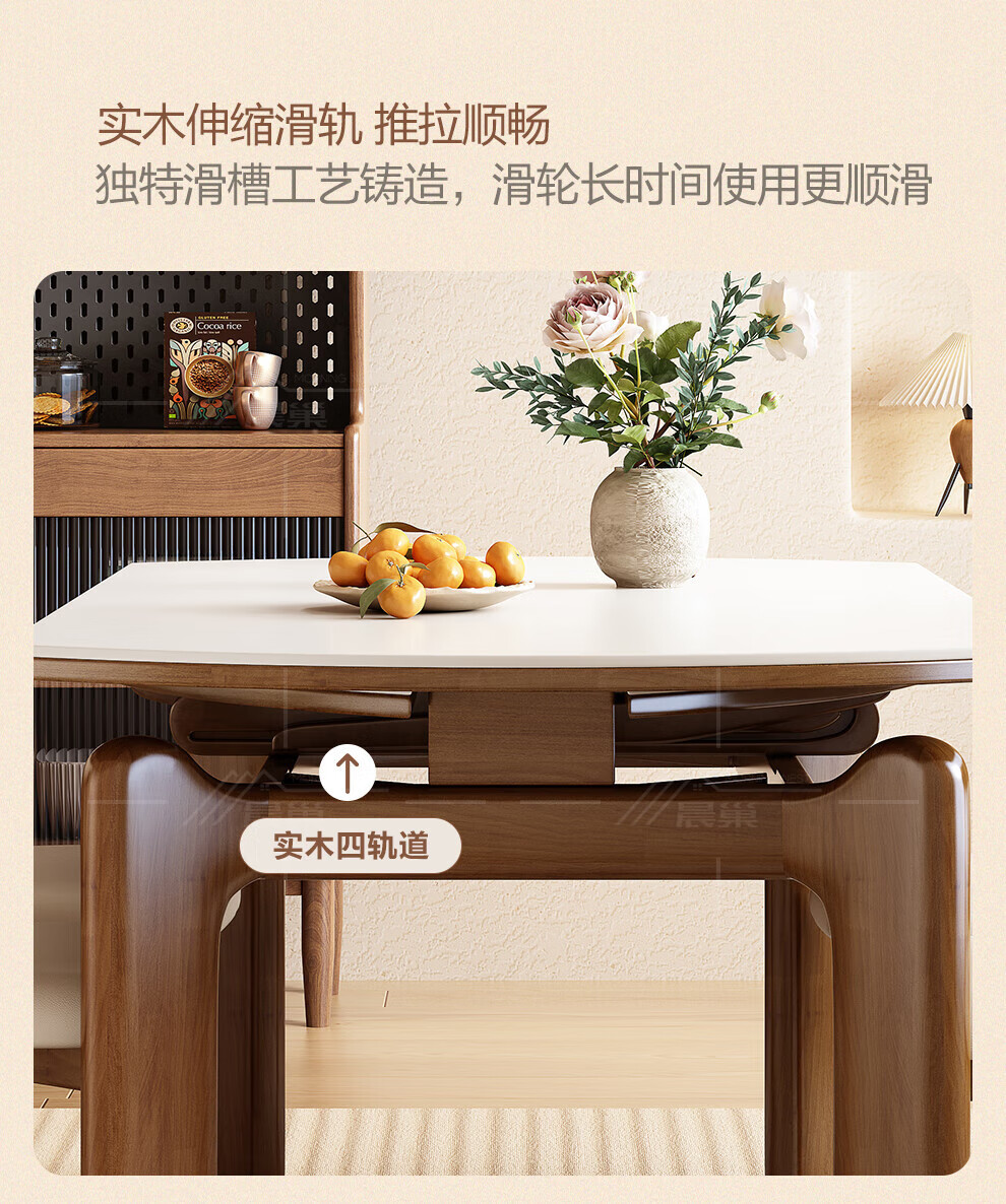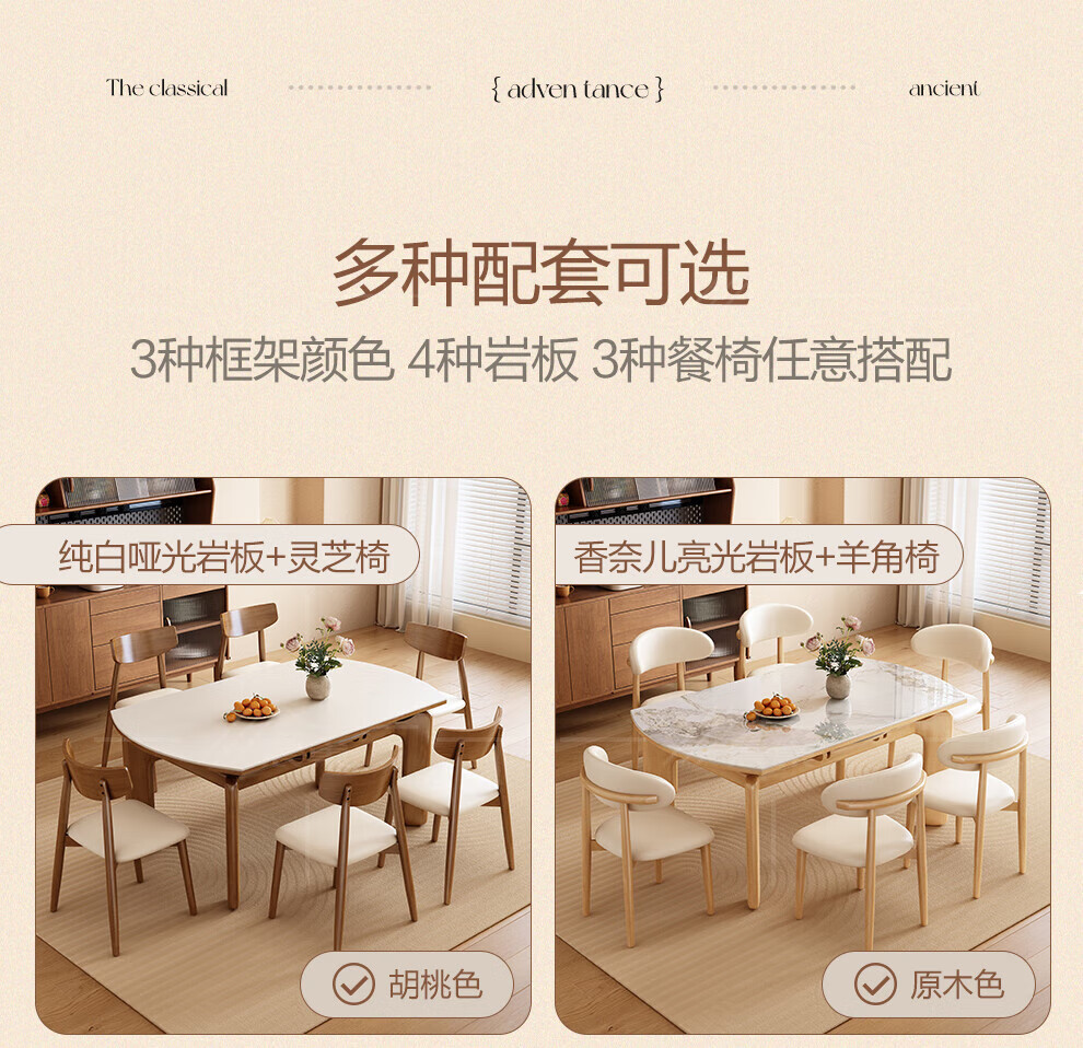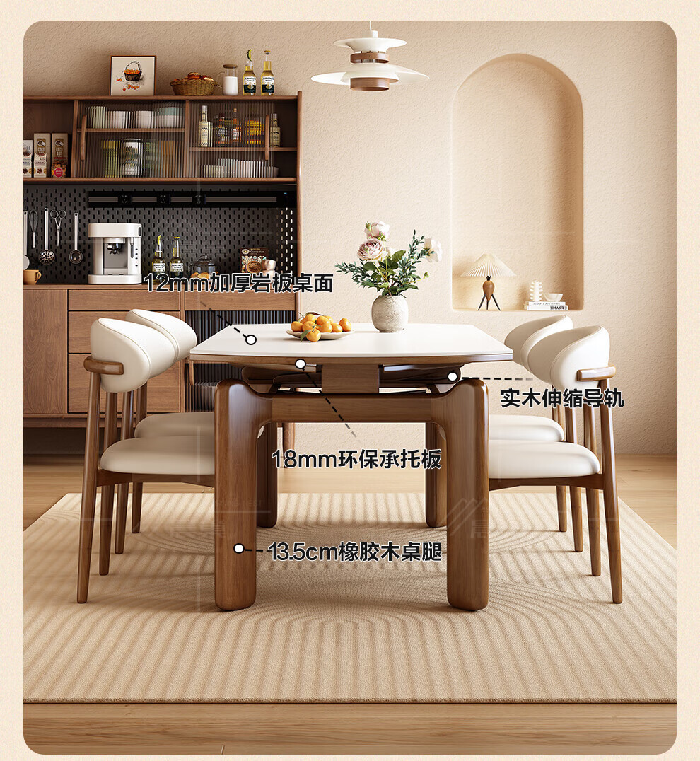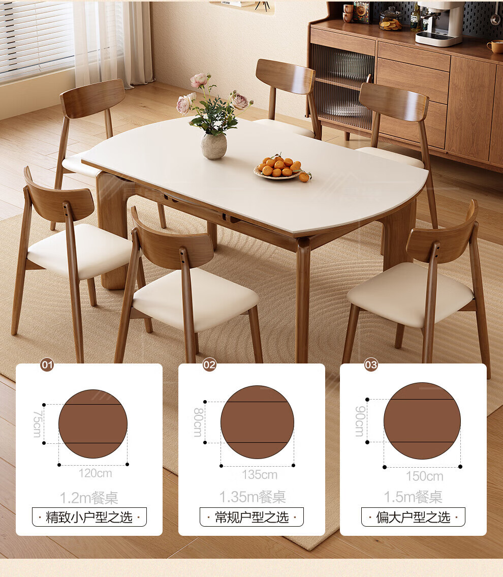 Chennest antique style solid wood slate dining table and chair combination 2026 new home small apartment retractable square and round dining table Antibacterial matte pure white slate/walnut color-horn chair 1.35 meters One table and six chairs Upgraded four rails