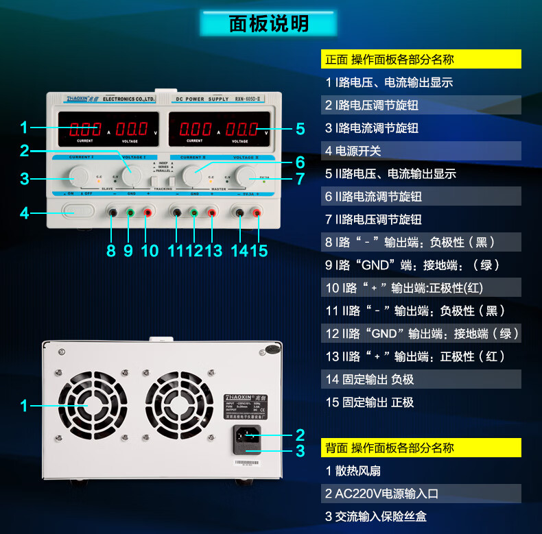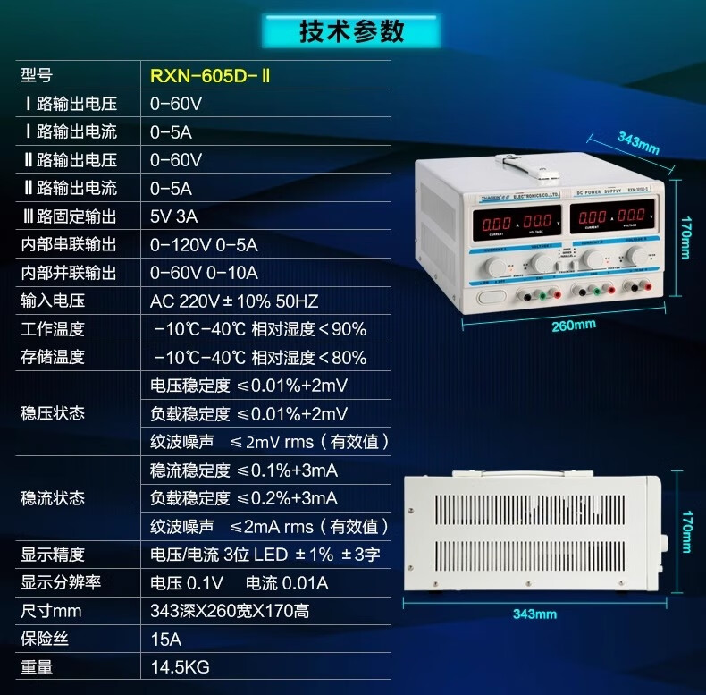 Adjustable DC regulated power supply RXN605D-260V5A with two series and parallel outputs RXN-605D-II comes standard with 2 sets of 5A output lines