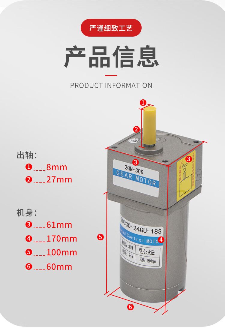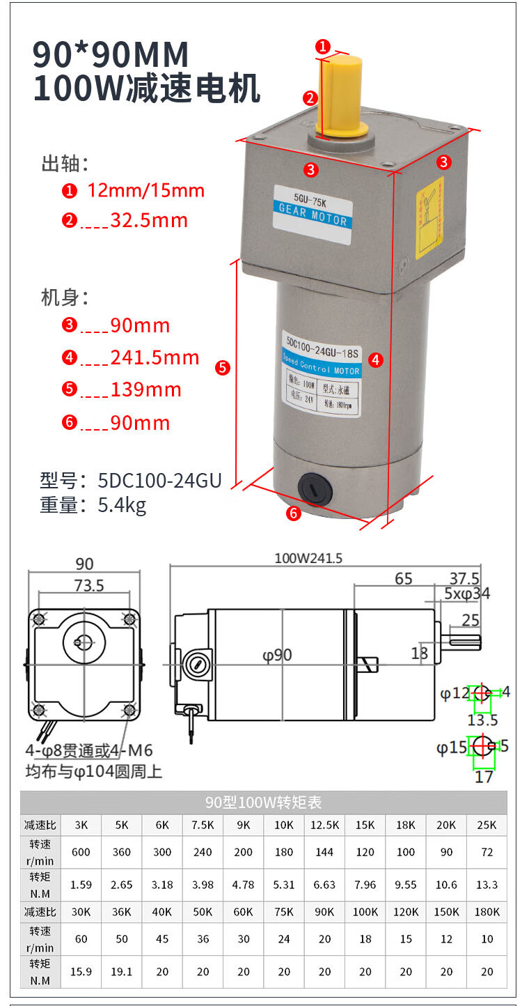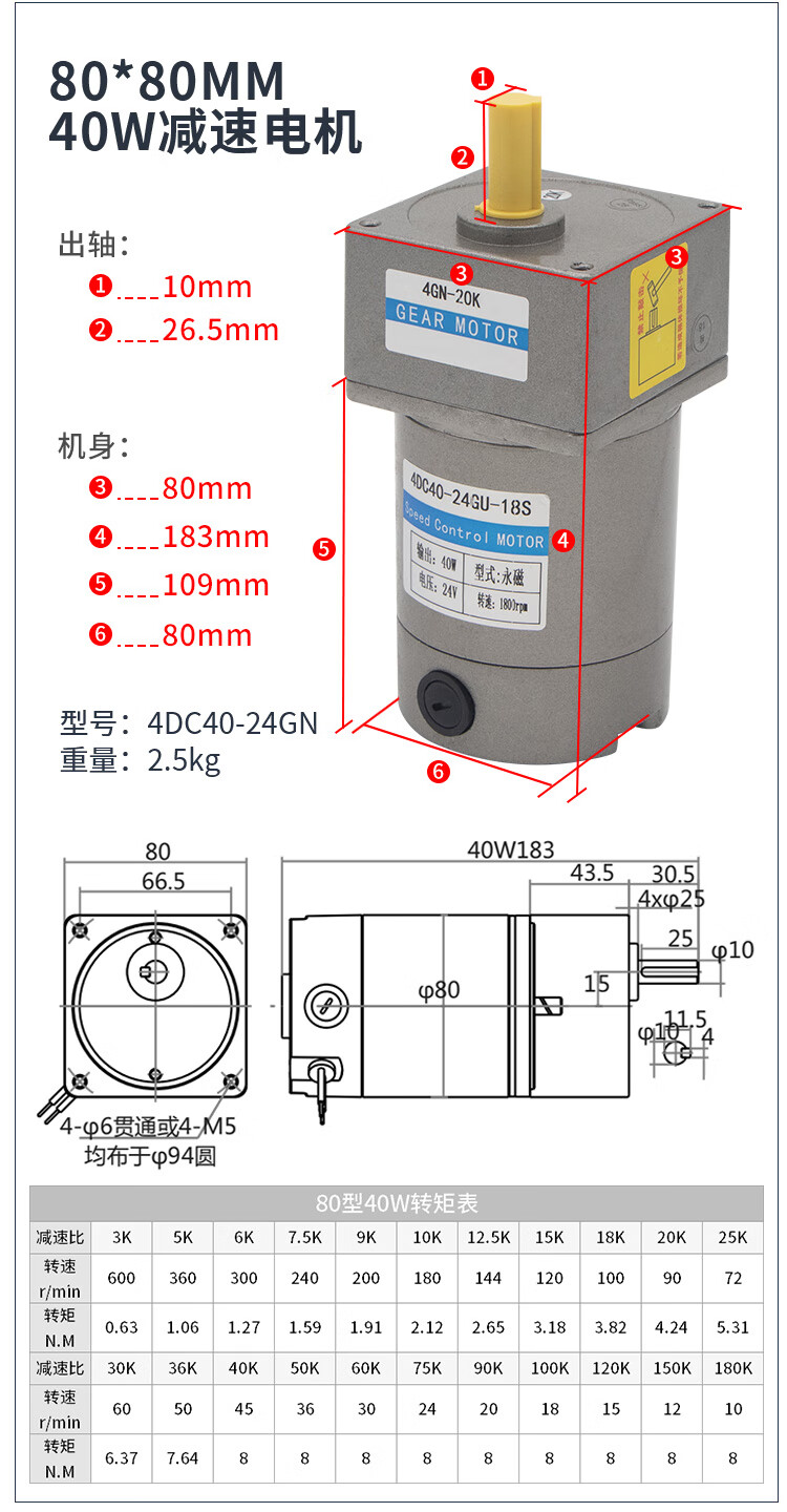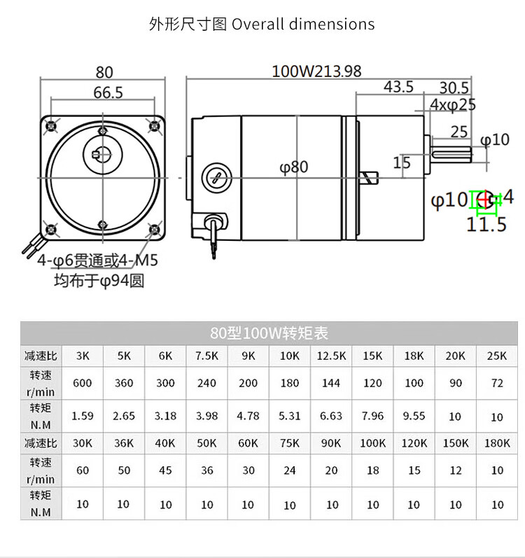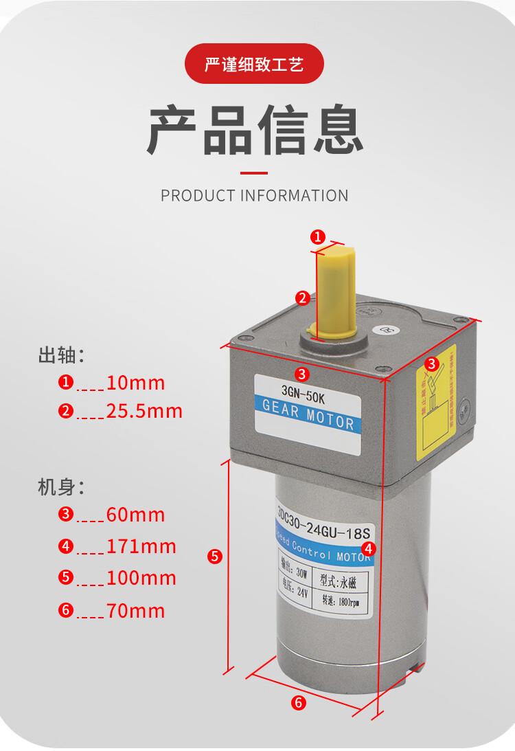 Yue Changsheng DC brushed reduction motor high torque 12v24V48v adjustable speed forward and reverse/torque gear micro motor 80 type 100W output shaft 10MM key 4 6-10 rpm DC motor DC12V