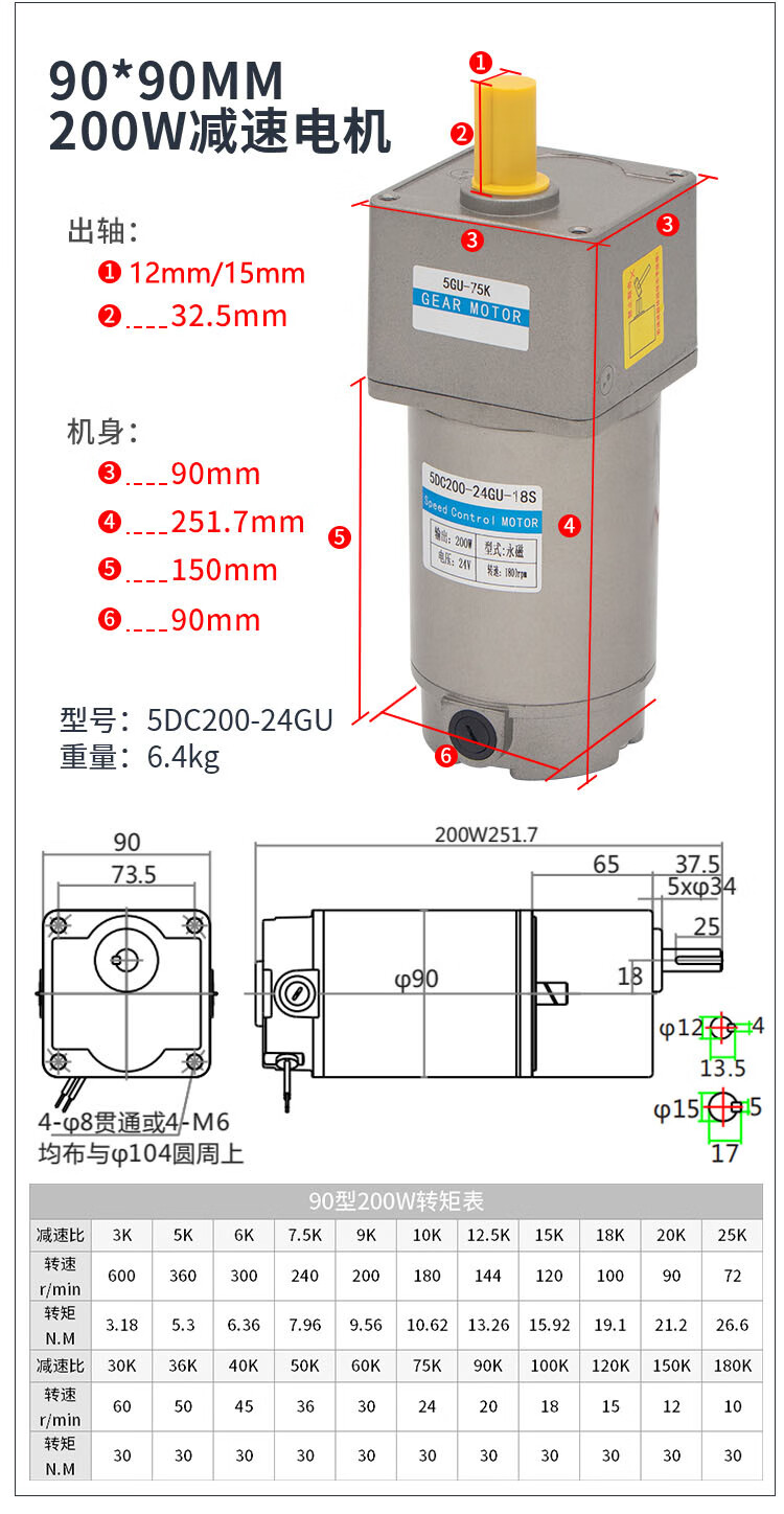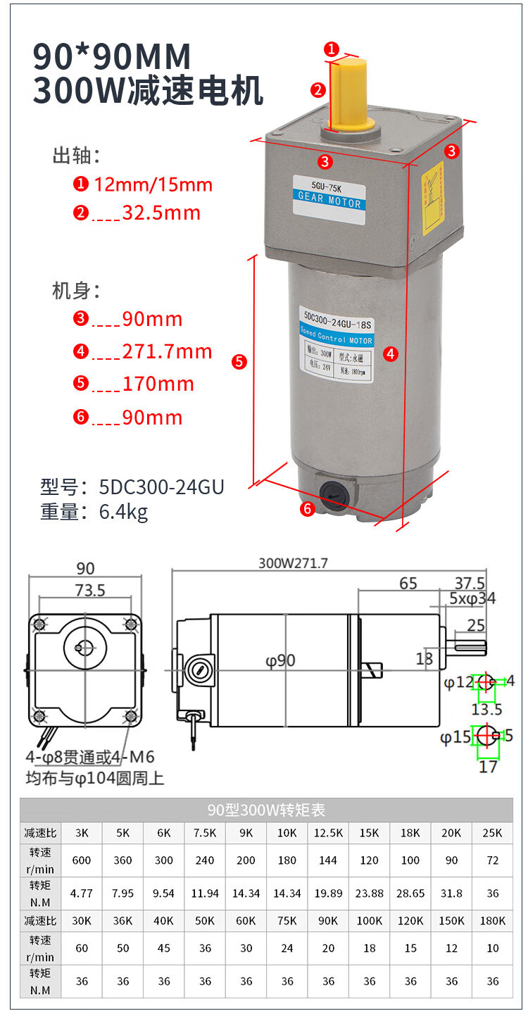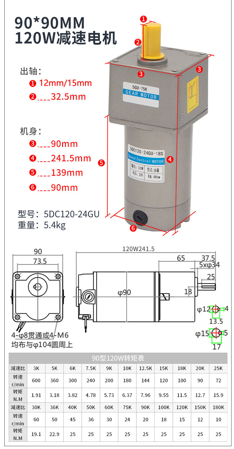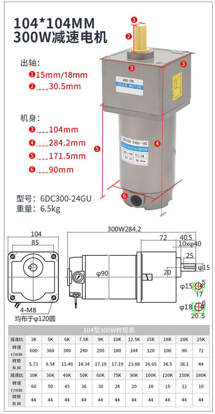Yue Changsheng DC brushed reduction motor high torque 12v24V48v adjustable speed forward and reverse/torque gear micro motor 80 type 100W output shaft 10MM key 4 6-10 rpm DC motor DC12V