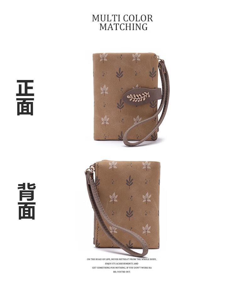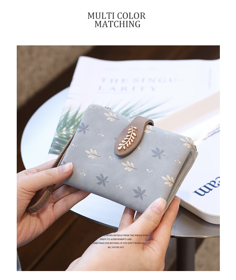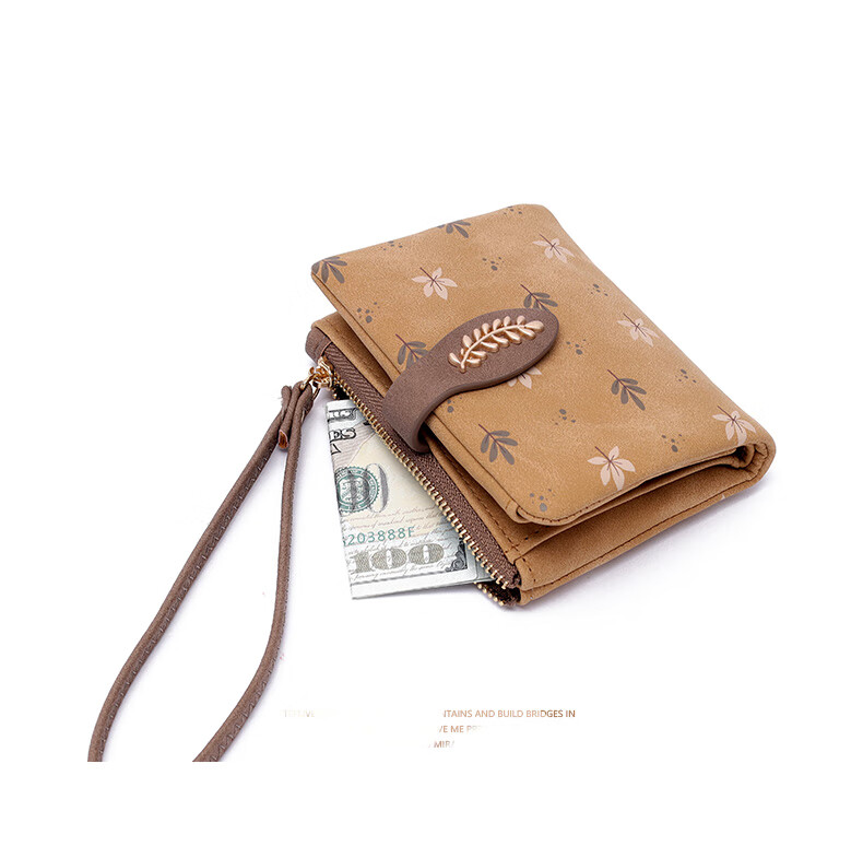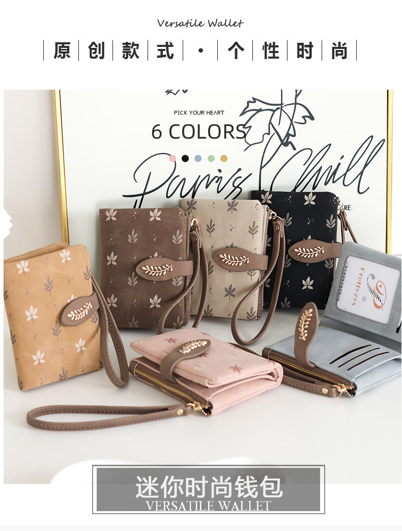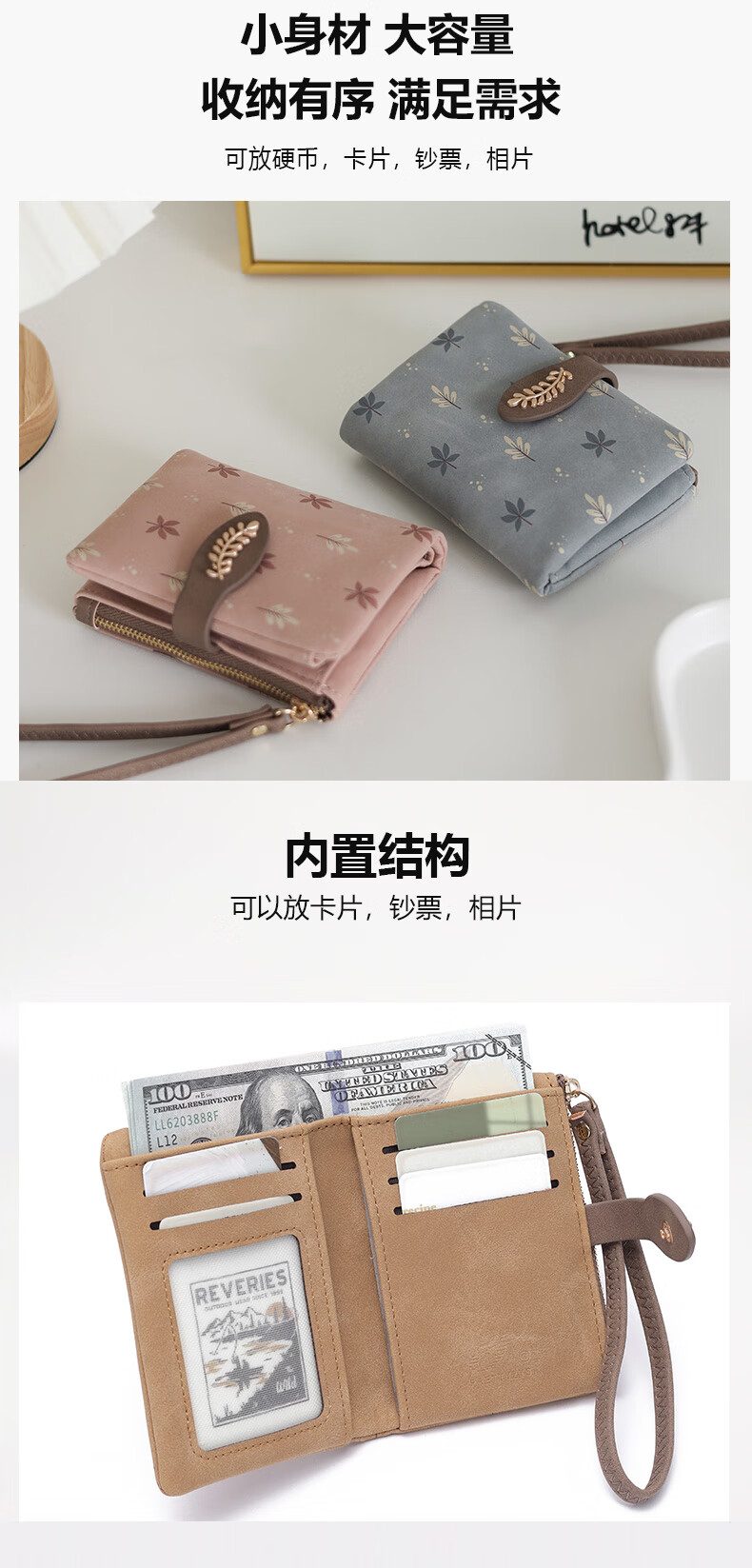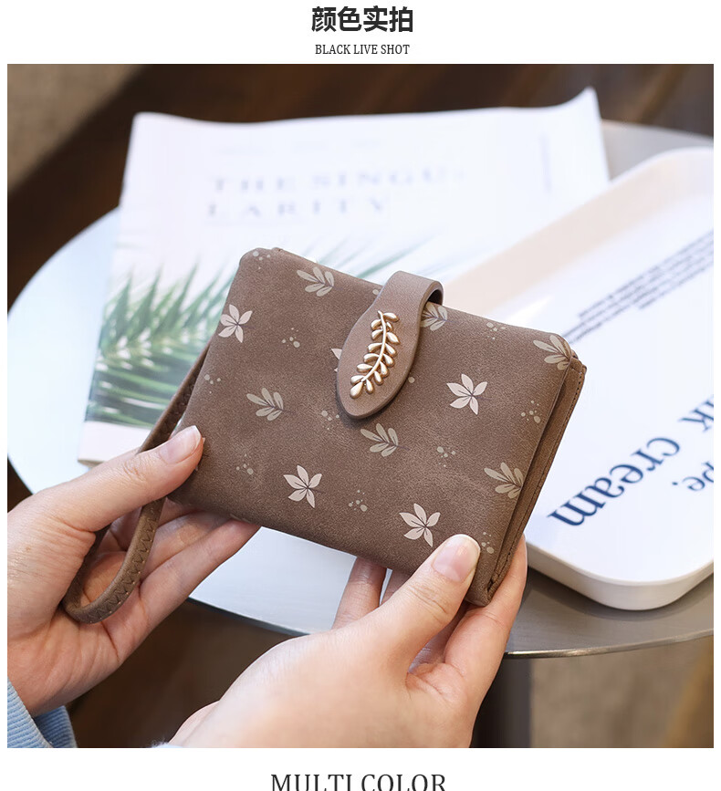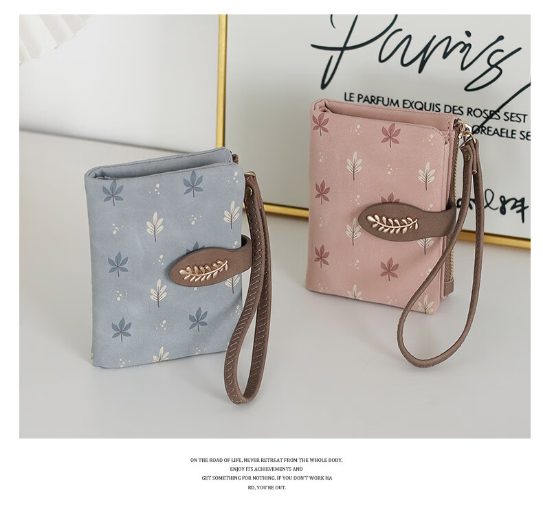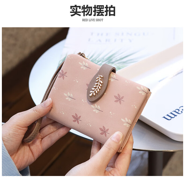 Casa-kupsCK Korean style small fresh leaf print short women's wallet hand strap niche design multi-card slot student coin purse pink