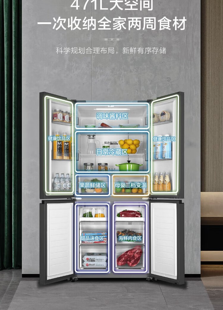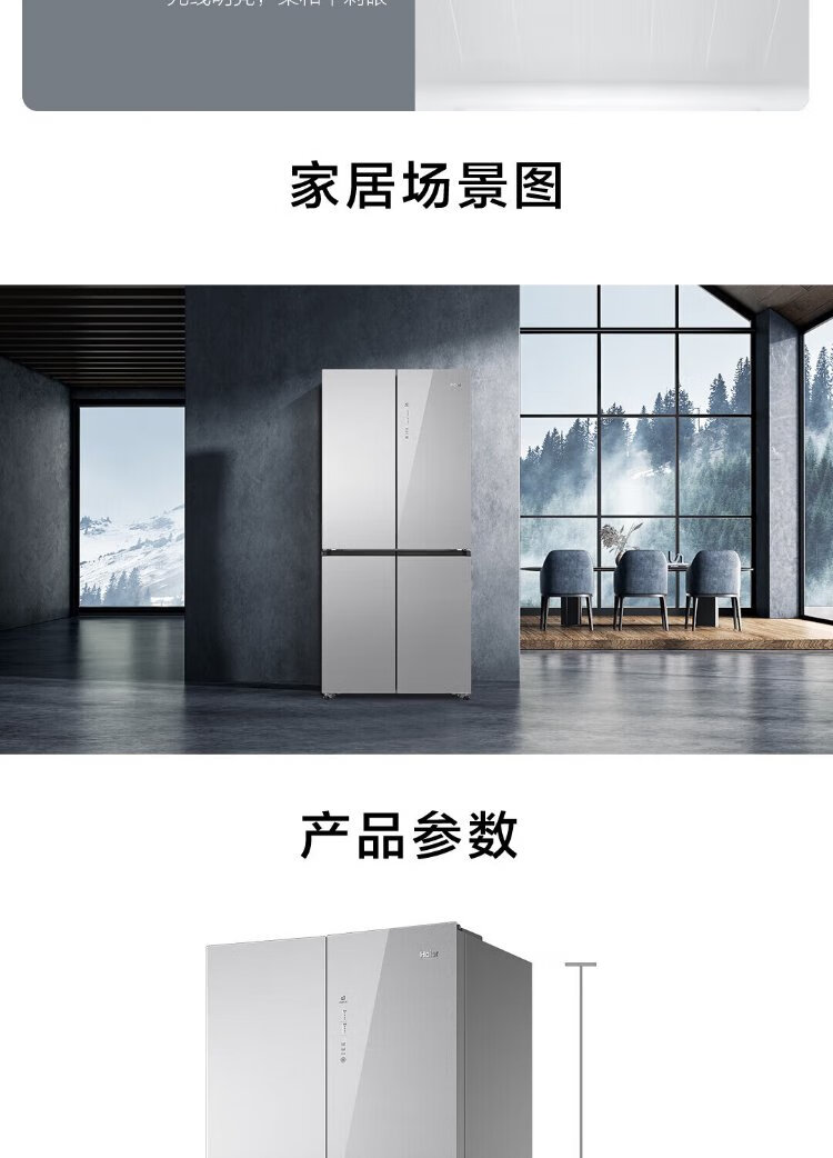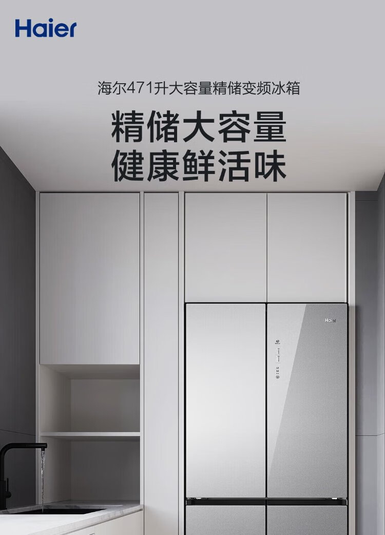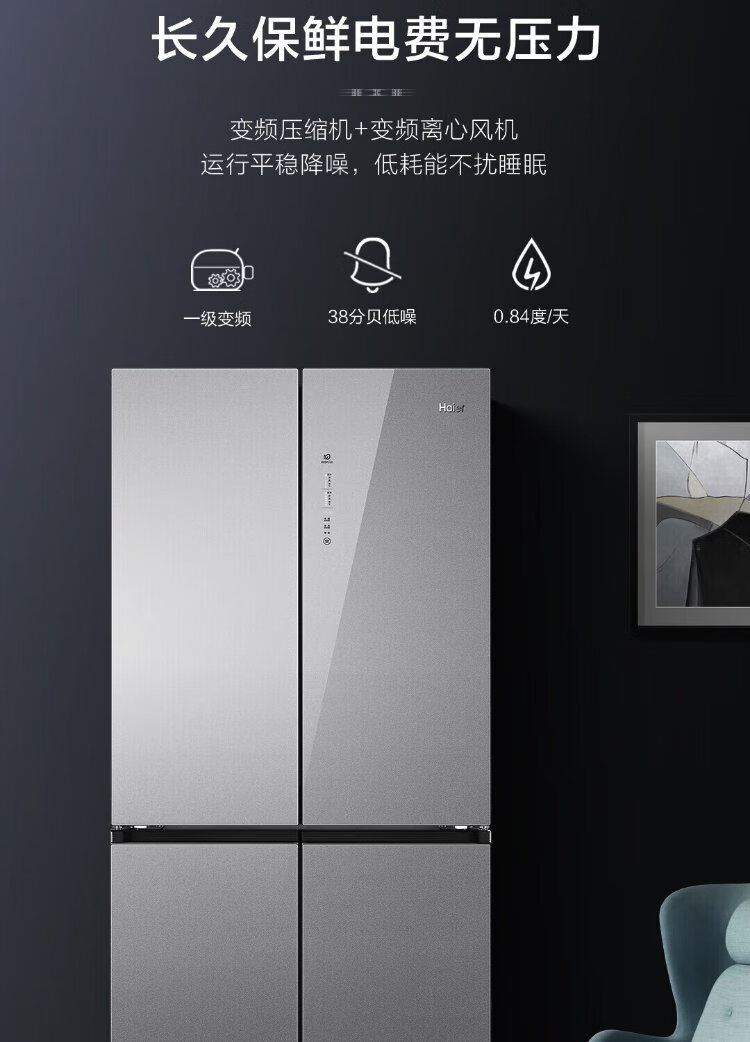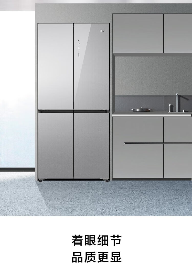 Haier household cross-fold four-door large-capacity refrigerator, air-cooled, frost-free, energy-saving, first-class dual-frequency color crystal tempered glass 471 liters, national trade-in subsidy 15%, tempered glass 471 liters, cross-door + first-class dual frequency conversion + odor-free and fresh-keeping