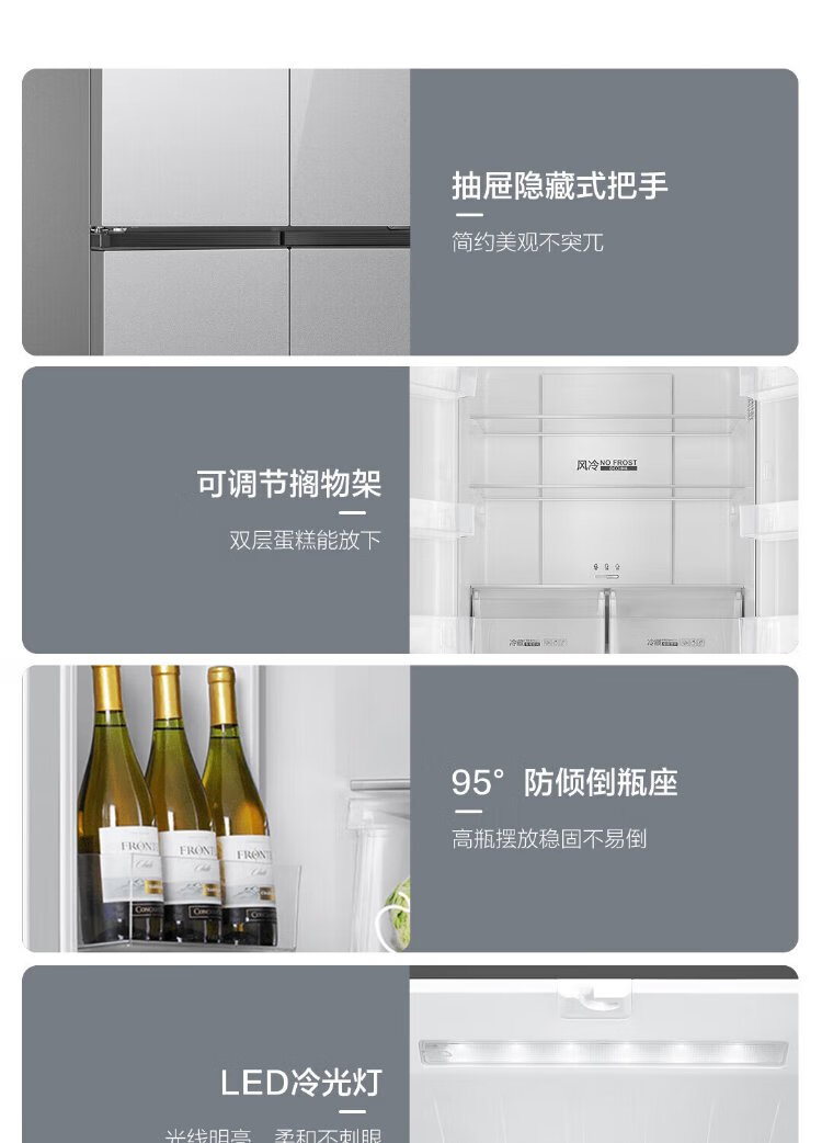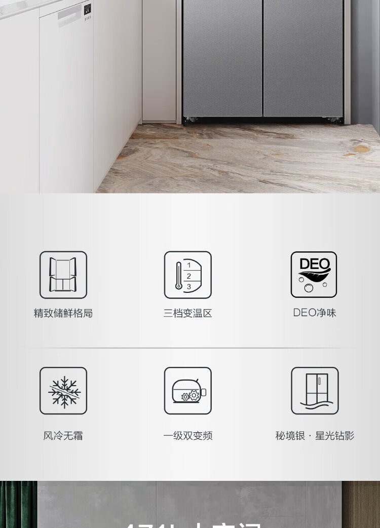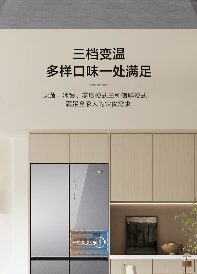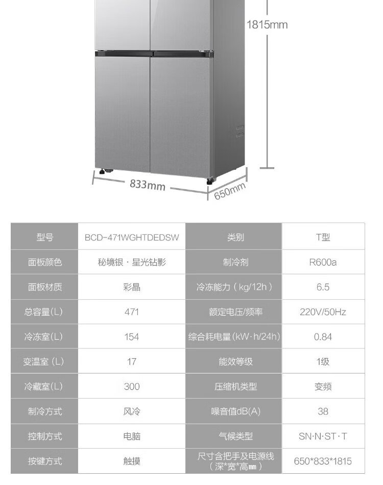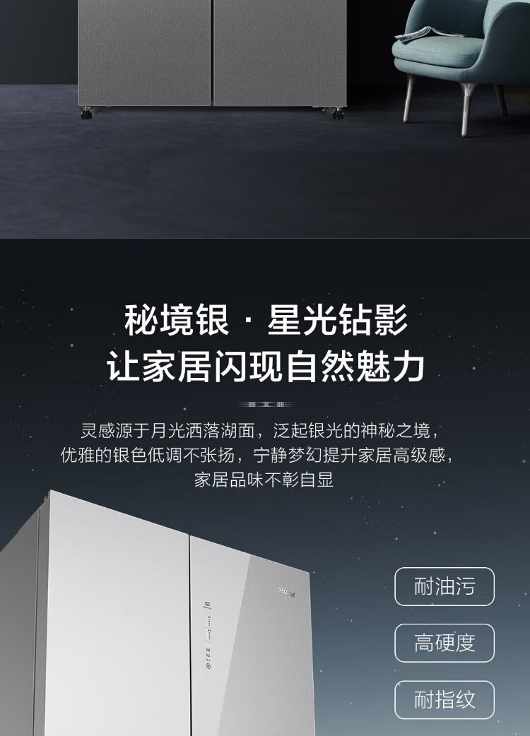 Haier household cross-fold four-door large-capacity refrigerator, air-cooled, frost-free, energy-saving, first-class dual-frequency color crystal tempered glass 471 liters, national trade-in subsidy 15%, tempered glass 471 liters, cross-door + first-class dual frequency conversion + odor-free and fresh-keeping