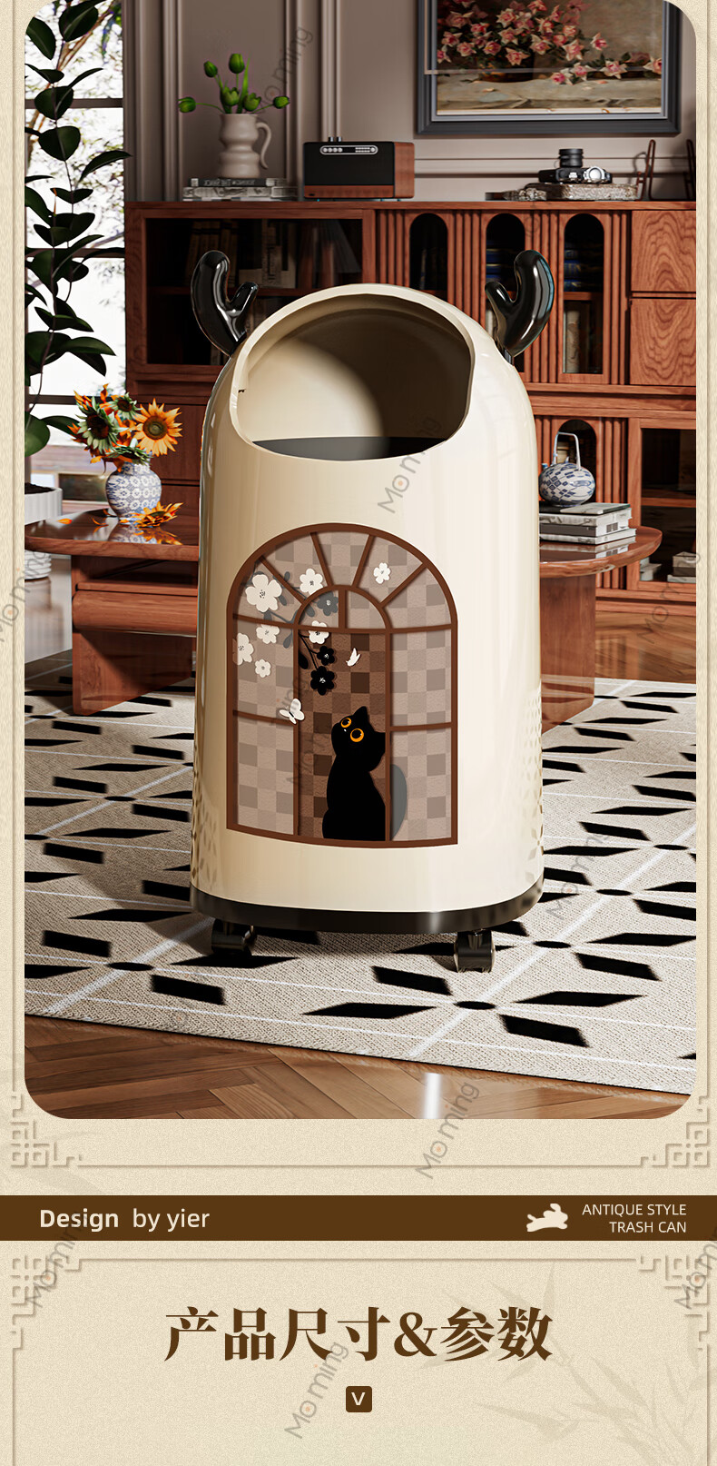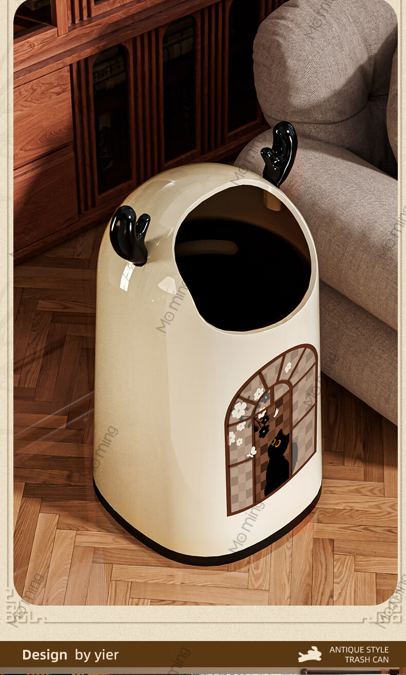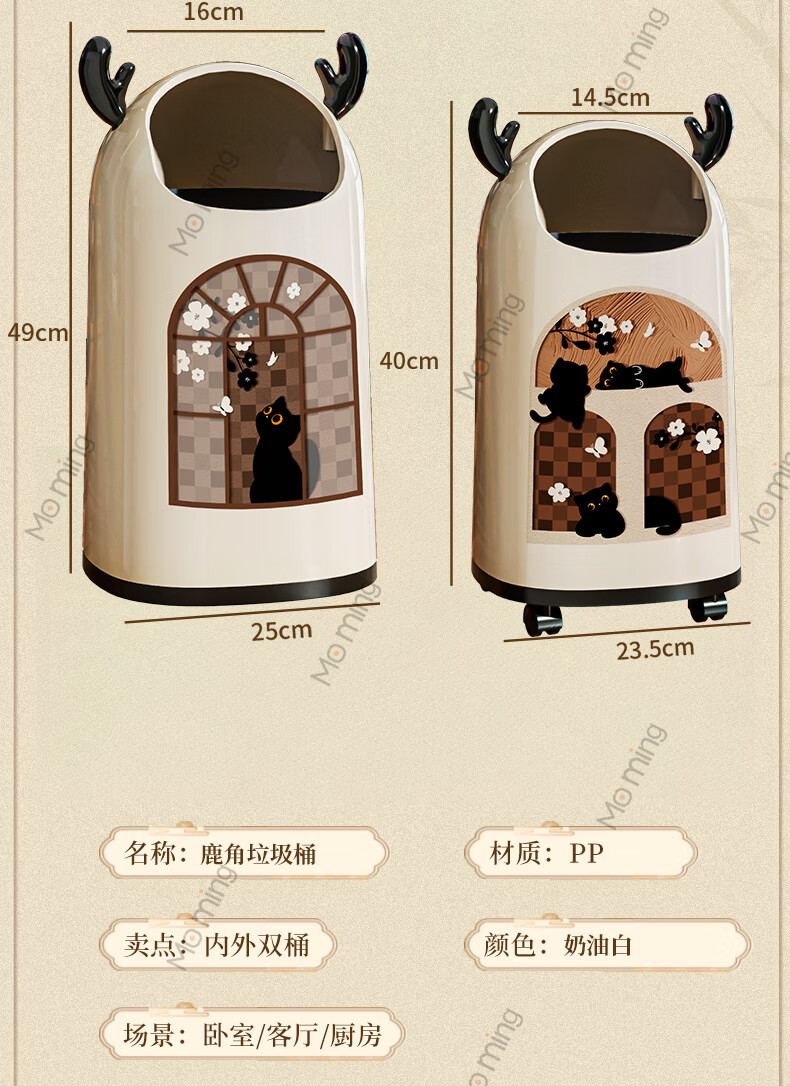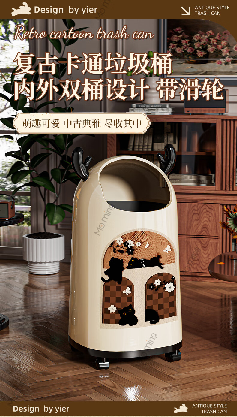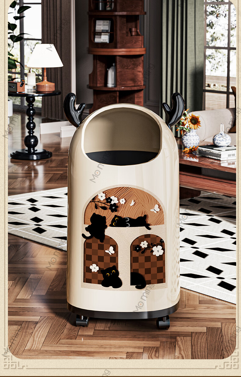 Moming deer antler trash can bathroom home living room antique style retro bedroom elegant trash can bedroom with wheels Elk ears window climbing cat large size - pulley version