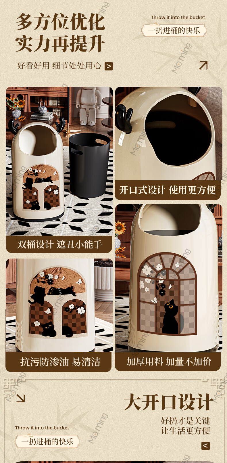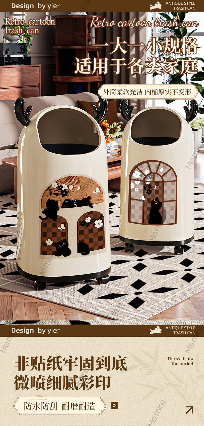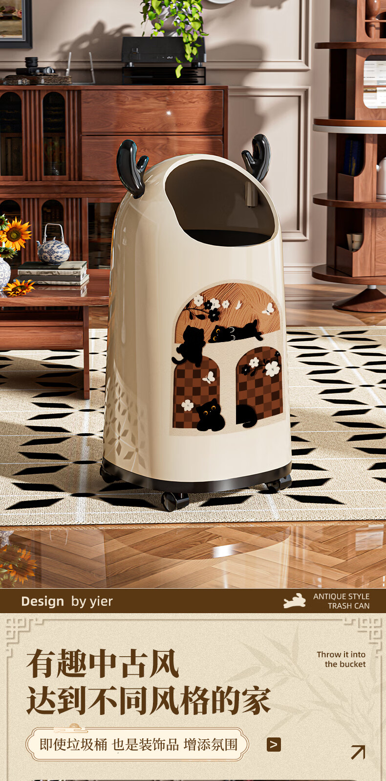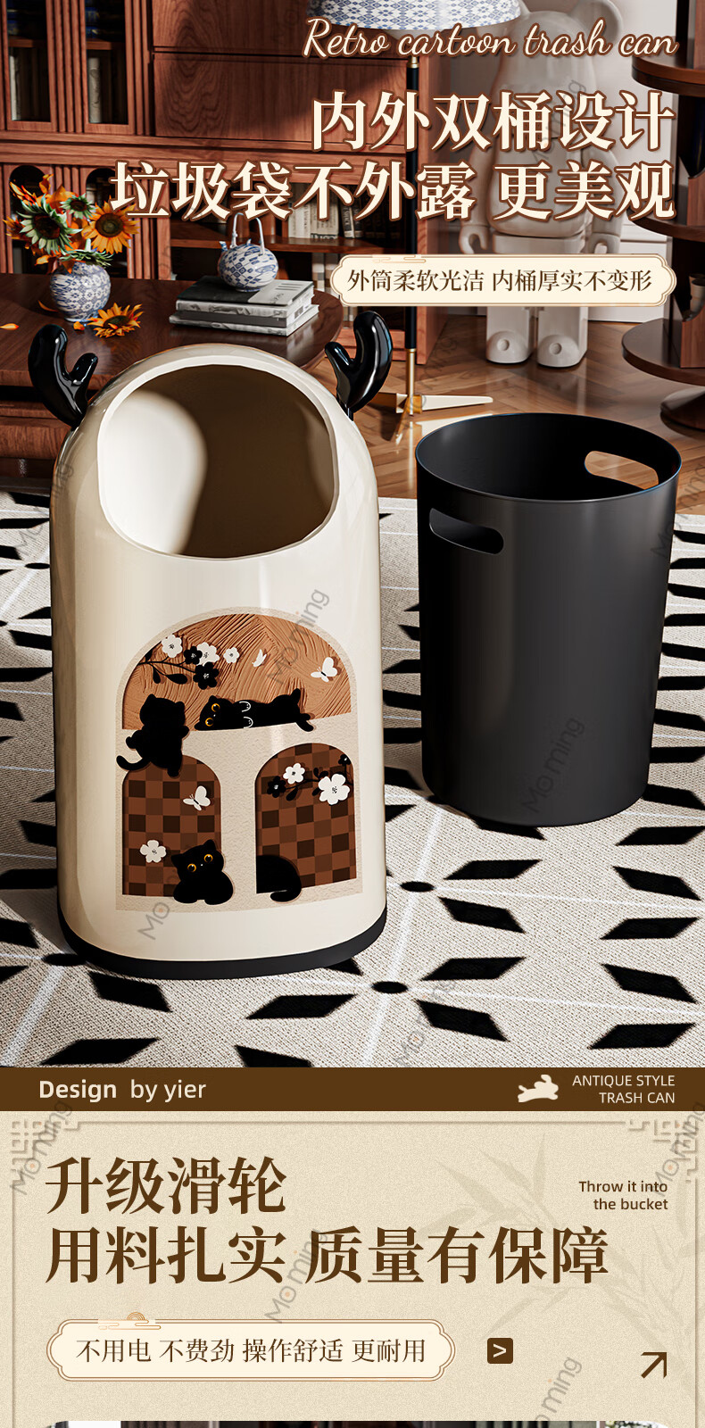 Moming deer antler trash can bathroom home living room antique style retro bedroom elegant trash can bedroom with wheels Elk ears window climbing cat large size - pulley version