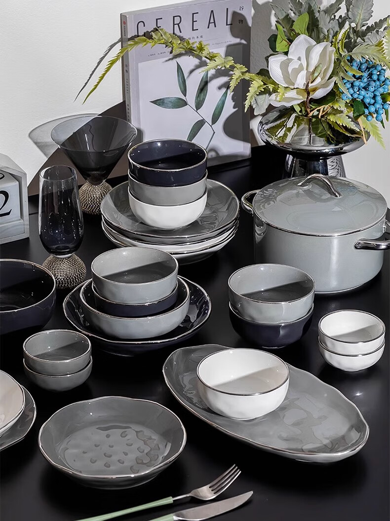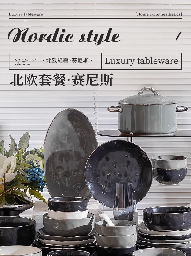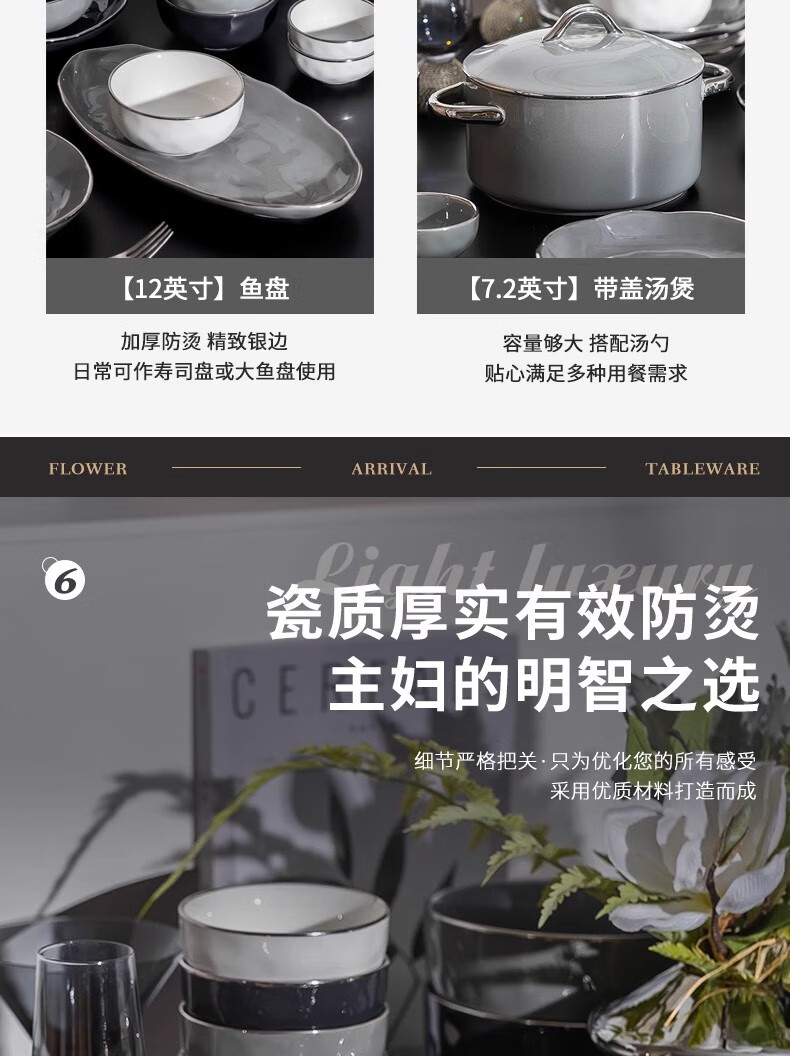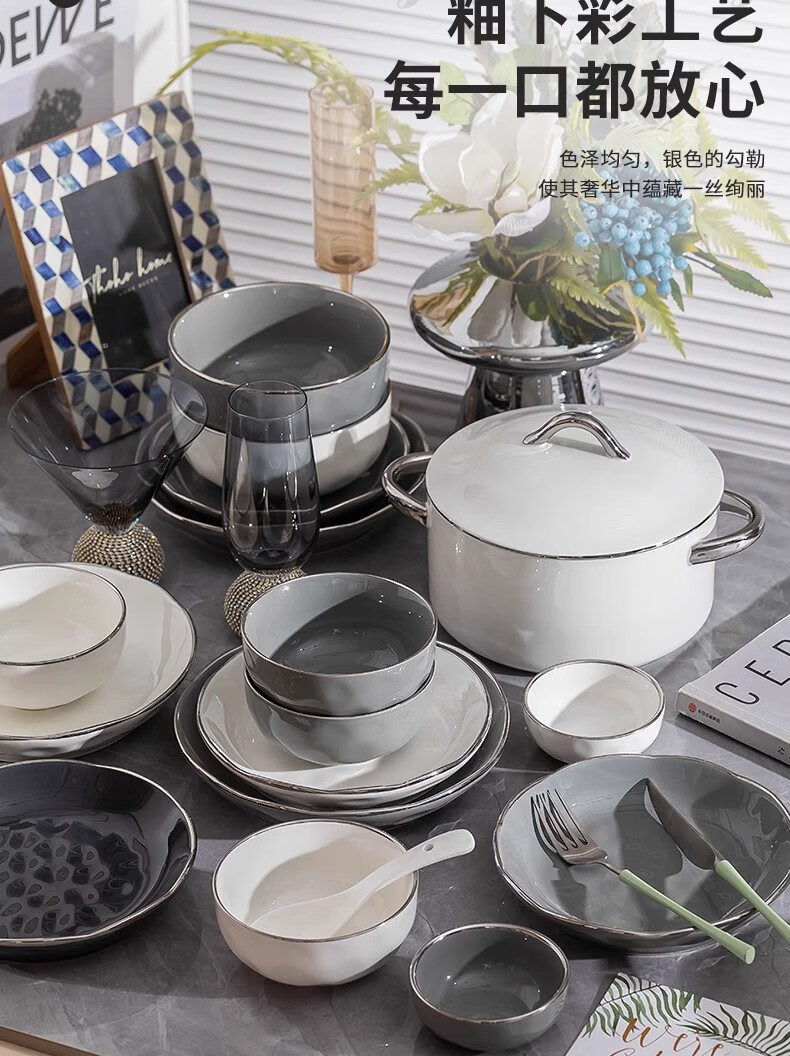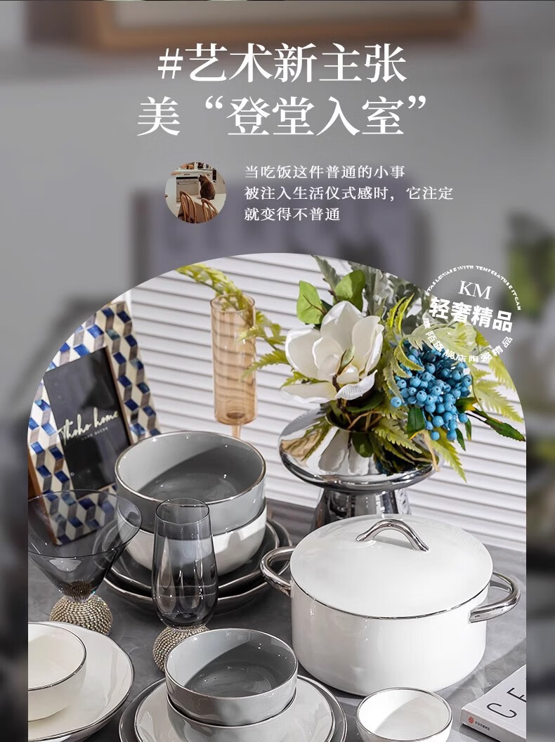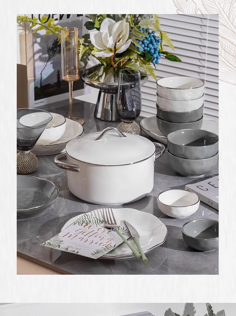 Hongye YOSELIE dish set household pure white light luxury high-end housewarming bowls and chopsticks high-end porcelain tableware Senis three-color 12-person meal with soup pot 58-piece set