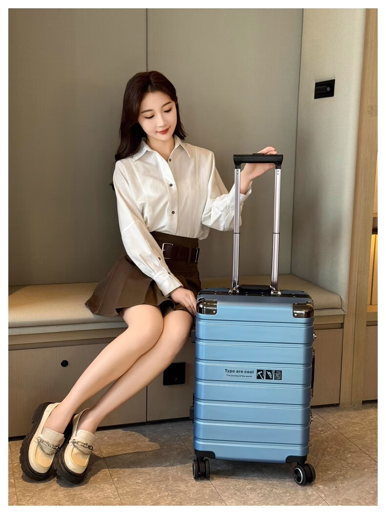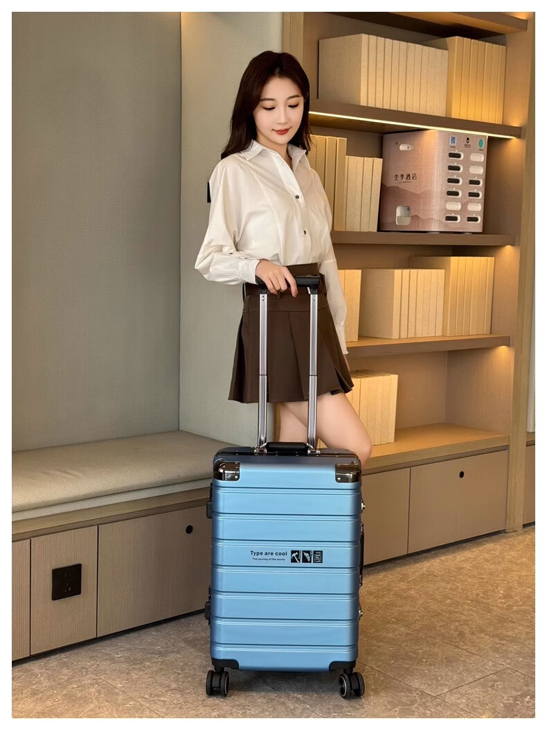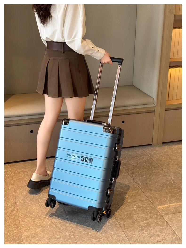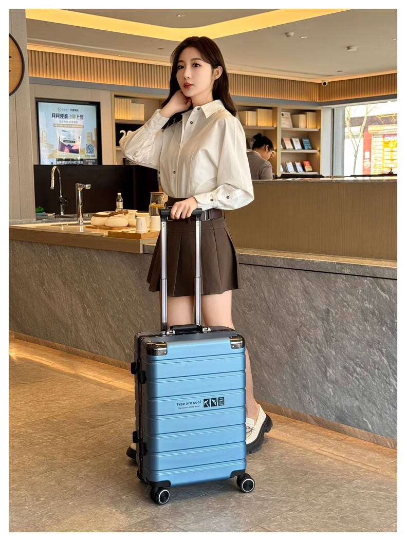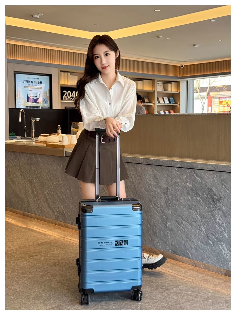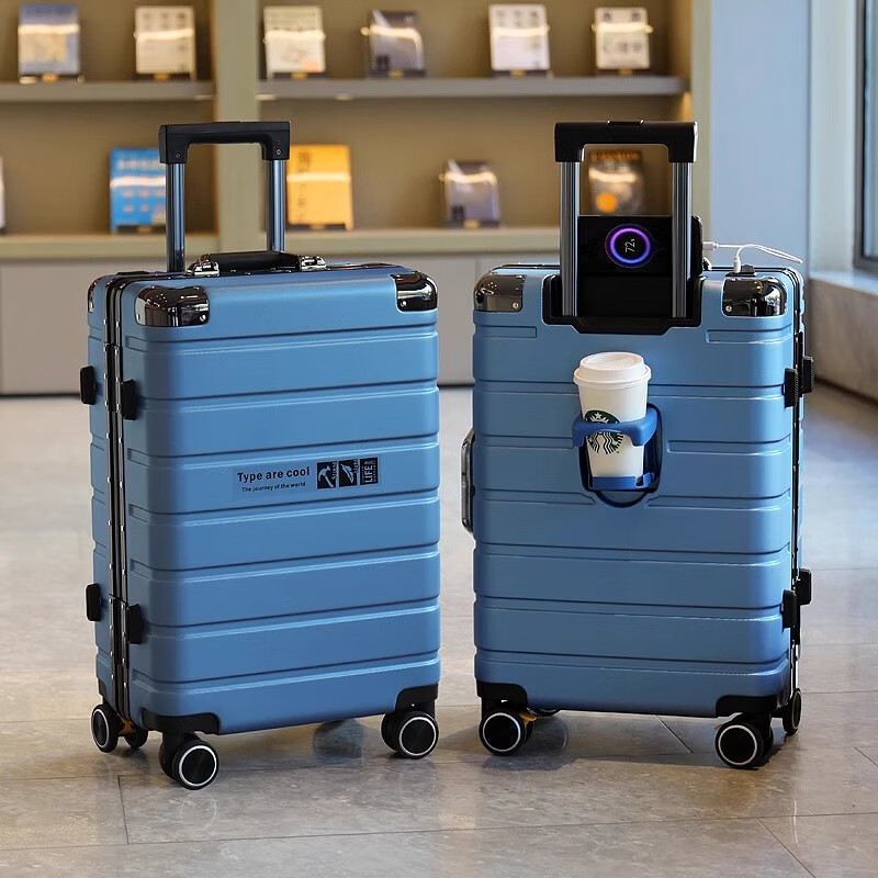 JCZS German quality 2025 new universal wheel boarding suitcase small password trolley case student suitcase lake blue noble aluminum frame + dry and wet separation inside + cup holder + charging port 20 inches