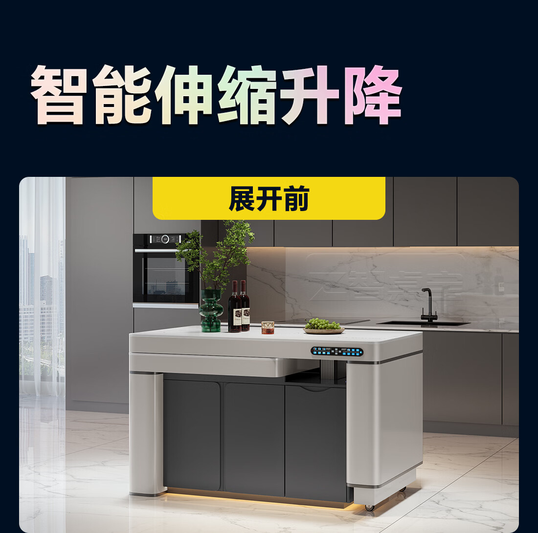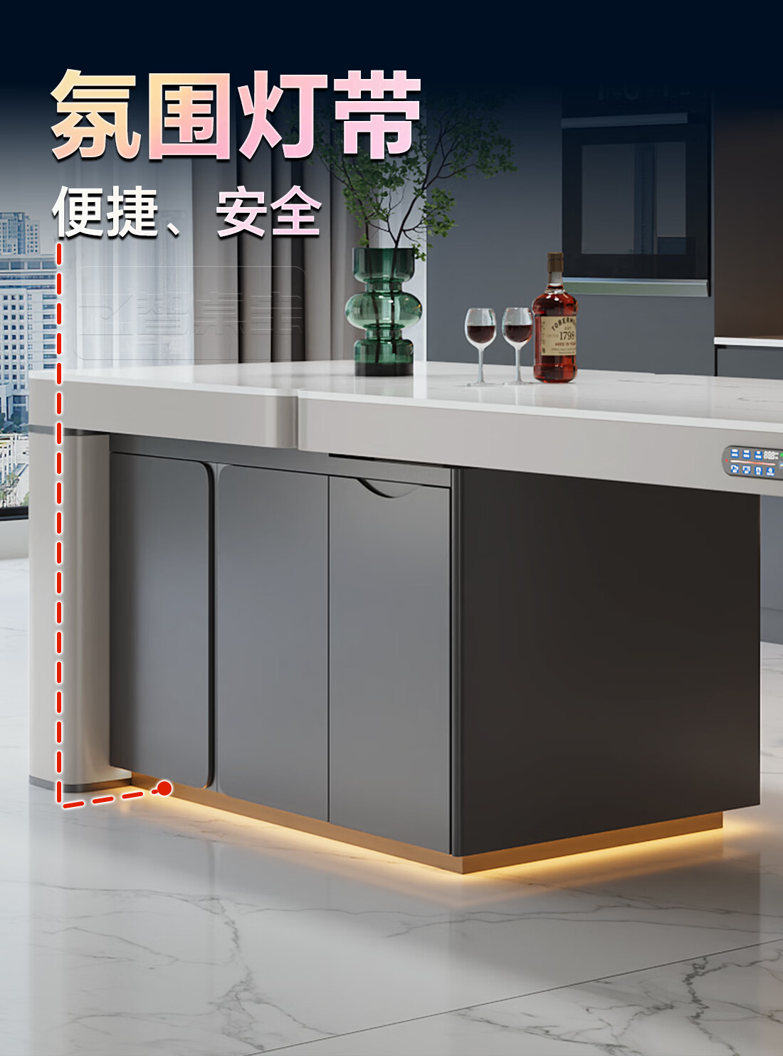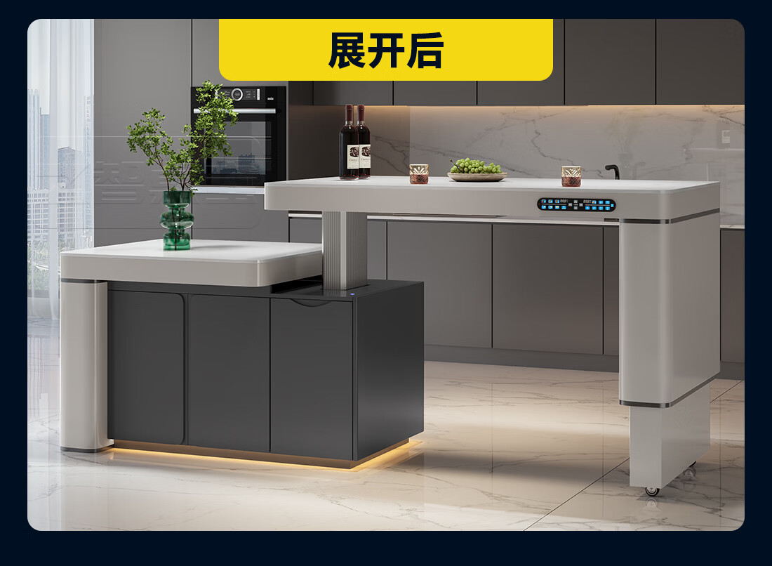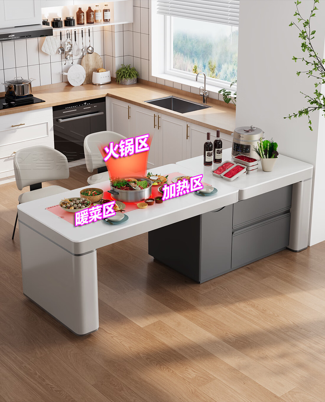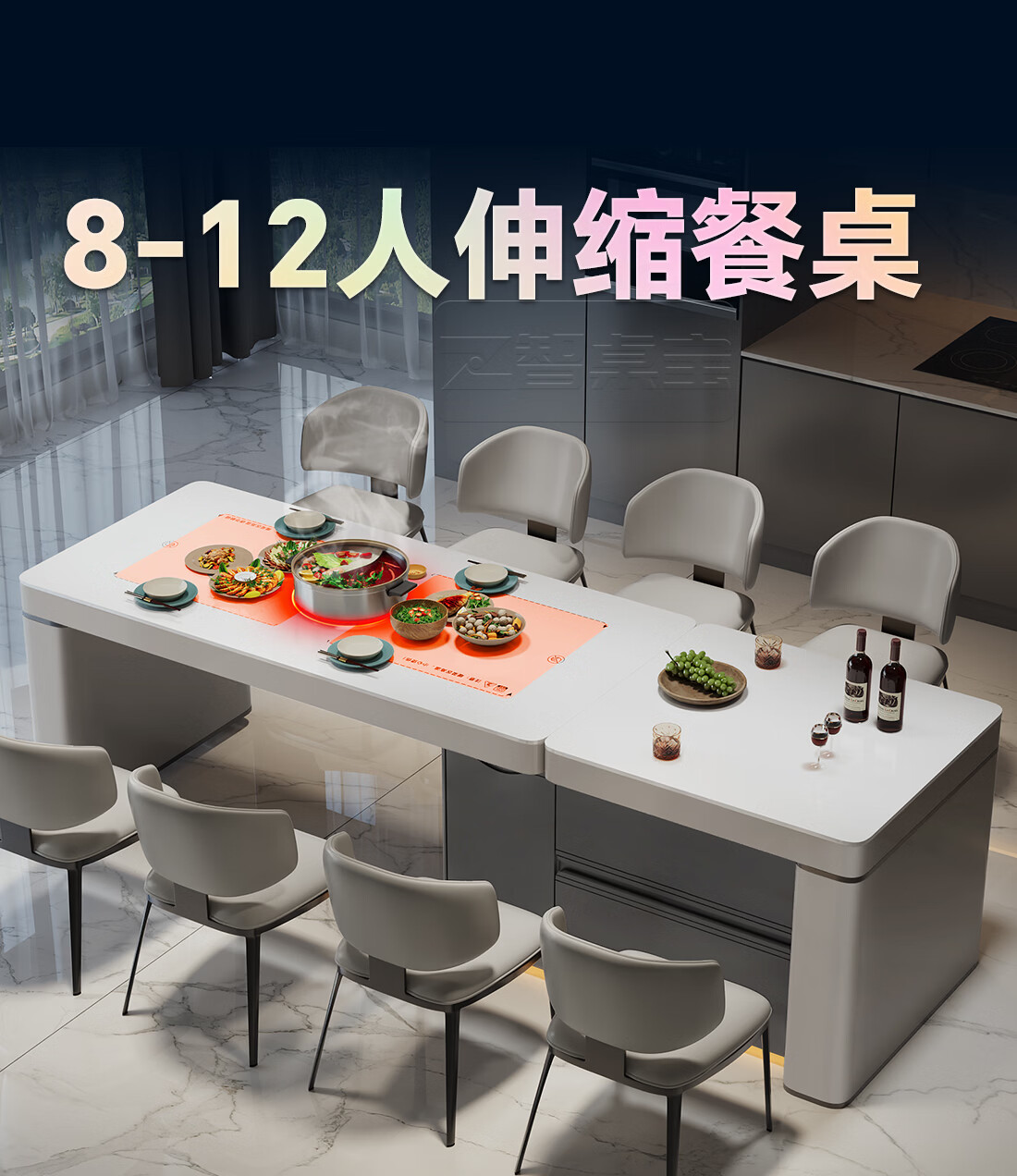 Smart table Baoqi flat island dining table integrated lifting and telescopic 2026 new center island kitchen multi-functional rock slab inverted dining table electric lifting telescopic + tabletop heating + 6 chairs 1.5 meters telescopic to 2.43 meters
