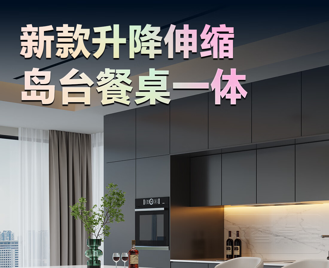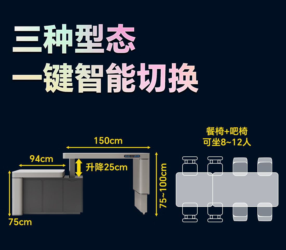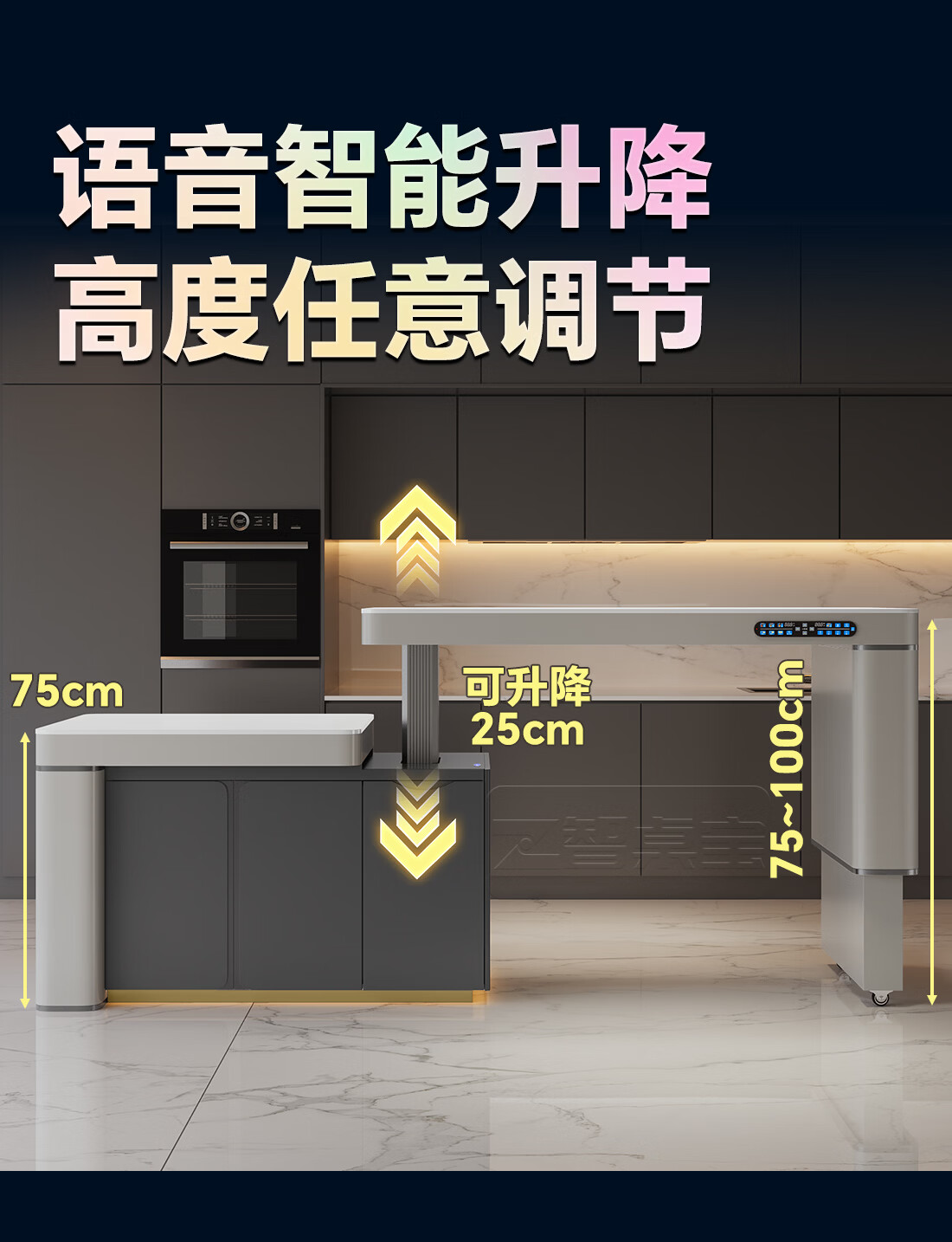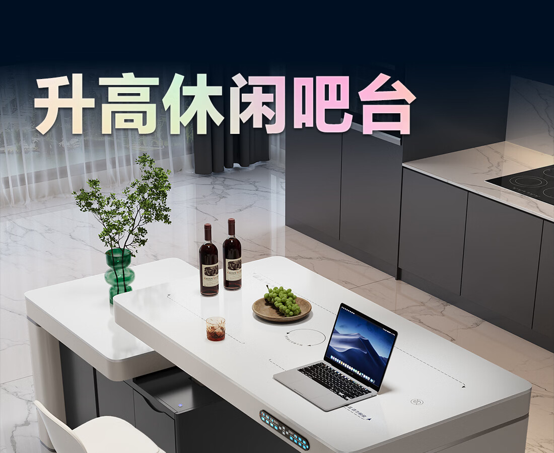 Smart table Baoqi flat island dining table integrated lifting and telescopic 2026 new center island kitchen multi-functional rock slab inverted dining table electric lifting telescopic + tabletop heating + 6 chairs 1.5 meters telescopic to 2.43 meters
