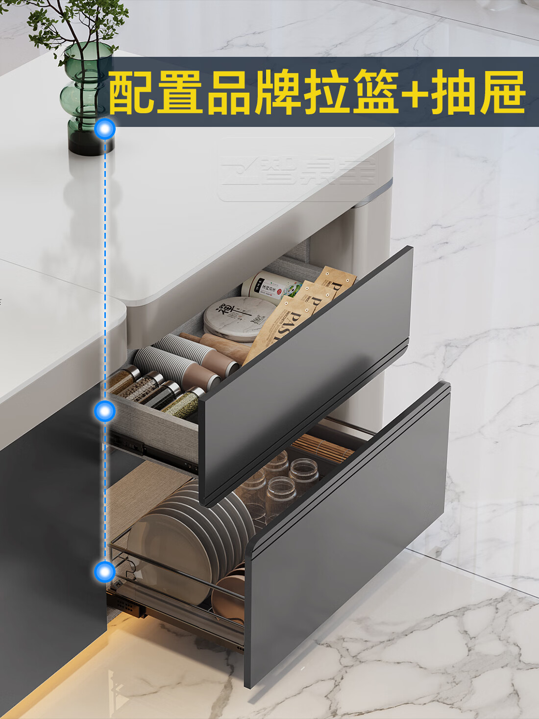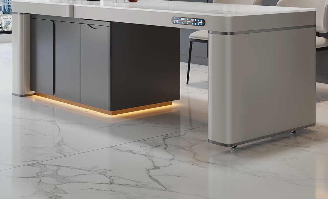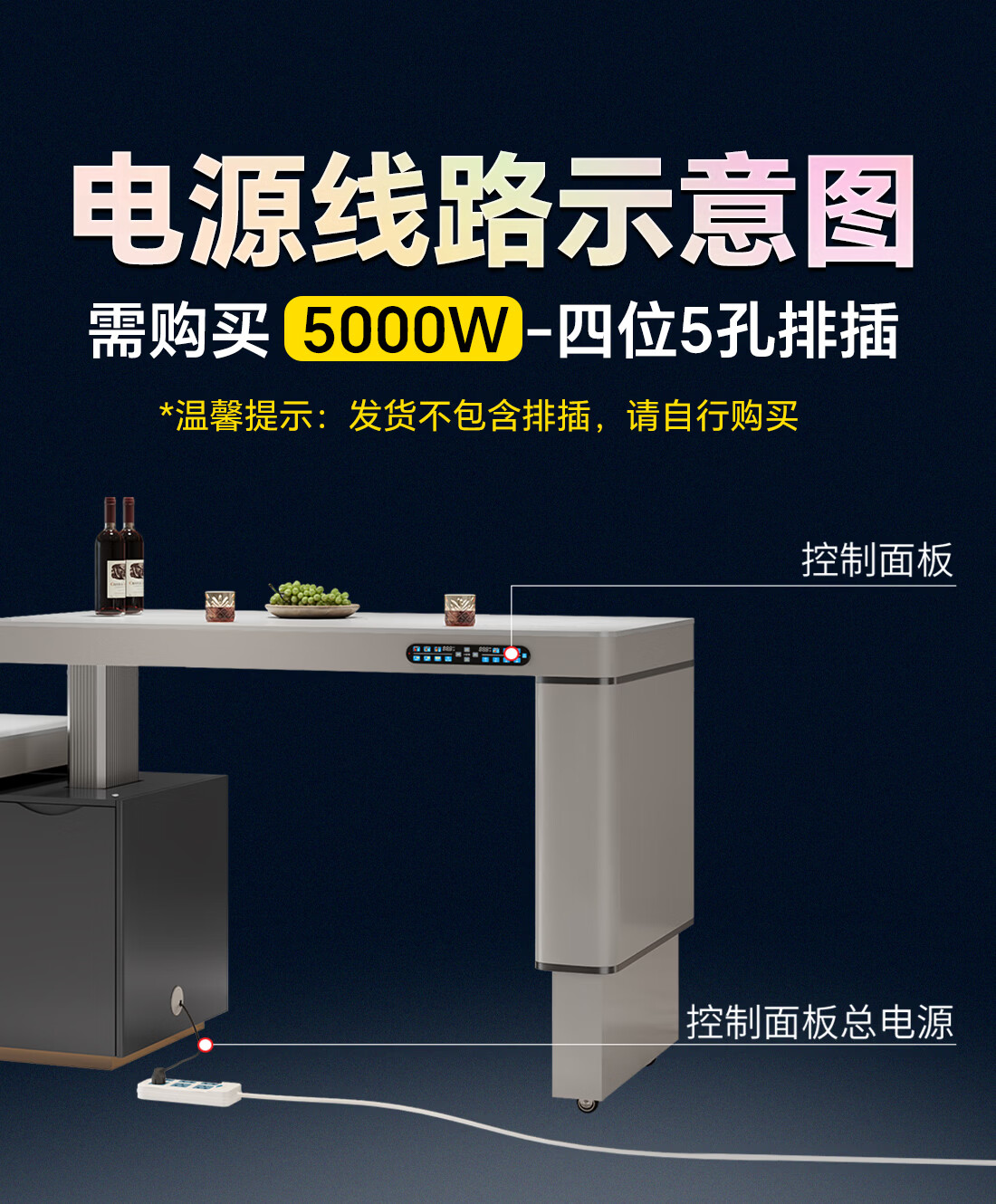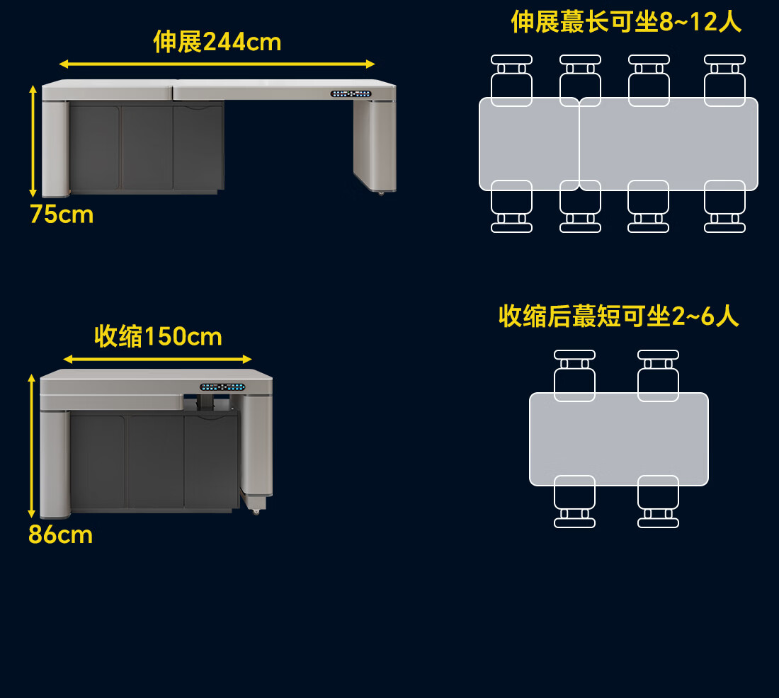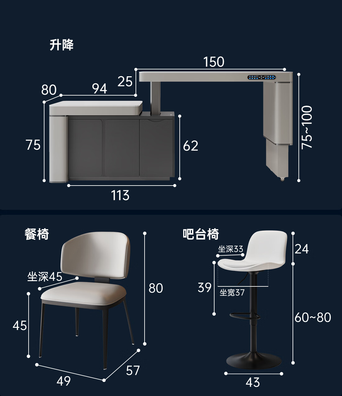 Smart table Baoqi flat island dining table integrated lifting and telescopic 2026 new center island kitchen multi-functional rock slab inverted dining table electric lifting telescopic + tabletop heating + 6 chairs 1.5 meters telescopic to 2.43 meters