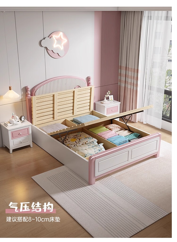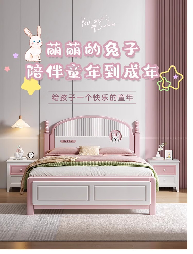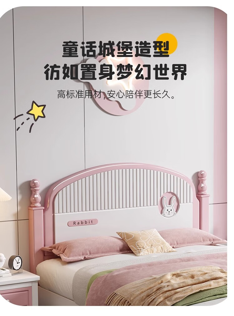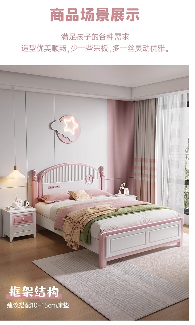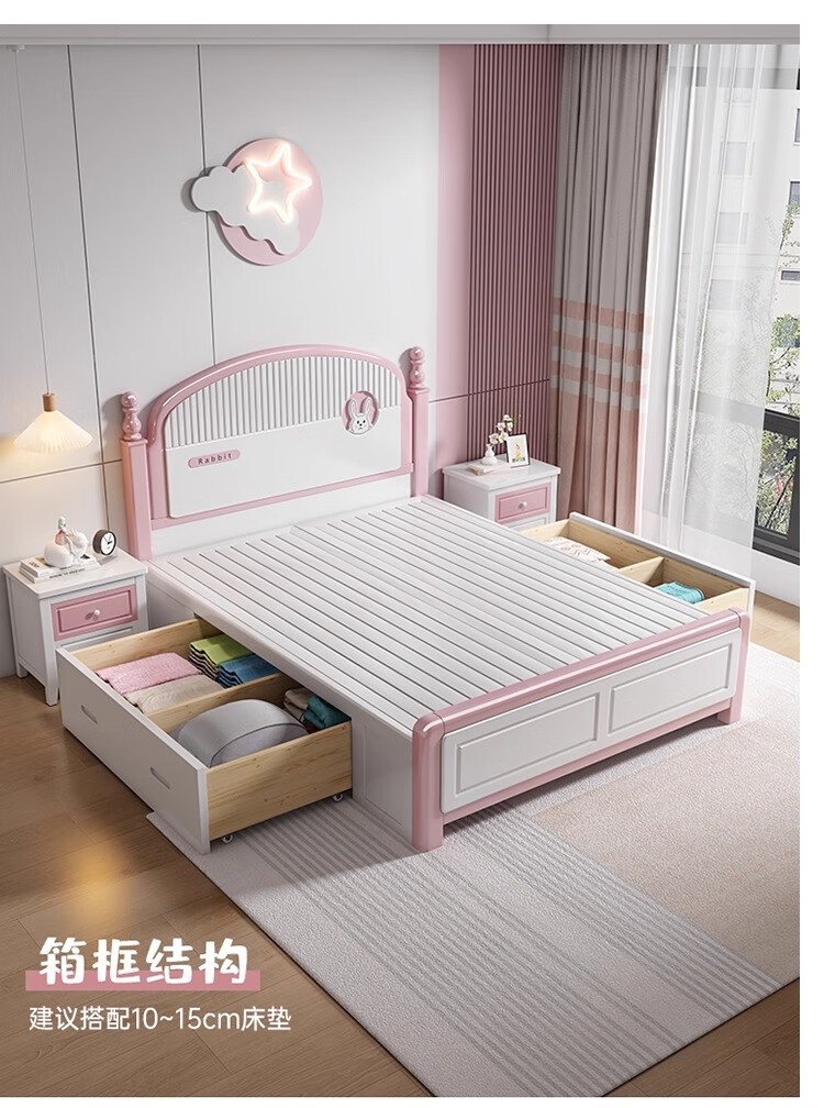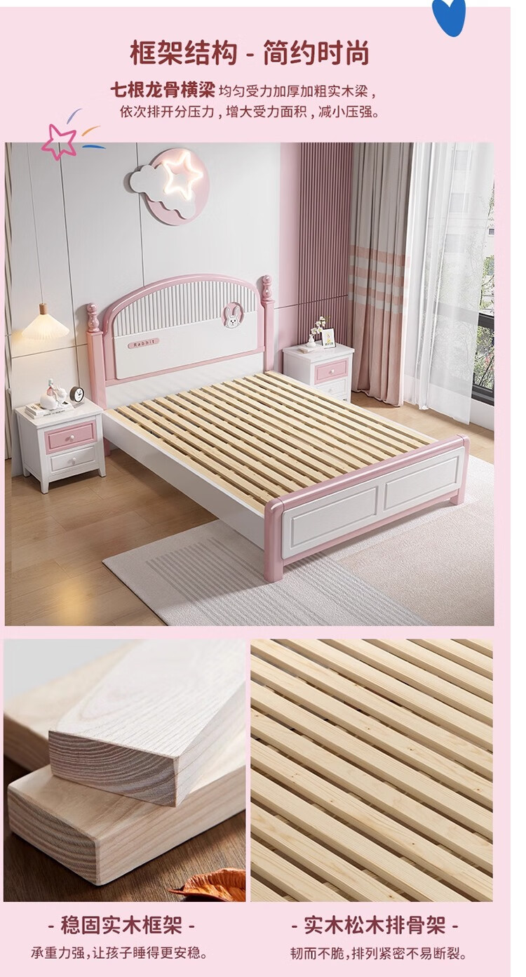 Oka Star solid wood children's bed 1.2m1.5m pink girl princess bed baby girl bedroom furniture cute single bed bed+20cm latex spring mattress+bedside table*2 1500*1900