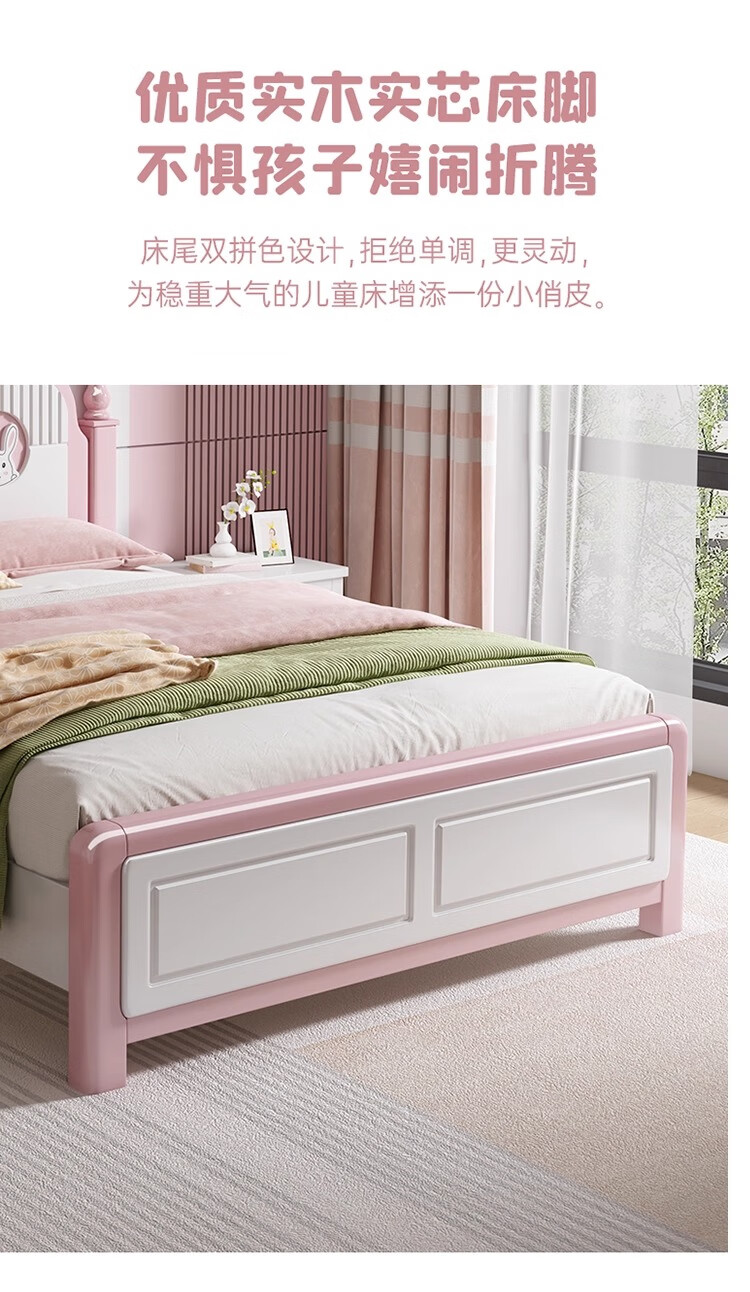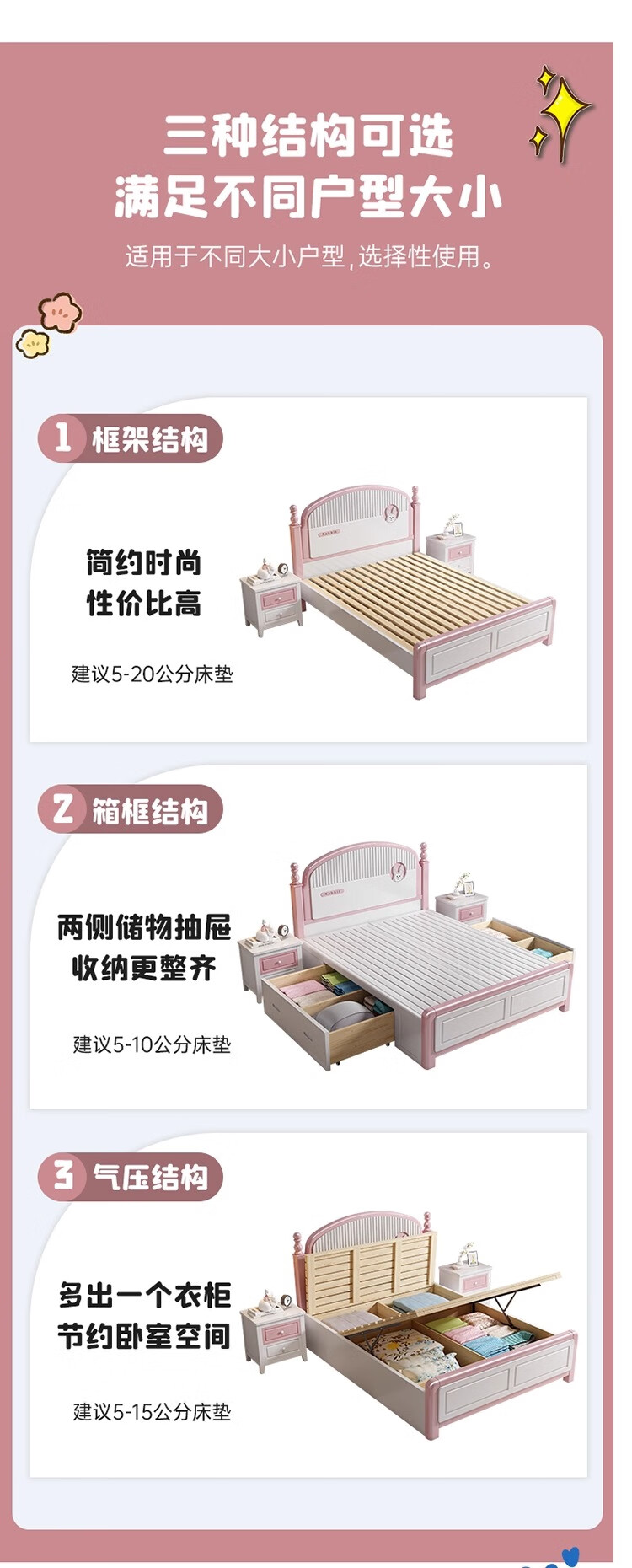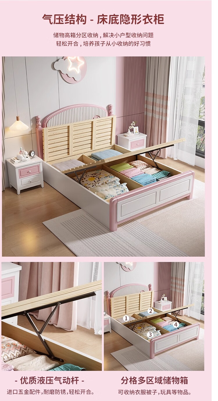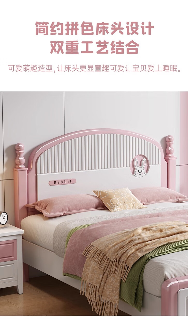 Oka Star solid wood children's bed 1.2m1.5m pink girl princess bed baby girl bedroom furniture cute single bed bed+20cm latex spring mattress+bedside table*2 1500*1900