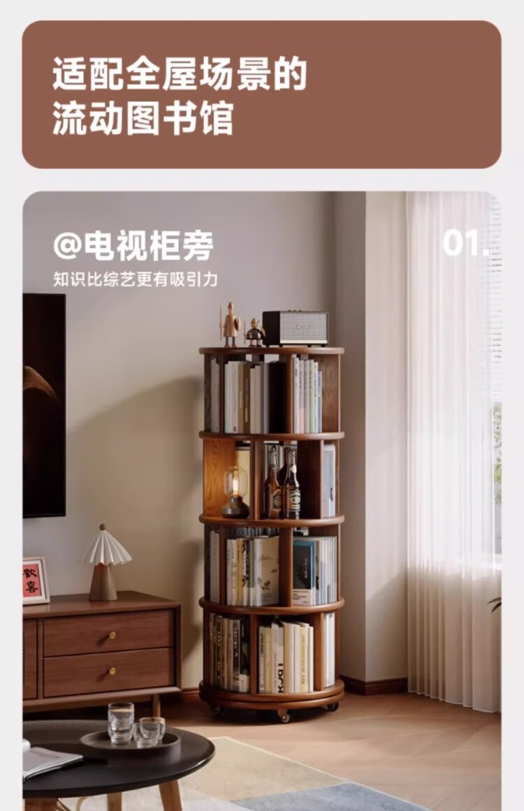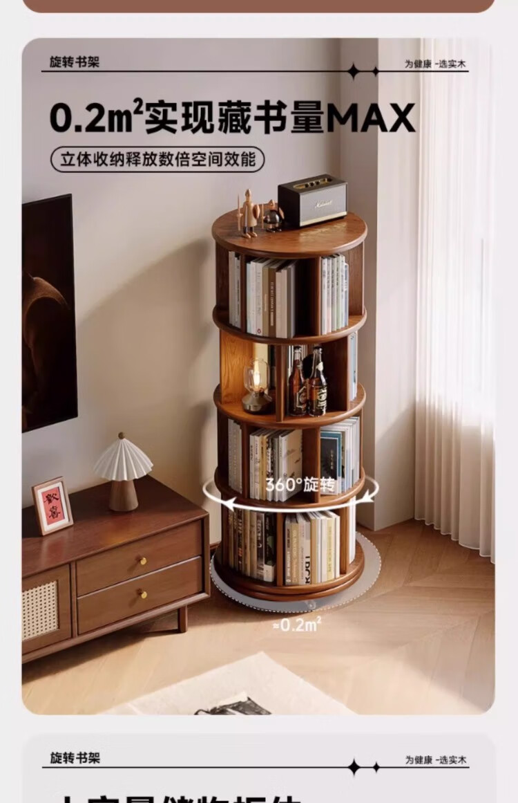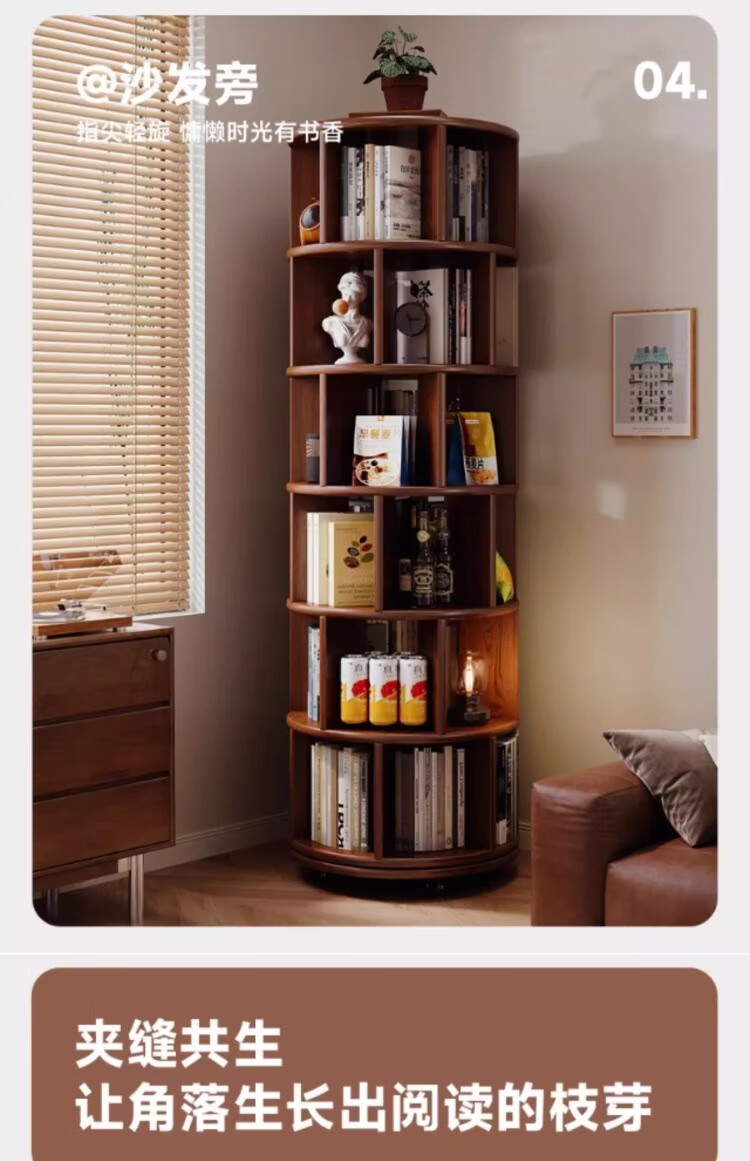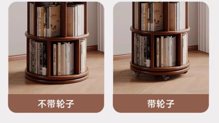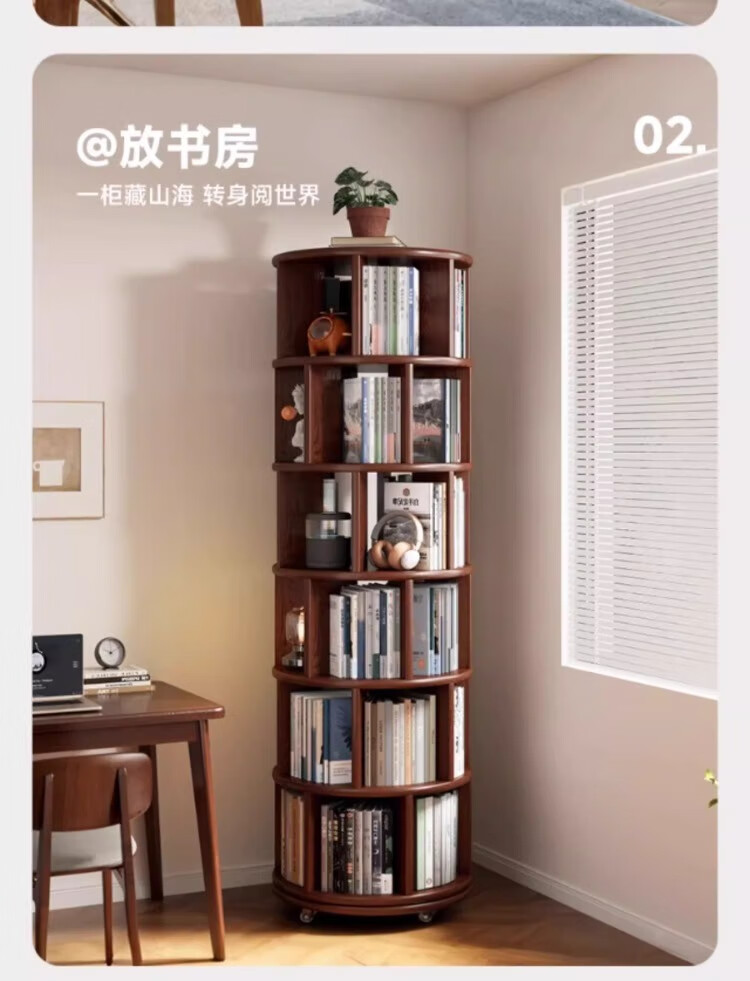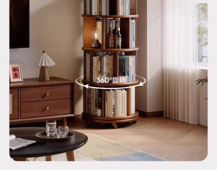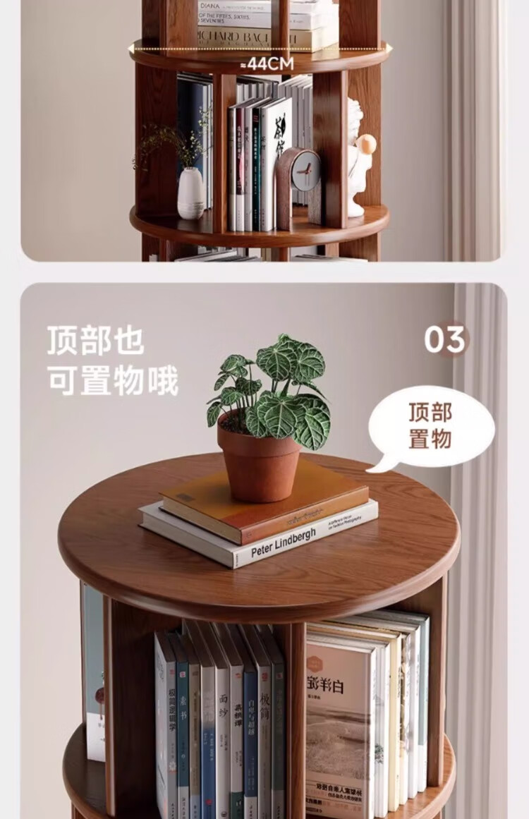 Rotating bookshelf 360 degree bookcase floor-standing storage cabinet household storage rack solid wood movable bedside cabinet thickened 15MM pine | walnut color 44*44*103