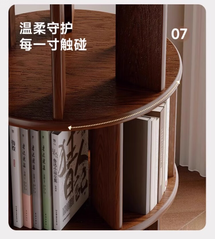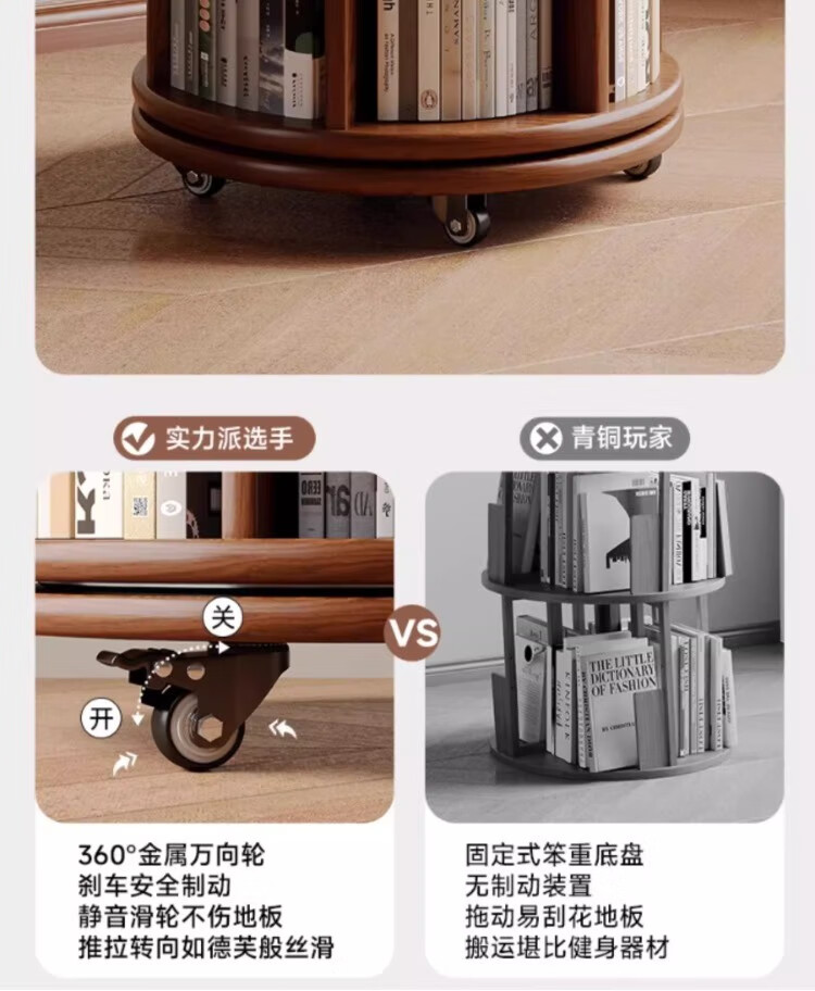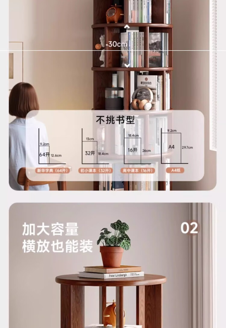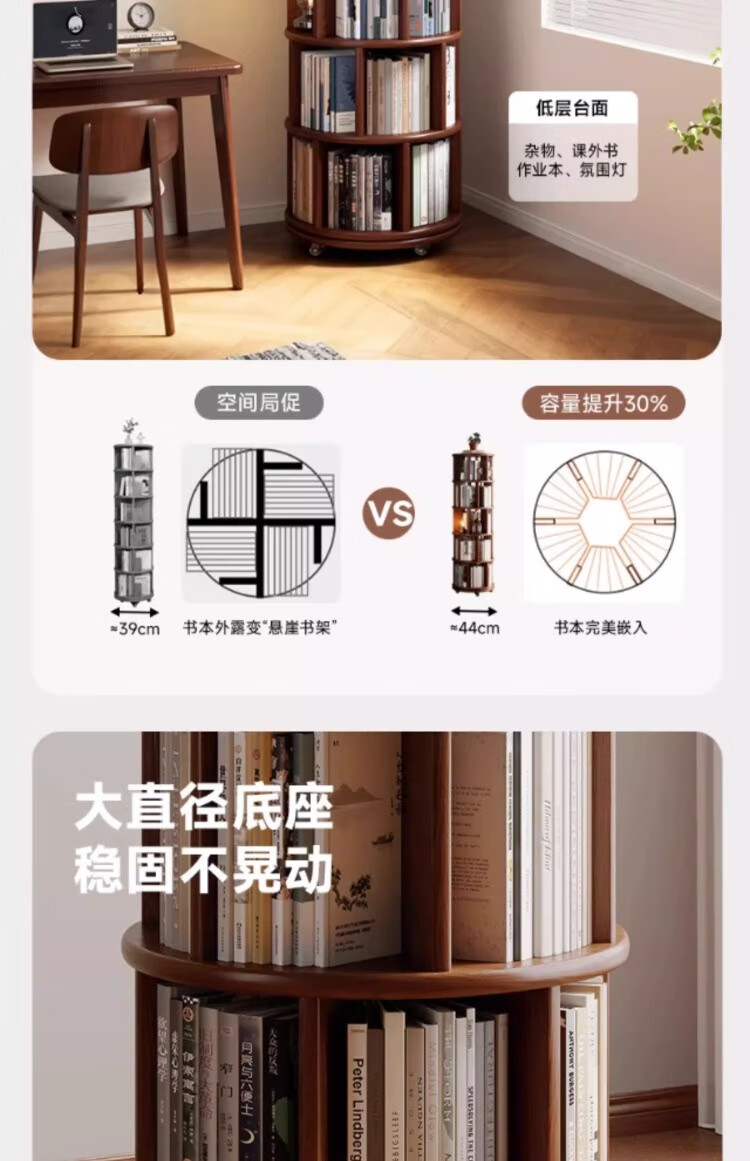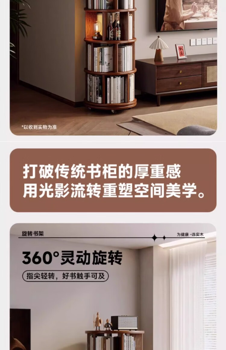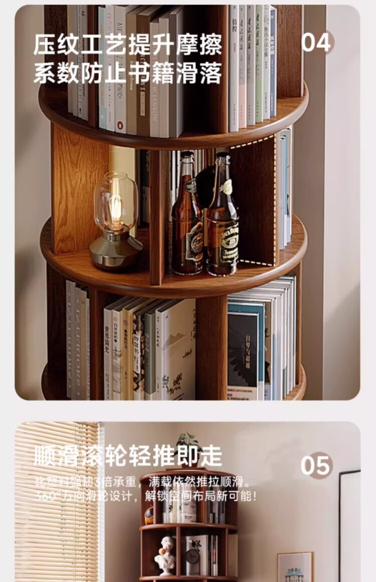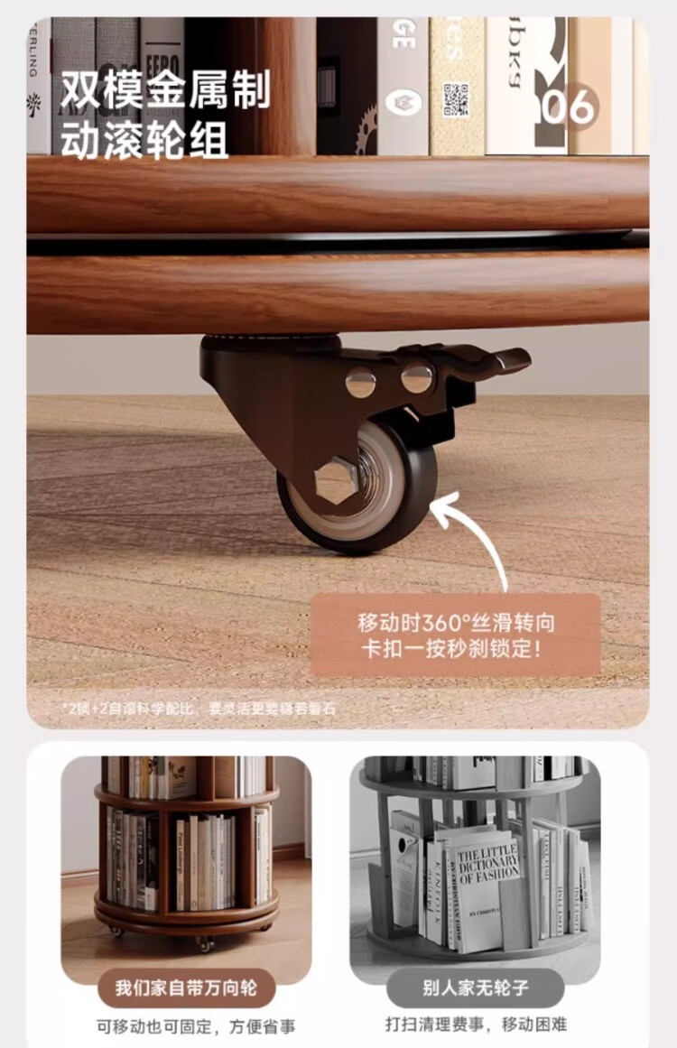 Rotating bookshelf 360 degree bookcase floor-standing storage cabinet household storage rack solid wood movable bedside cabinet thickened 15MM pine | walnut color 44*44*103