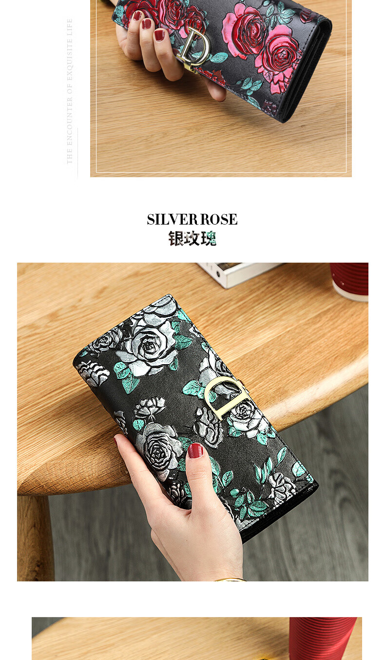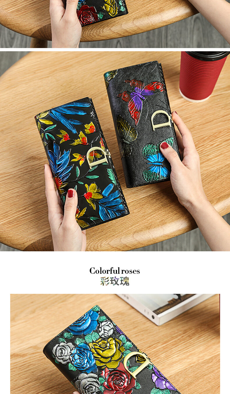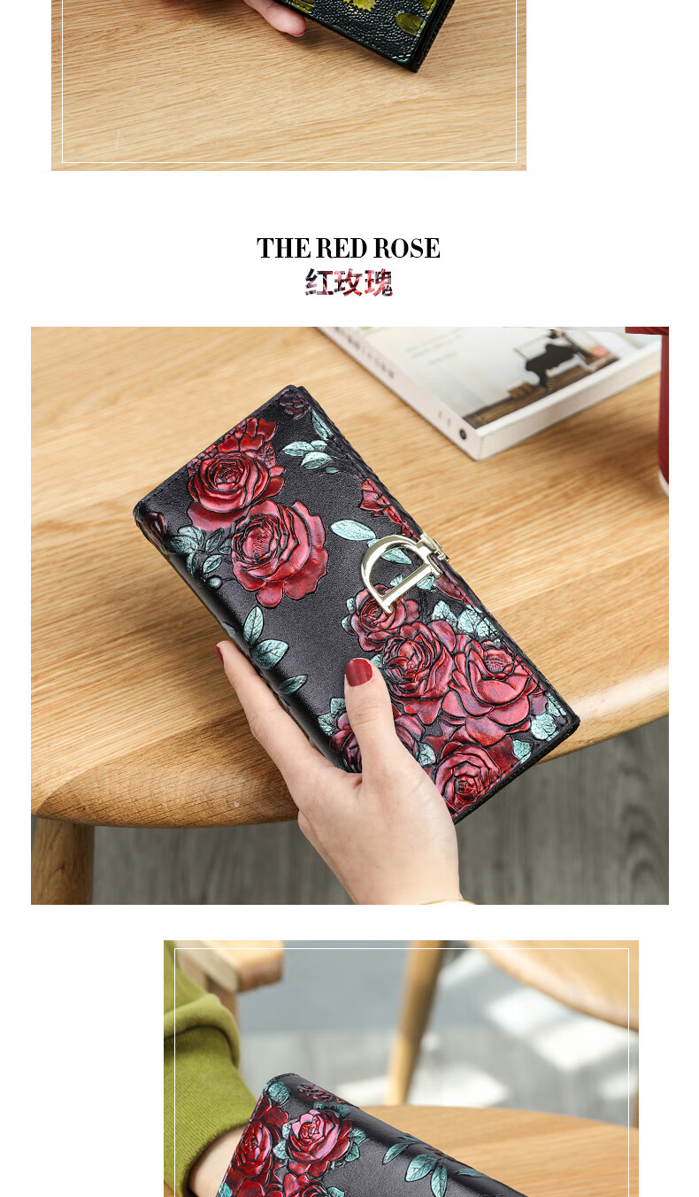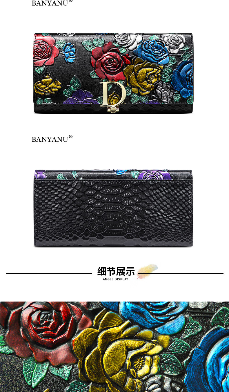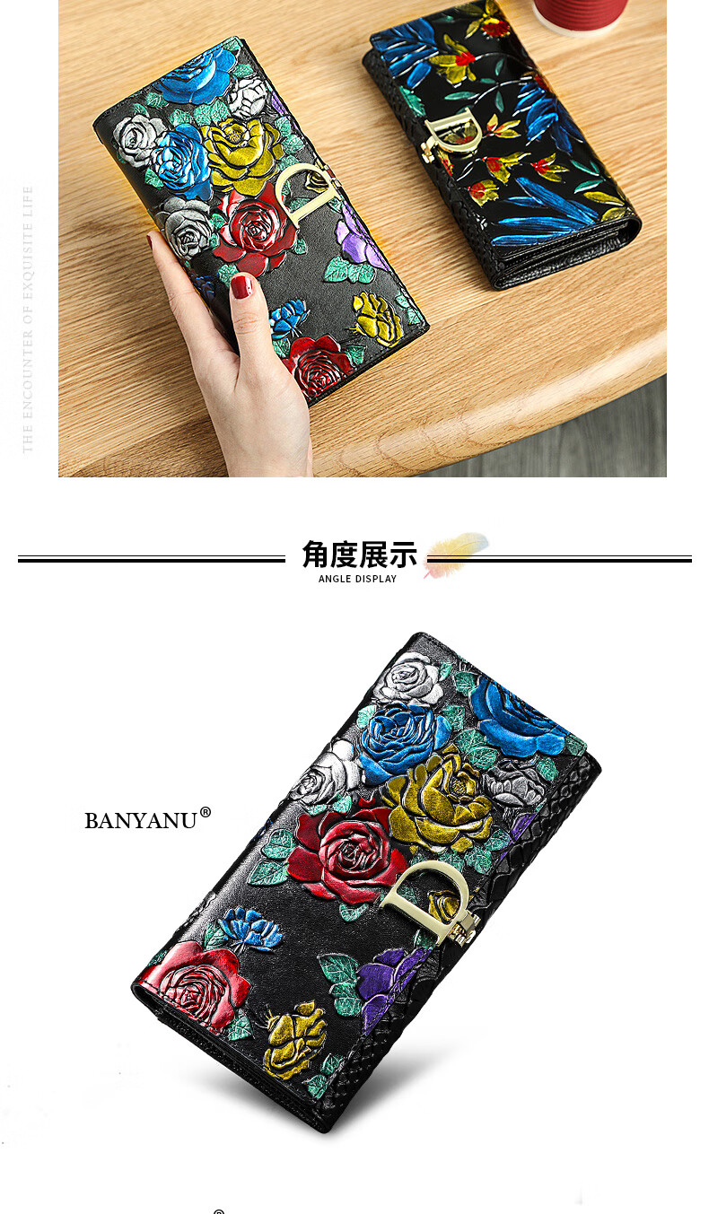 Banyanu New Product 2025 New Women's Wallet Women's Long D-Buckle Large Capacity Personalized Painted Women's Cowhide Wallet Color Rose-Anti-Theft Brush