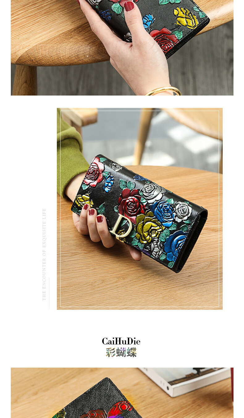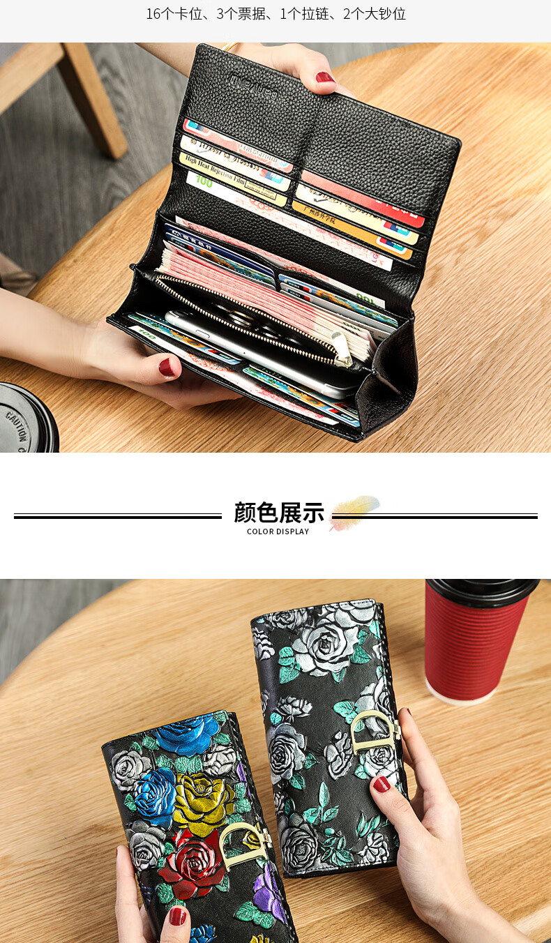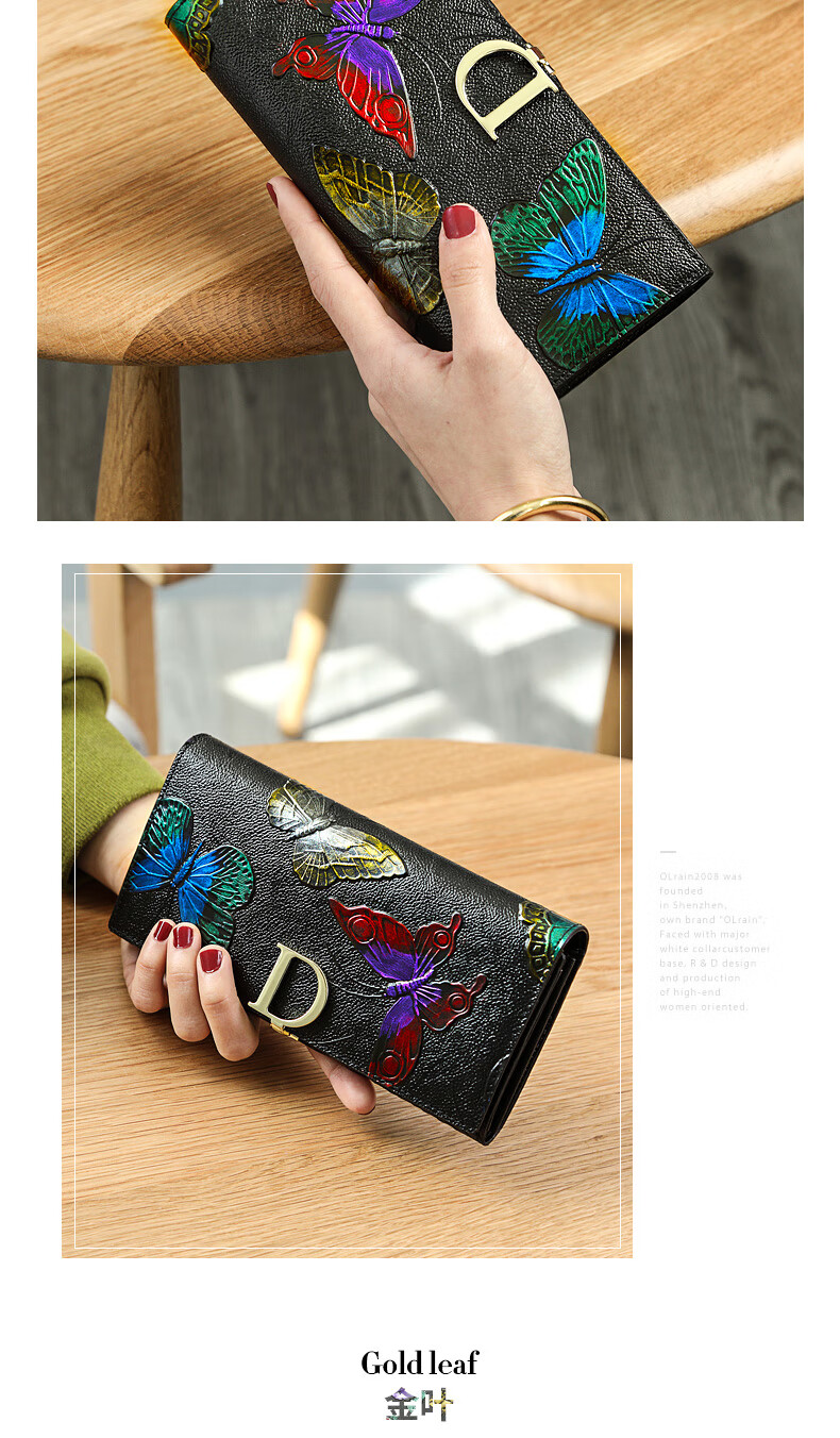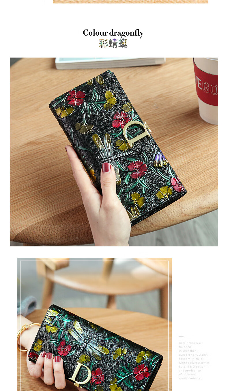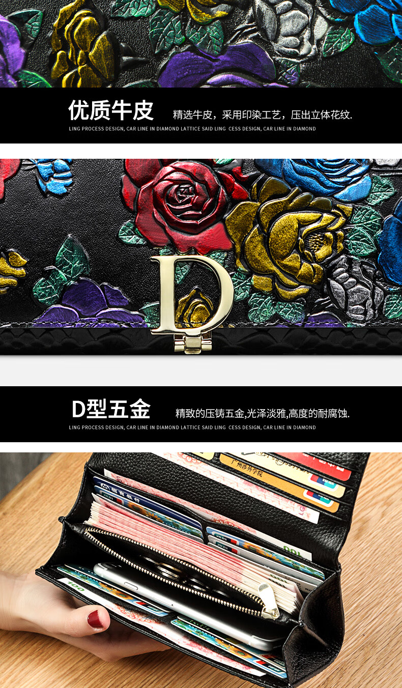 Banyanu New Product 2025 New Women's Wallet Women's Long D-Buckle Large Capacity Personalized Painted Women's Cowhide Wallet Color Rose-Anti-Theft Brush