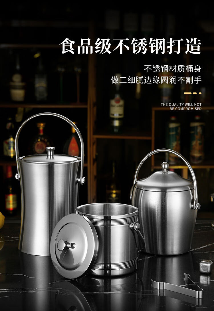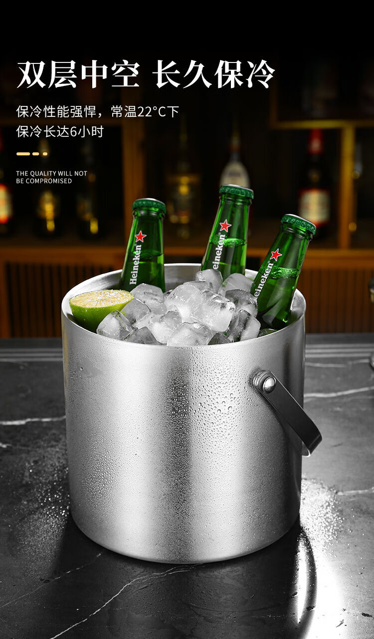 Huili's thickened double-layer stainless steel ice bucket, champagne bucket, red wine bucket, ice beer bucket, ice grain bucket, bar KTV insulation bucket, 1.2L binaural drum-shaped bright light, free ice clip