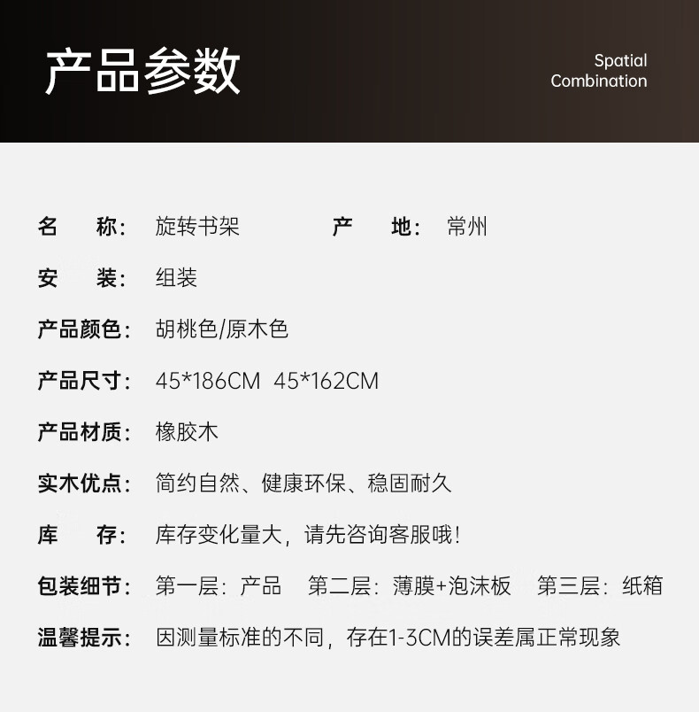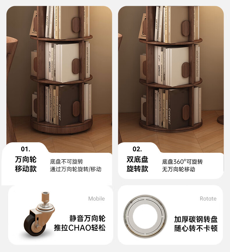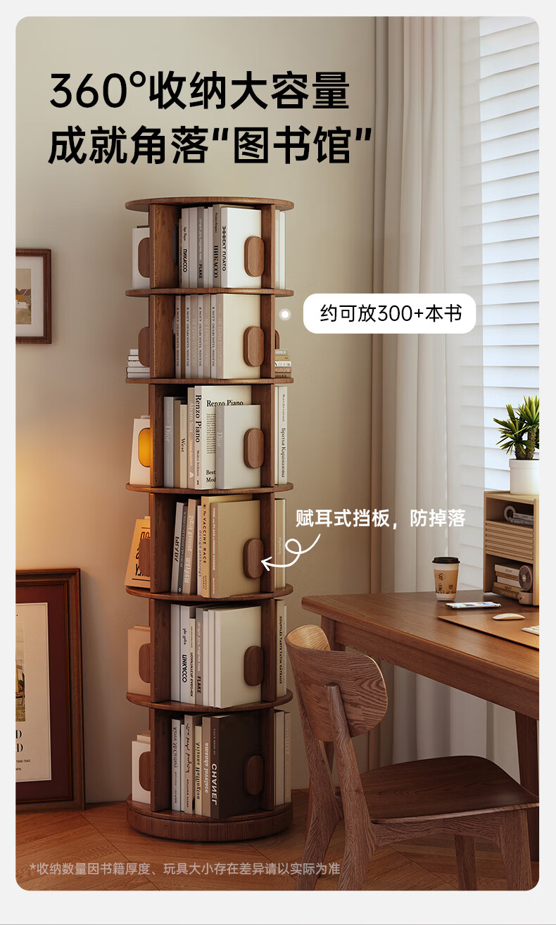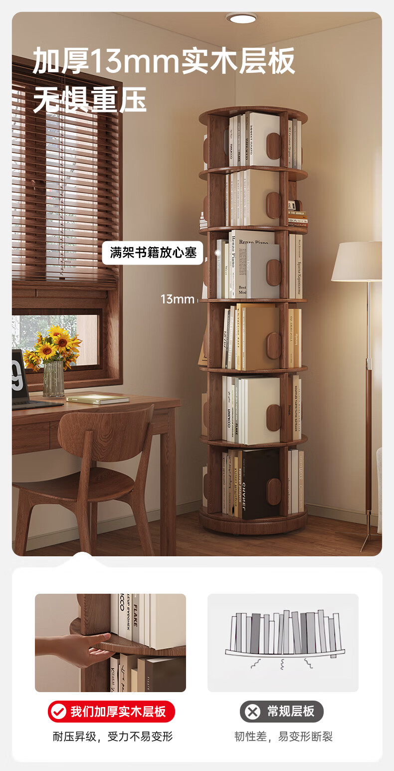 Gujia Home solid wood rotating bookshelf 360 degree bookcase movable home study corner bookshelf storage rack multi-layer storage rack recommended upgraded five-star texture + imported FAS grade rubber wood 6-layer mobile walnut color Gujia brand carefully selected | free door-to-door delivery + installation included