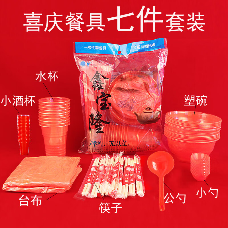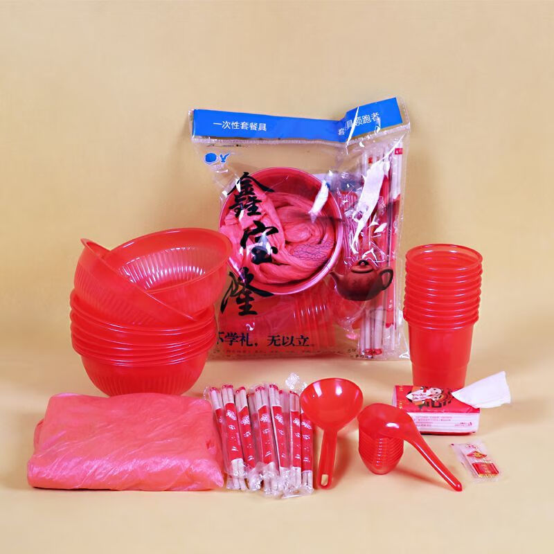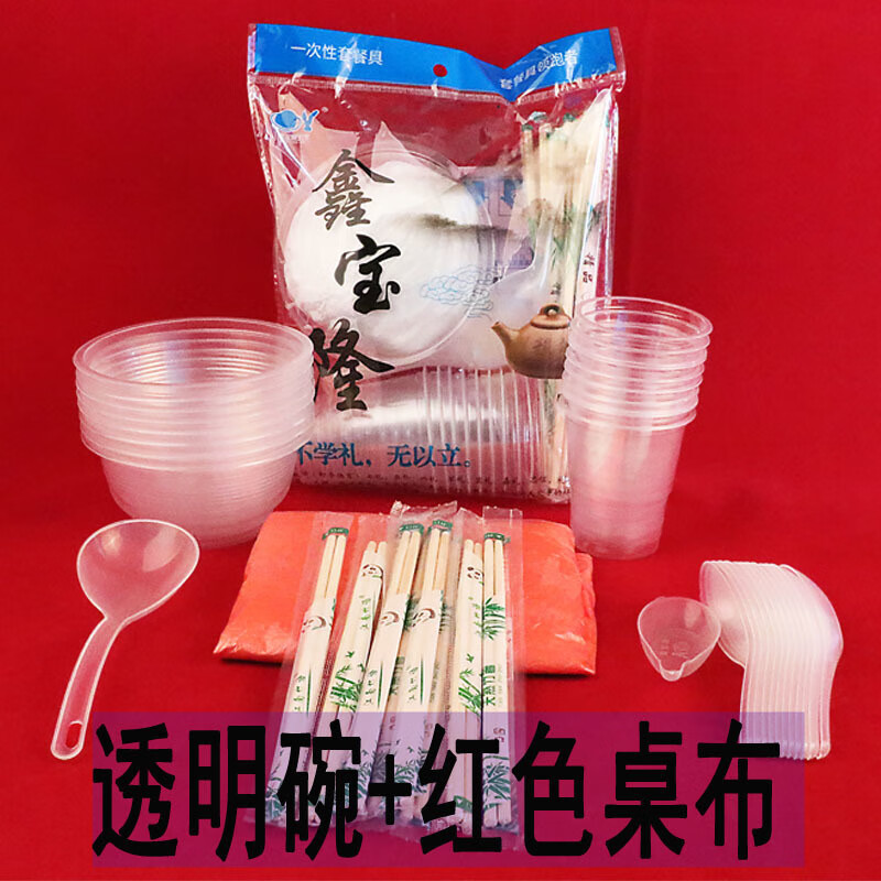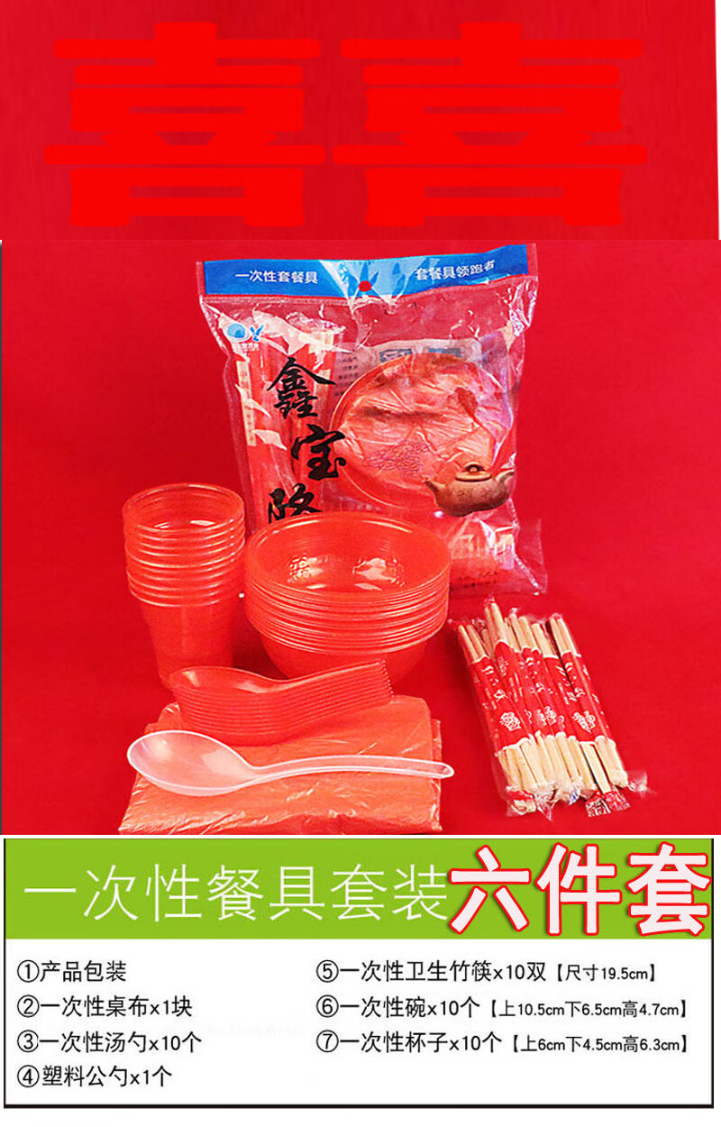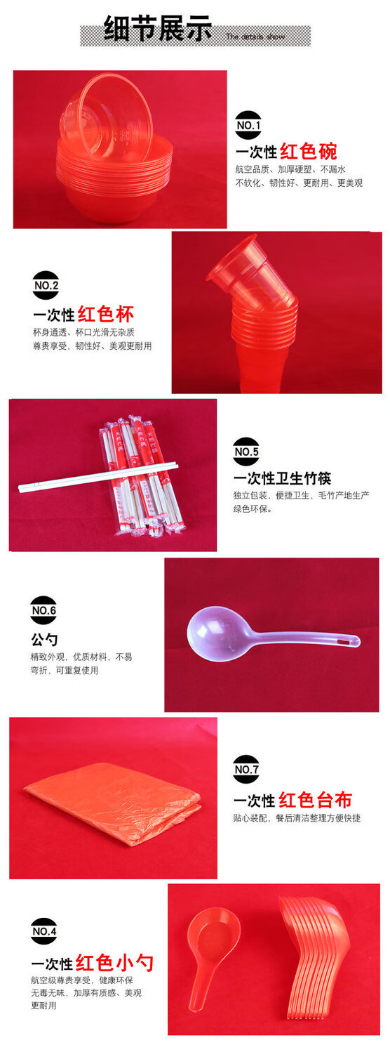 Vinoa disposable bowls, chopsticks, cups and tableware for wine and wedding banquets, wedding set, complete set of thickened banquet tableware for 10 people, red 10-person bowl + chopsticks + cup + spoon + male spoon + tablecloth + 15 tables of wedding banquet special tableware